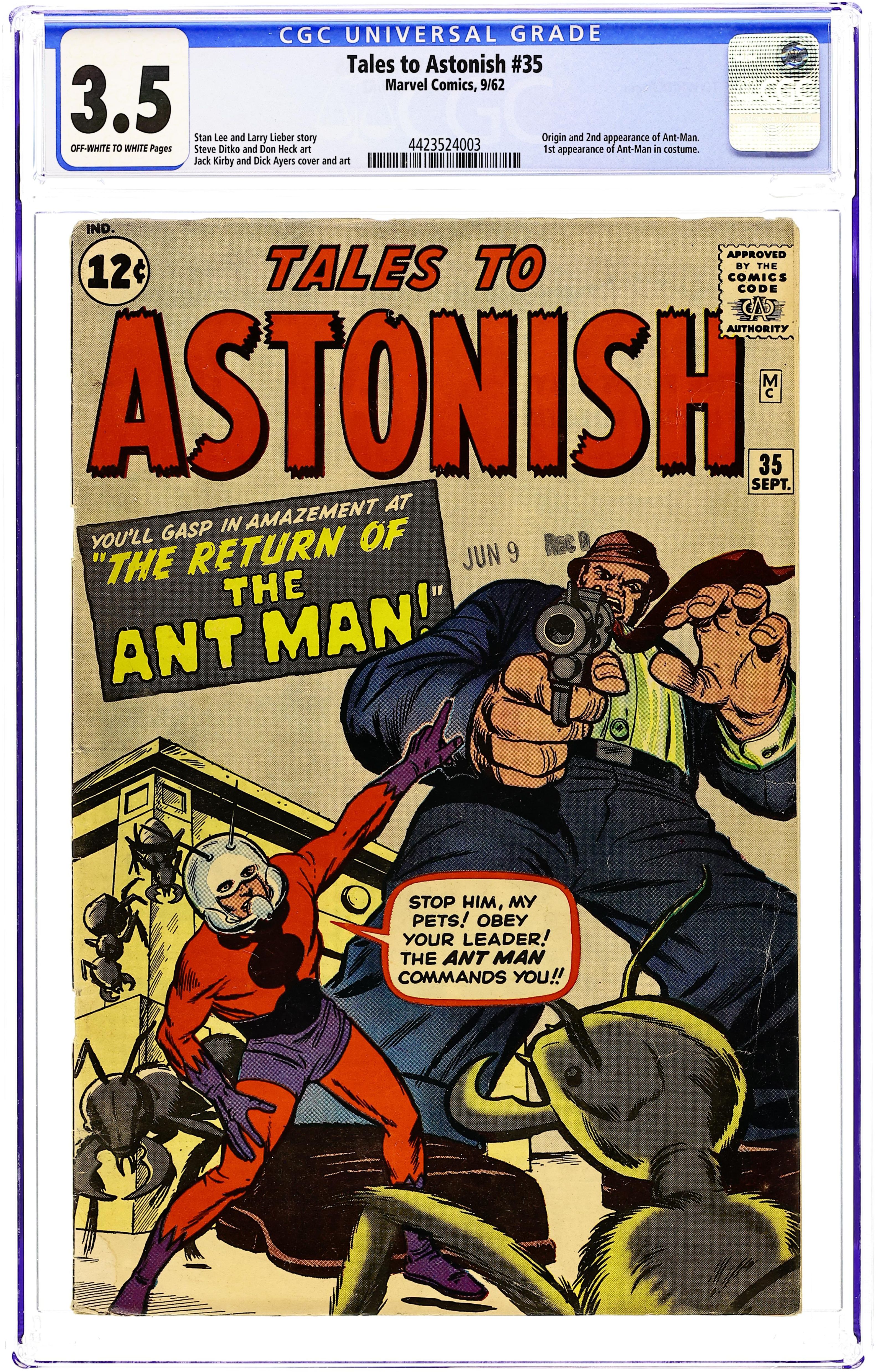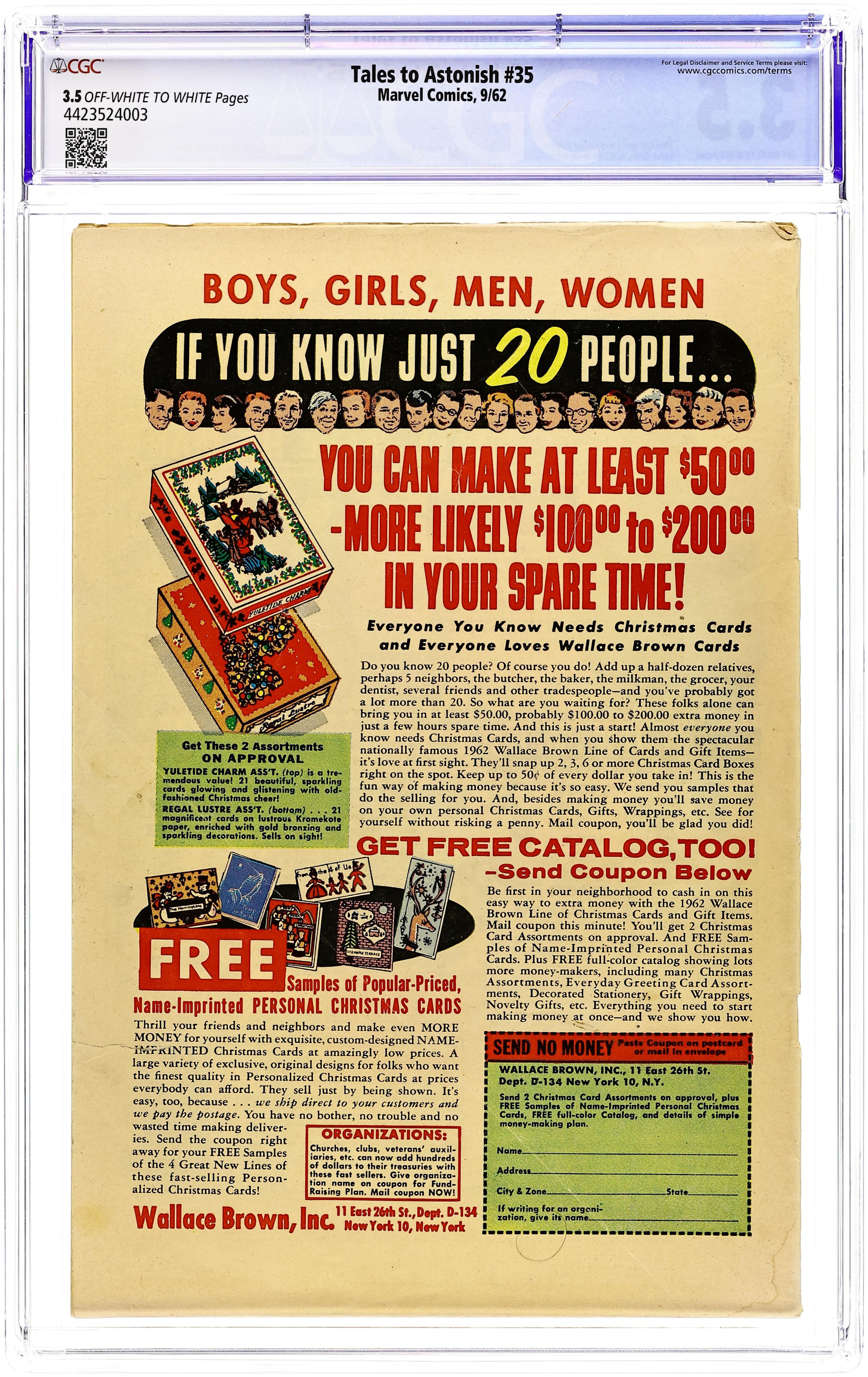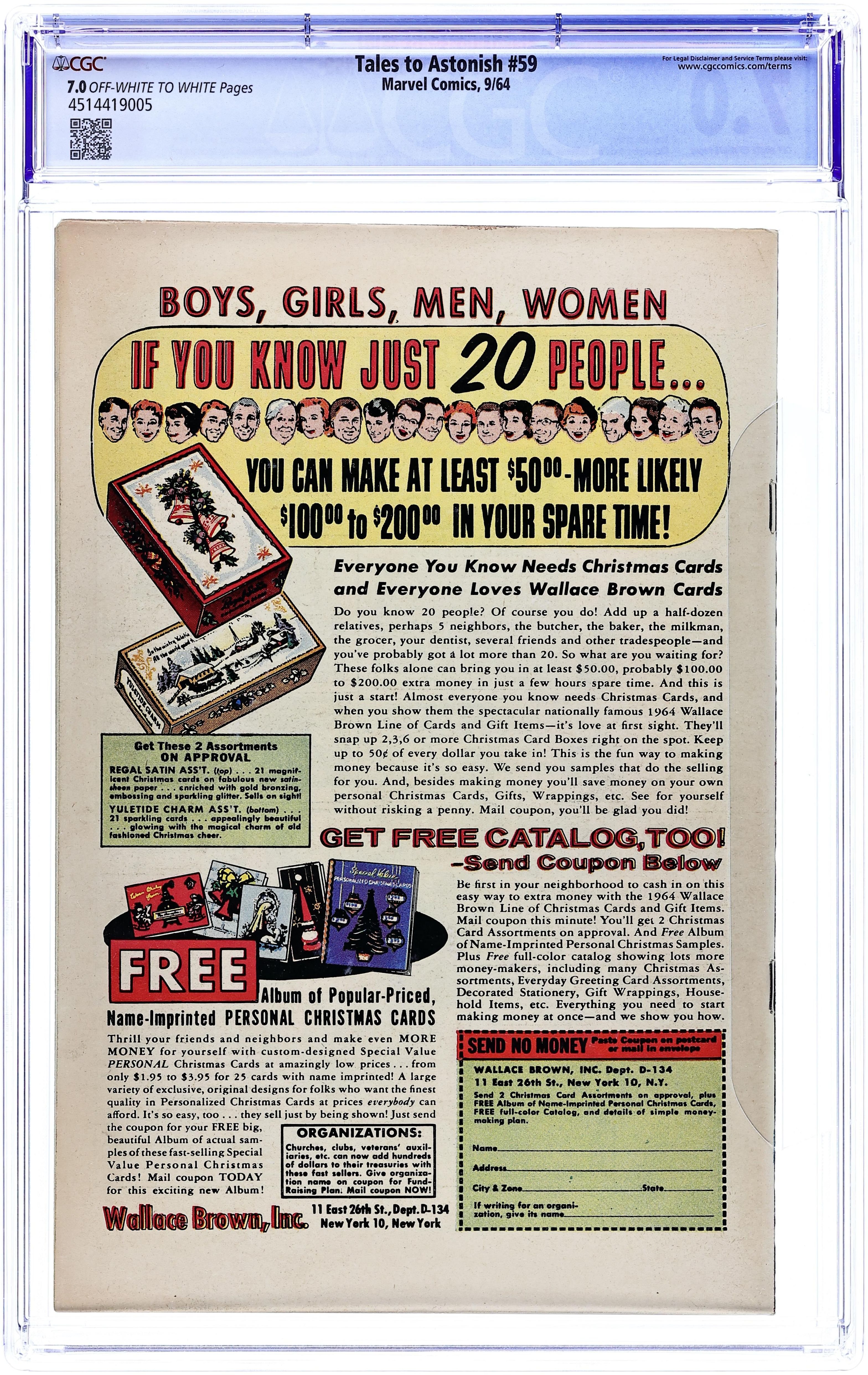 Cover by Jack Kirby and Dick Ayers. Return of the Ant-Man, Part 1, script by Stan Lee and Larry Lieber, art by Jack Kirby and Dick Ayers; Henry Pym invents an anti-radiation gas, that attracts the attention of communist spies. Strange Encounter, art by Joe Maneely; An American tourist in Paris is unwittingly targeted by a spy as an intelligence courier and is nearly killed. Return of the Ant-Man Part 2: An Army of Ants, script by Stan Lee and Larry Lieber, art by Jack Kirby and Dick Ayers; Henry Pym learns how to command ants to do his bidding and frees his captured assistants, with the help of the ants. Return of the Ant-Man Part 3: The Ant-Man's Revenge!, script by Stan Lee and Larry Lieber, art by Jack Kirby and Dick Ayers; Henry Pym invents an anti-radiation gas, that attracts the attention of communist spies. The Doorway to Nowhere!, script by Stan Lee, art by Steve Ditko; After escaping from jail, Hugo Cragg heads for a deserted mansion to hide out until the heat is off. The Thing from Outer Space!, art by Don Heck. 36 pgs., full color. $0.12. Cover price $0.12.
