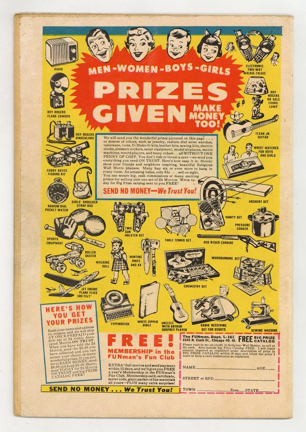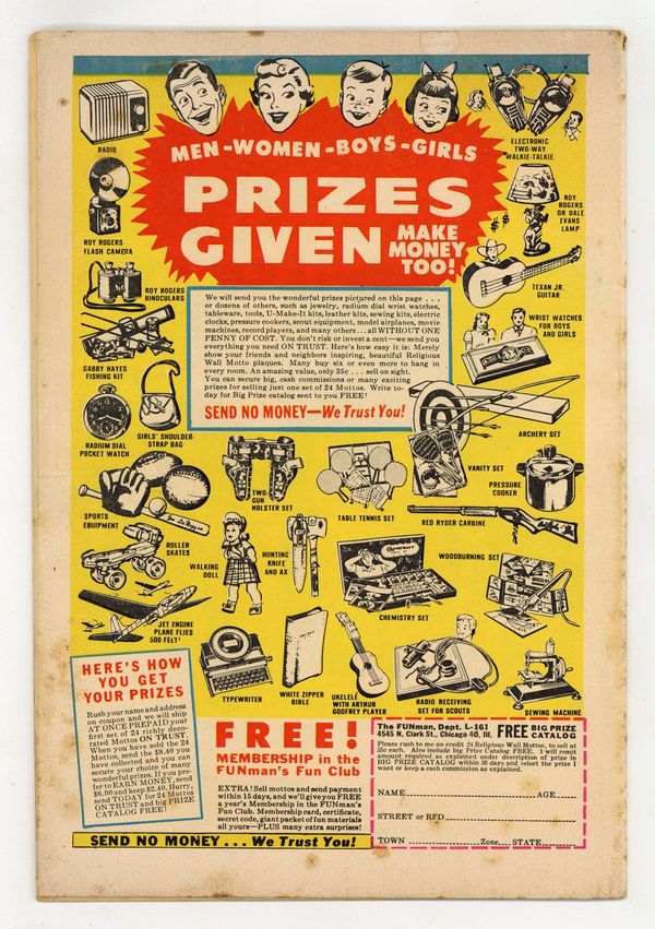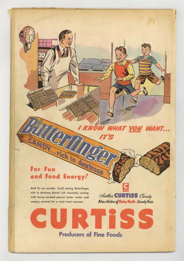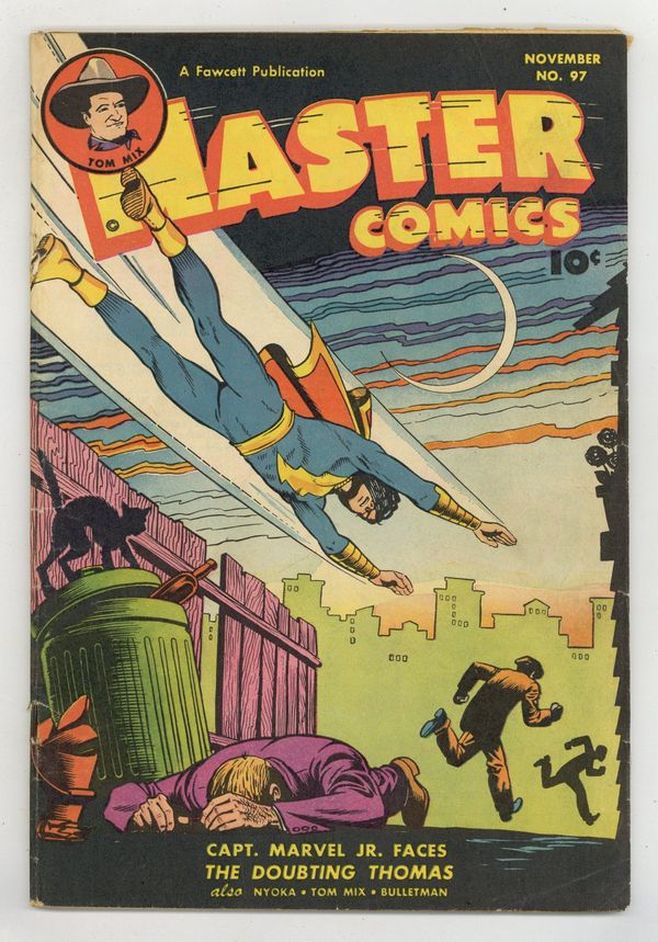 Cover art by Kurt Schaffenberger. The Doubting Thomas Doubter, art by Kurt Schaffenberger; Thomas Doubter temporarily gains Captain Marvel, Jr.'s powers. Wheaties comic-style ad wioth Vern Stephens. Nature's Murderer! starring Nyoka the Jungle Girl; After the death of his father, young Steve Hagen inherits the entire estate, overseen in trust by his Uncle Michael; However, greedy Michael suggests to the lad that a hunting trip in the jungle would be just the thing to lift the boy's spirits, the Uncle believing that "accidents" do happen in the jungle. The Babe Ruth Story Tootsie Roll ad with Captain Tootsie, art by C. C. Beck. Dressed to Kill! starring Bulletman, art by Bill Ward. Employment Escapade starring Colonel Corn and Korny Kobb. Suspected starring Tom Mix, pencils by Carl Pfeufer, inks by John Jordan. Two Comix Cards featuring Monte Hale. 52 Pages, Full Color. Cover price $0.10.