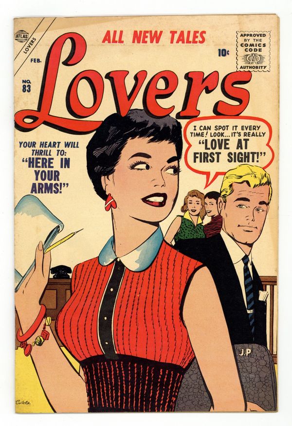 Cover by Vince Colletta. Stories by unknown. Art by Jay Scott Pike, Vince Colletta, Hugh Paley, Ann Brewster, John Tartaglione, Tom Sawyer and unknown. Your heart will thrill to "Here in Your Arms!" with art by Jay Scott Pike. Plus: She can spot it every time! Look...it's really love..."At First Sight!" with art by Vince Colletta and Hugh Paley. Also in this issue: "One Woman Man!" with inks by Vince Colletta; "End of a Dream" with art by Ann Brewster; "Tenderly, My Love" with pencils by John Tartaglione; and 2-page text story "Two Cents Worth" with art by Tom Sawyer, reprinted from True Secrets (1950) #36 (originally titled "Happiness Ahead"). 32 pages, full color. Cover price $0.10.