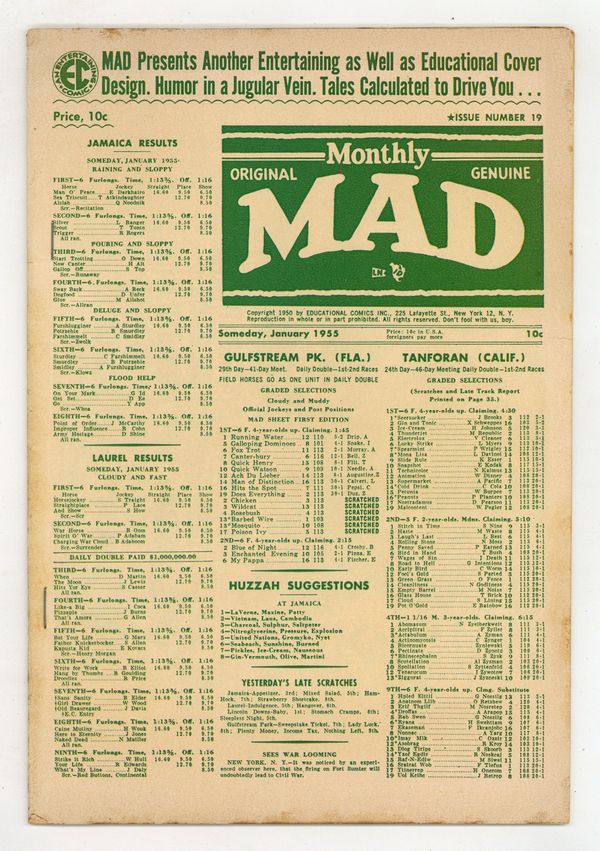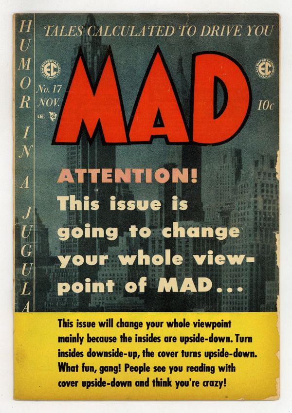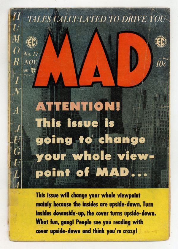 Humor magazine with this issues' contents printed upside down. The cover says "Turn insides downside-up, the cover turns upside-down. What fun, gang! People see you reading with the cover upside-down and think you're crazy!" Ad for Panic magazine. "Bringing Back Father!", art by Bill Elder and Bernie Krigstein; Jiggie cannot take Maggs's abuse any longer so when he has his serious moments he hires some goons to beat her into submission. "What's My Shine!", art by Jack Davis; How the Senate Subcomittee hearings would go if they were run like a TV game show; Loosely based on "What's My Line?" Ad for Piracy magazine. "Meet Miss Potgold," art by Basil Wolverton; A collection of drawings of grotesque women entered in the Miss Potgold of 1955 contest. "Julius Caesar!", art by Wally Wood; MAD writer points out standard lampoon shtick elements during a portion of Julius Caesar story. 36 pgs., full color. $0.10. Cover price $0.10.