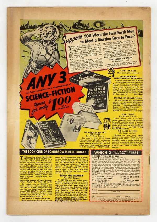 Ad for Panic magazine. "Starchie," script by Harvey Kurtzman, art by Will Elder; Bottleneck frames Starchie so that Starchie goes to prison and Bottleneck can take over the girls and rackets at the high school; Parody of Archie comic books. "From Eternity Back to Here!", script by Harvey Kurtzman, art by Bernie Krigstein; Prewitt will not fight, no matter what, and Sgt. Warden and Mrs. Homes drown on the beach; Parody of the movie "From Here to Eternity." "Operation Under-the-Ground" (Chapter 6) text story. "3-Dimensions!", script by Harvey Kurtzman, art by Wally Wood; A phony description of how 3-D comics are made and a look at what can go wrong. "Mark Trade!", script by Harvey Kurtzman, art by Jack Davis; Parody of the comic strip Mark Trail, finding Mark sick and tired of nature. 36 pgs., full color. $0.10. Cover price $0.10.