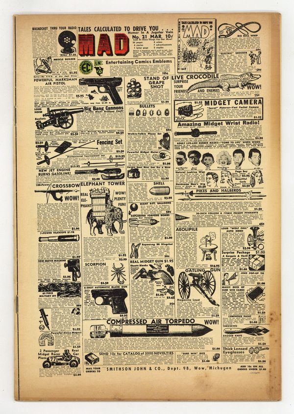 "Poopeye!", art by Bill Elder; Poopeye beats up other comic strongmen hired by the broccoli king to get rid of Poopeye; Parody of Popeye comic strip. "Slow Motion!", art by Jack Davis; A look at what might be happening in various sports if they were recorded by a slow motion camera. "Comic Book Ads!", art by Bill Elder; Parody ads for "How To Hypnotize", "Get Prizes... Make Money", "Rubber Bubble Gum", "Tromp Stamps Co.", "Ded Ryder Cowboy Carbine", and "Alwett Physical Training Course." "Under The Waterfront!", art by Wallace Wood; Everyone Terry knows is killed by John Friendly's thugs; Parody of the movie "On The Waterfront." 36 pgs., full color. $0.10. Cover price $0.10.