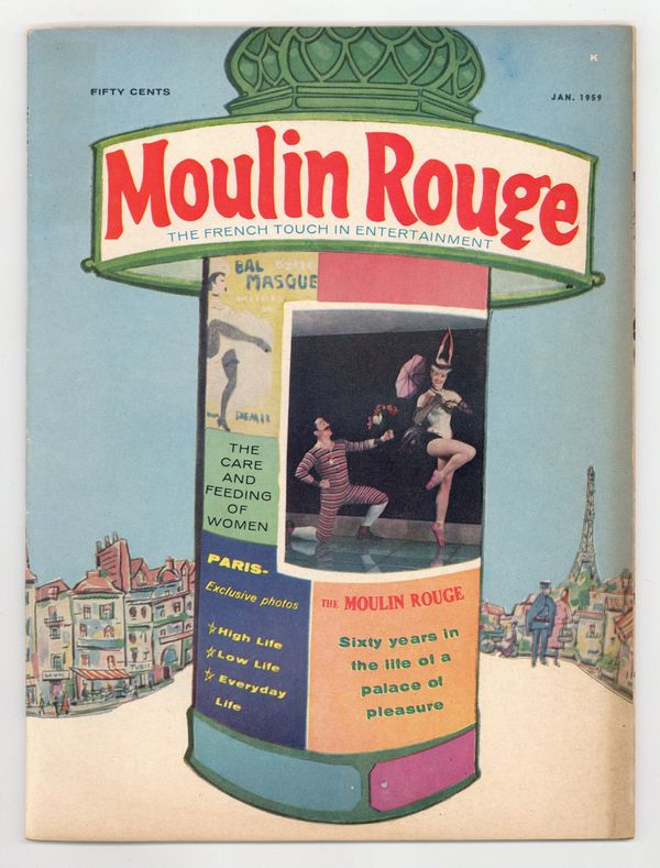 Volume 1, Issue 1 - January 1959. Men's magazine focusing on french culture, featuring articles and pinups. Dawn Richard color gate fold pinup. " The Moulin Rouge: Sixty Years in the Life pf a Palace of Pleasure." 8 1/2 in. x 11 in. 66 pages. B&W. Mature Readers. Cover price $0.50.