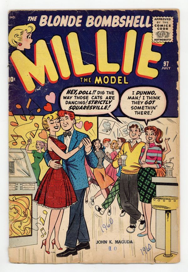 Stories by Stan Lee. Art and Cover by Dan DeCarlo. Millie the Model in: two untitled stories; "Millie Models..." 4-pager; four untitled 1-pagers; "Millie's Fashion Page" half-pager; and one untitled half-pager (writer unknown). Plus: 2-page text story "The Contest" (creators unknown); untitled My Girl Pearl story; untitled Chili half-pager; and "Chili's Fashion Page" half-pager. 32 pages, full color. Cover price $0.10.