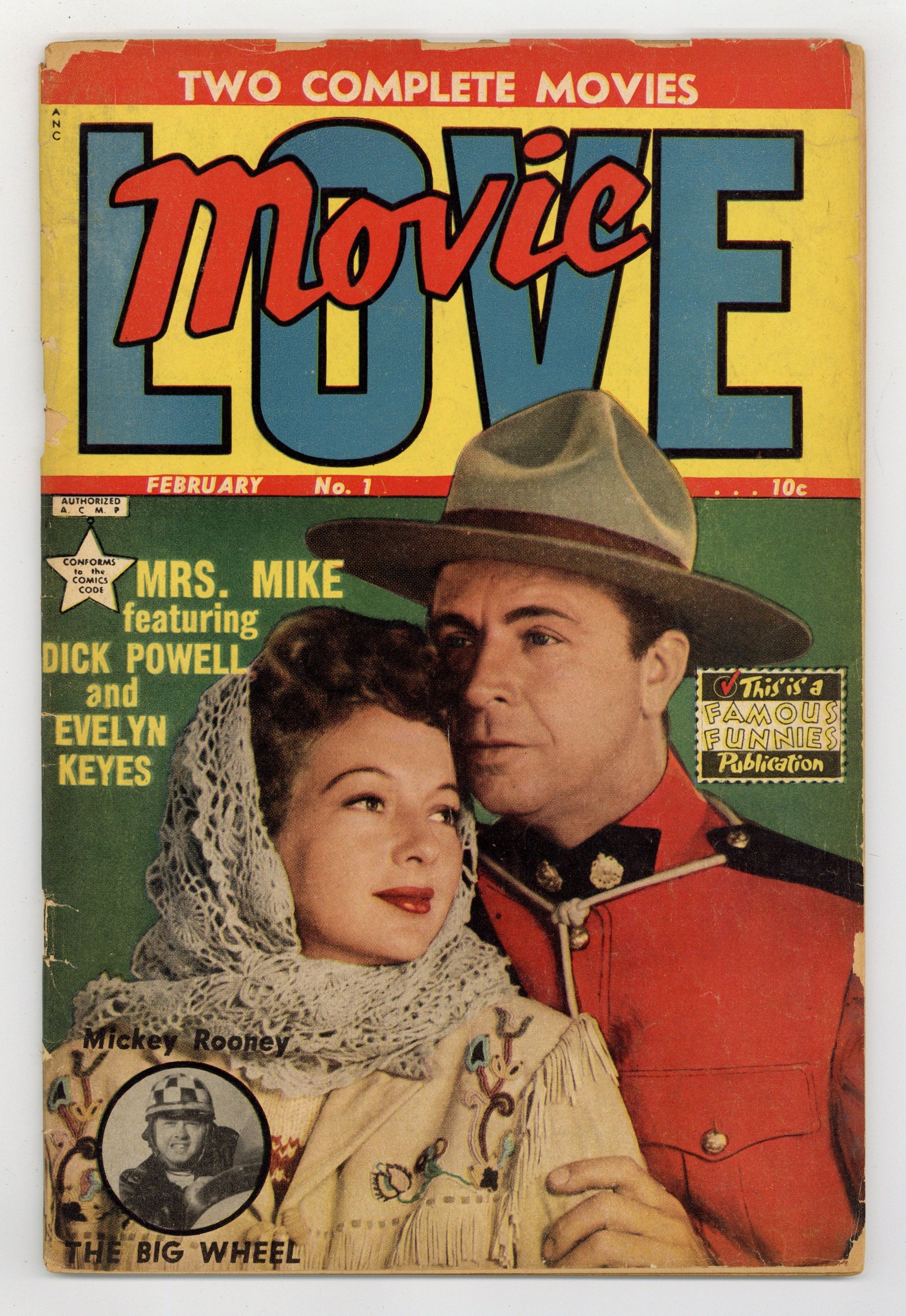 Photo cover of Sgt. Mike Flannigan (Dick Powell), Kathy O'Fallon Flannigan (Evelyn Keyes), and Billy Coy (Mickey Rooney). Hot Rod Rooney article with photo of Billy Coy (Mickey Rooney). "Mrs. Mike," art by Alfonso Greene; Adaptation of the 1949; Kathy O'Fallon marries Sgt. Mike Flannigan of the Royal Canadian Mounted Police; Diphtheria spreads through their isolated village in the Canadian northwest. "Jerry Colonna," art by Ed Moore. "The Big Wheel," art by Ruth Atkinson; Adaptation of the 1949 movie "The Big Wheel"; A midget racecar driver lives in the shadow of his famous, but drunken father. Famous Funnies Patterns ad. The Birth of Mrs. Mike article with photos of Sgt. Mike Flannigan (Dick Powell) and Kathy O'Fallon Flannigan (Evelyn Keyes). 52 pgs., full color. $0.10. Cover price $0.10.