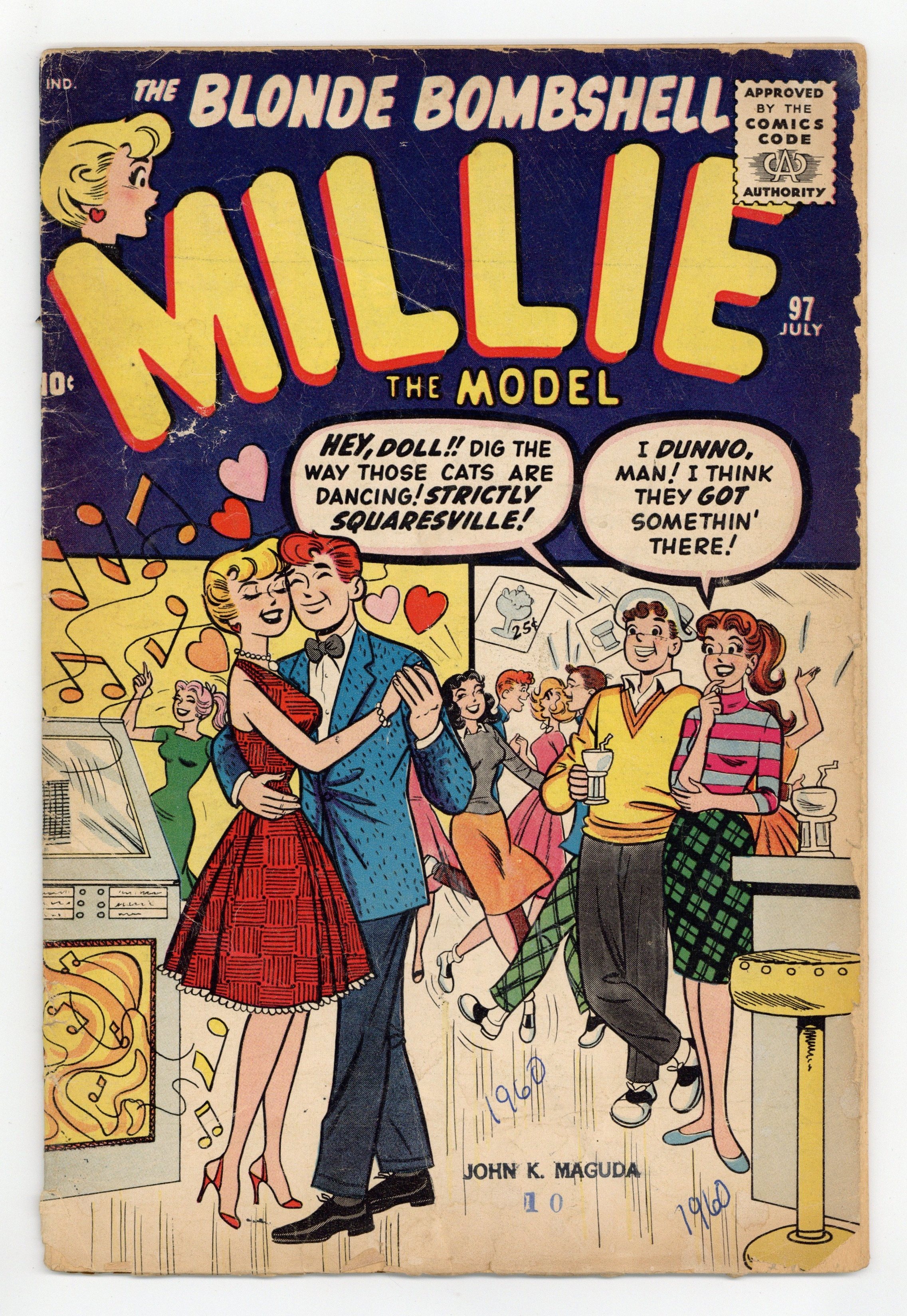 Cover art by Stan Goldberg. The Other Woman!! starring Millie the Model. Millie's Fashion Pin-Up. Time for a Change! starring Millie. Millie's Museum Madness! starring Millie. Millie's Cartoon Cut-Out! Is This a Kiss??! starring Millie. Mr. Richwell Rings the Bell! starring Millie. She Shoulda Stood in Bed! starring Millie. Millie's Fashion Fun. Millie's Fashion Quiz. Who Needs the Beads?? starring Millie. Stories by Stan Lee, art by Stan Goldberg. The Model text story. 36 pgs. $0.10. Cover price $0.10.
