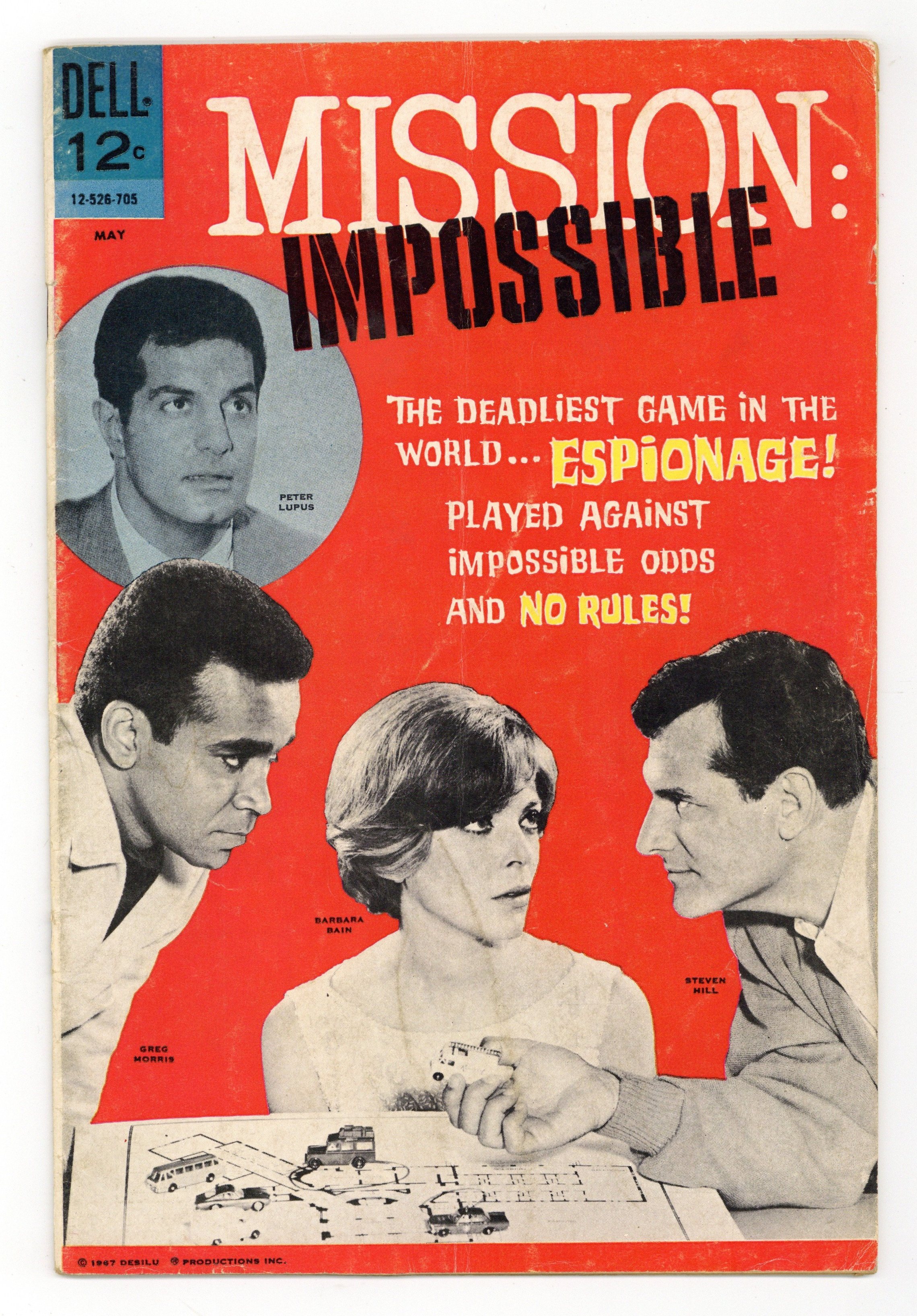 Photo cover features Peter Lupus, Greg Morris, Barbara Bain and Steven Hill. Stories by Paul S. Newman. Art by Jack Sparling. Cover number is 12-526-705. Long before the movies, the TV series about a crack team of spies and their unlikely assignments inspired this comic. The IMF team is sent after a reconnaissance plane shot down by the Communists. But escape hinges on a dangerous maneuver: a plane picks up their inflatable raft with a skyhook, while enemy forces fire on them. In another tale, the team is sent to retrieve a Chinese defector. Target in the Sea; The Deadly Defector. 32 pages, Full Color. Cover price $0.12.