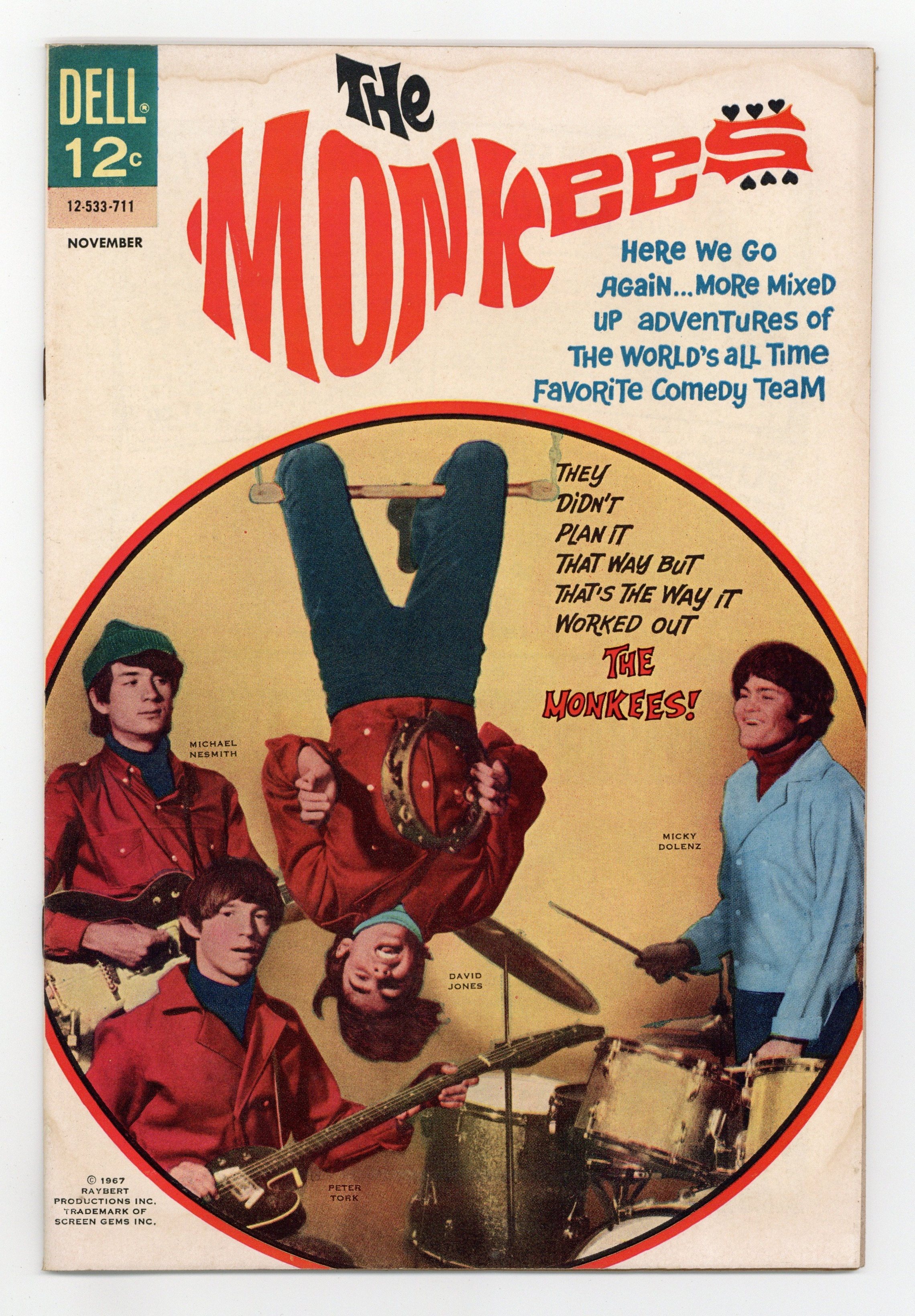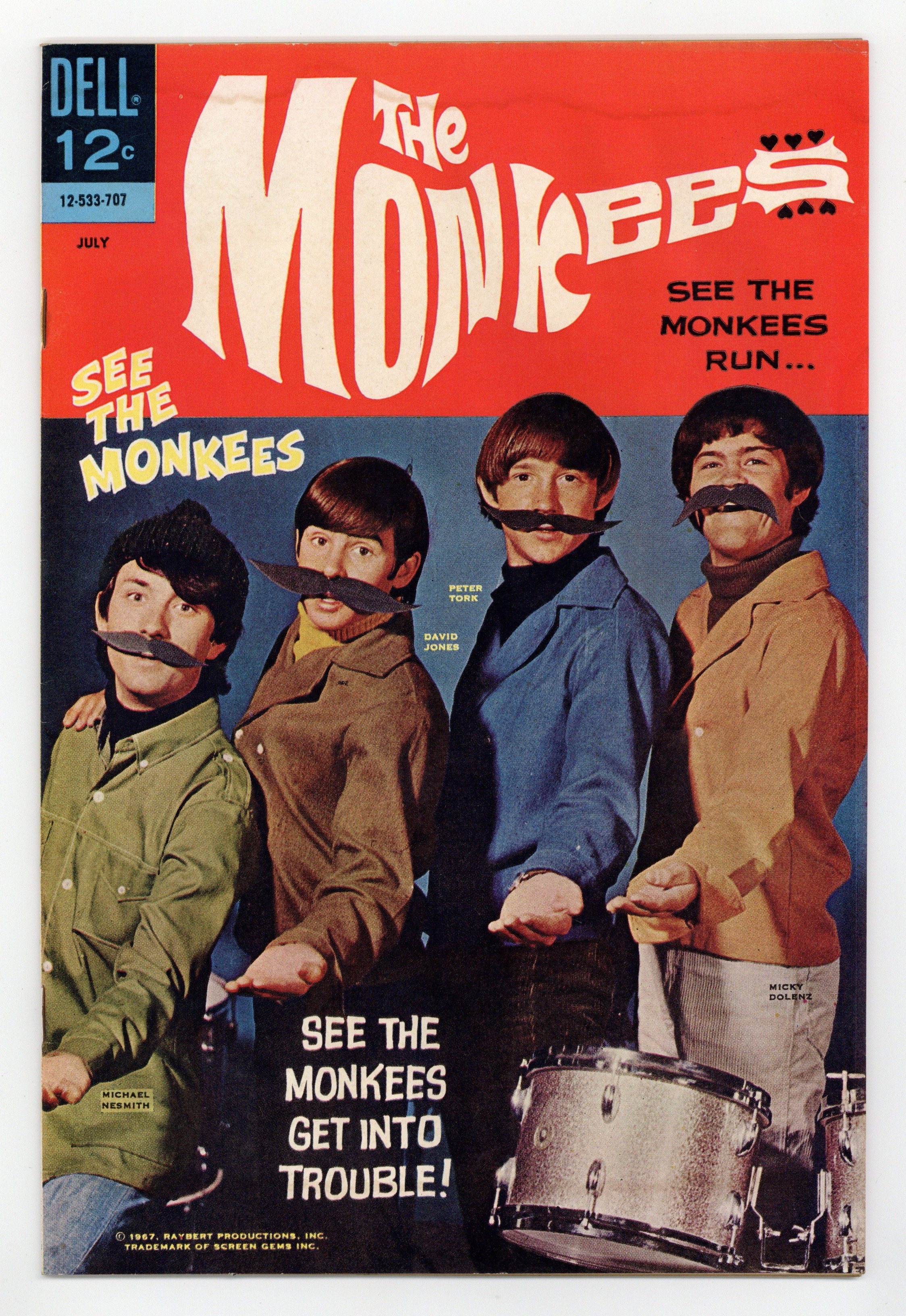 Photo cover features Peter Tork, Michael Nesmith, Micky Dolenz, and Davy Jones. Art by Jose Delbo. Cover number is 12-533-707. Dell's comic about the TV rock band does surprisingly well at capturing the madcap, absurd humor of the beloved show. A talking horse named Spot leads the Monkees to a circus, and a showdown with gangsters. The space program calls The Monkees to the Wide Sands Proving Ground, so their music can calm an enraged ape astronaut. Instead, the Monkees themselves are launched into orbit. See Spot. See Spot Run!; Up, Up and Away! 32 pages, Full Color. Cover price $0.12.