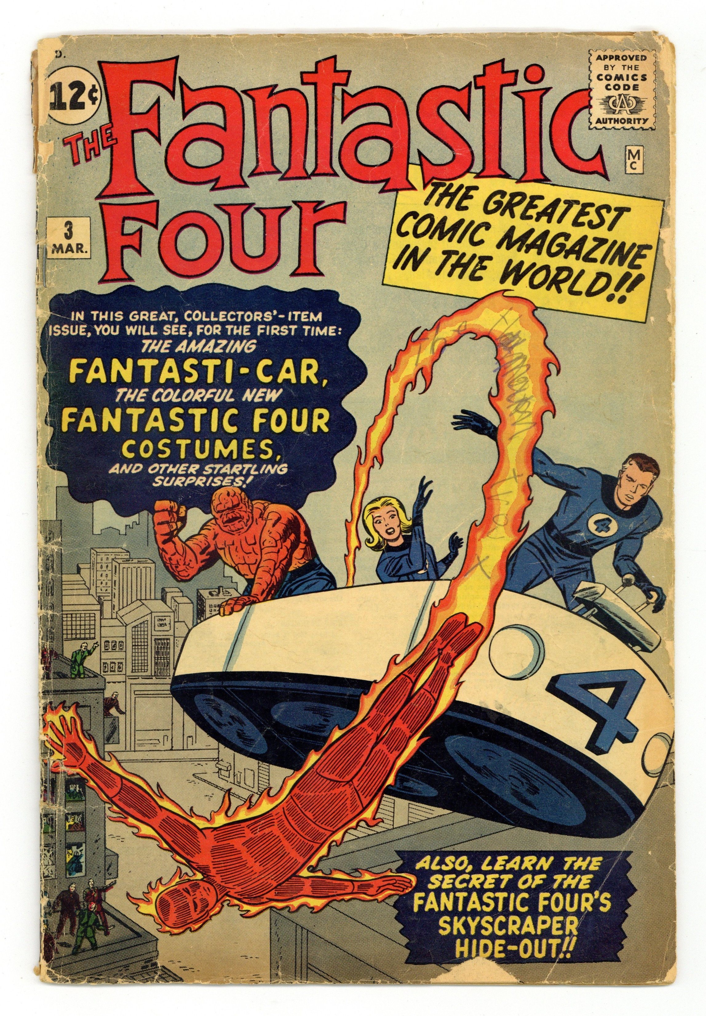 First 12-cent issue. Cover pencils by Jack Kirby, inks by Sol Brodsky. First appearance of the Miracle Man in "The Menace of the Miracle Man!", script by Stan Lee, pencils by Jack Kirby, inks by Sol Brodsky; The Miracle Man performs his super-villain debut at his magic show by humiliating the Thing. Johnny Storm the Human Torch! Pin-Up Page, pencils by Jack Kirby, inks by Sol Brodsky. Chapter II "The Monster Lives!"; Miracle Man declares war on humanity and animates a movie monster statue. Chapter III "The Flame that Died!"; Human Torch torches the animated Monster from Mars-statue and Invisible Girl stowes away on the atomic tank that Miracle Man has stolen. Chapter IV "In the Shadow of Defeat!"; The Thing recalls the origin of the Fantastic Four while the Invisible Girl is taken prisoner by Miracle Man. Chapter V "The Final Challenge!" This issue features the first appearances of the FF costumes and the Fantasticar. First FF letters page; letter to the editor from comics artist Alan Weiss. (For the original, unused Kirby/Dick Ayers cover to this issue, see Fantastic Four 224.) 36 pgs. $0.12. Cover price $0.12.