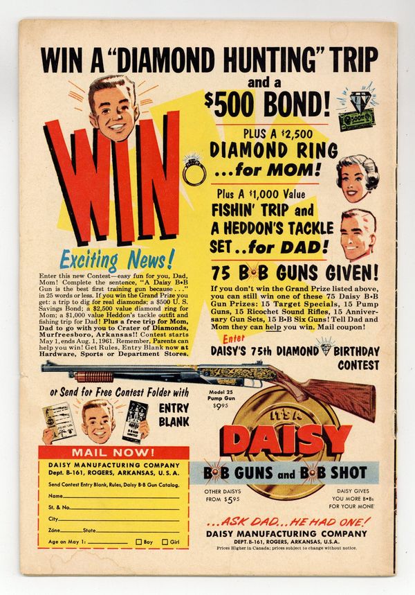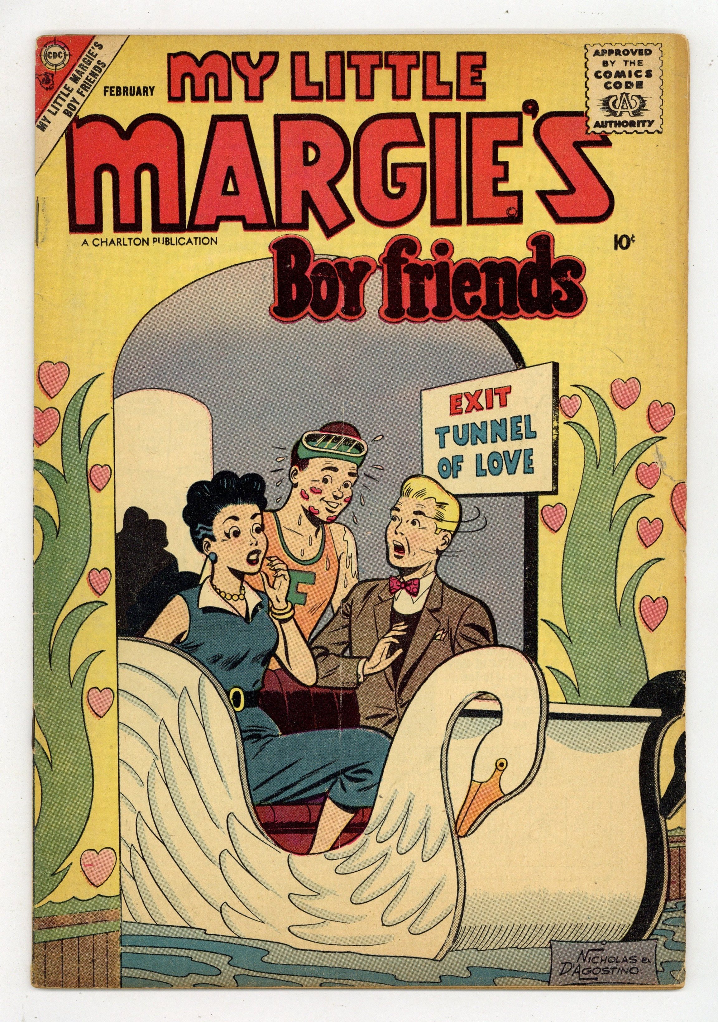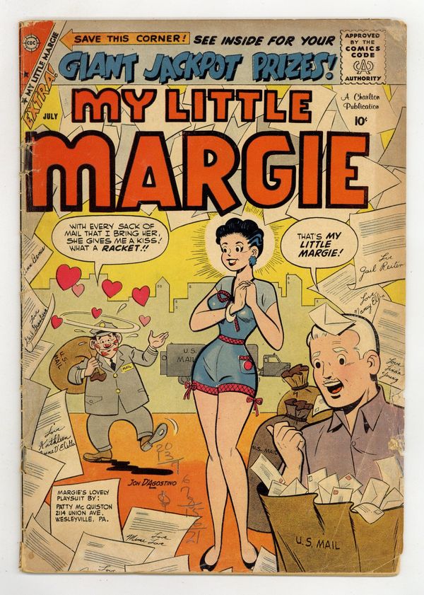 Cover by Jon D'Agostino and Patty McQuiston. Stories and art by Jon D'Agostino and others. Charlton presents the misadventures of the popular TV/radio show character and her long-suffering father, Vern. Margie accidentally fills the house with bubble bath. Margie plans a scheme to make Vern look like a superior fisherman for his boss. Margie's infinitely deep handbag confounds a stage magician when she volunteers to be part of his act. Fashion and story pages feature Margie in reader-designed fashions that acknowledge the designer by name, even on the cover. Bubble Trouble; Fishy Story; Going Steady with Freddy; Magician's Helper; Dead-Eye Dad. 32 pages, Full Color. Cover price $0.10.