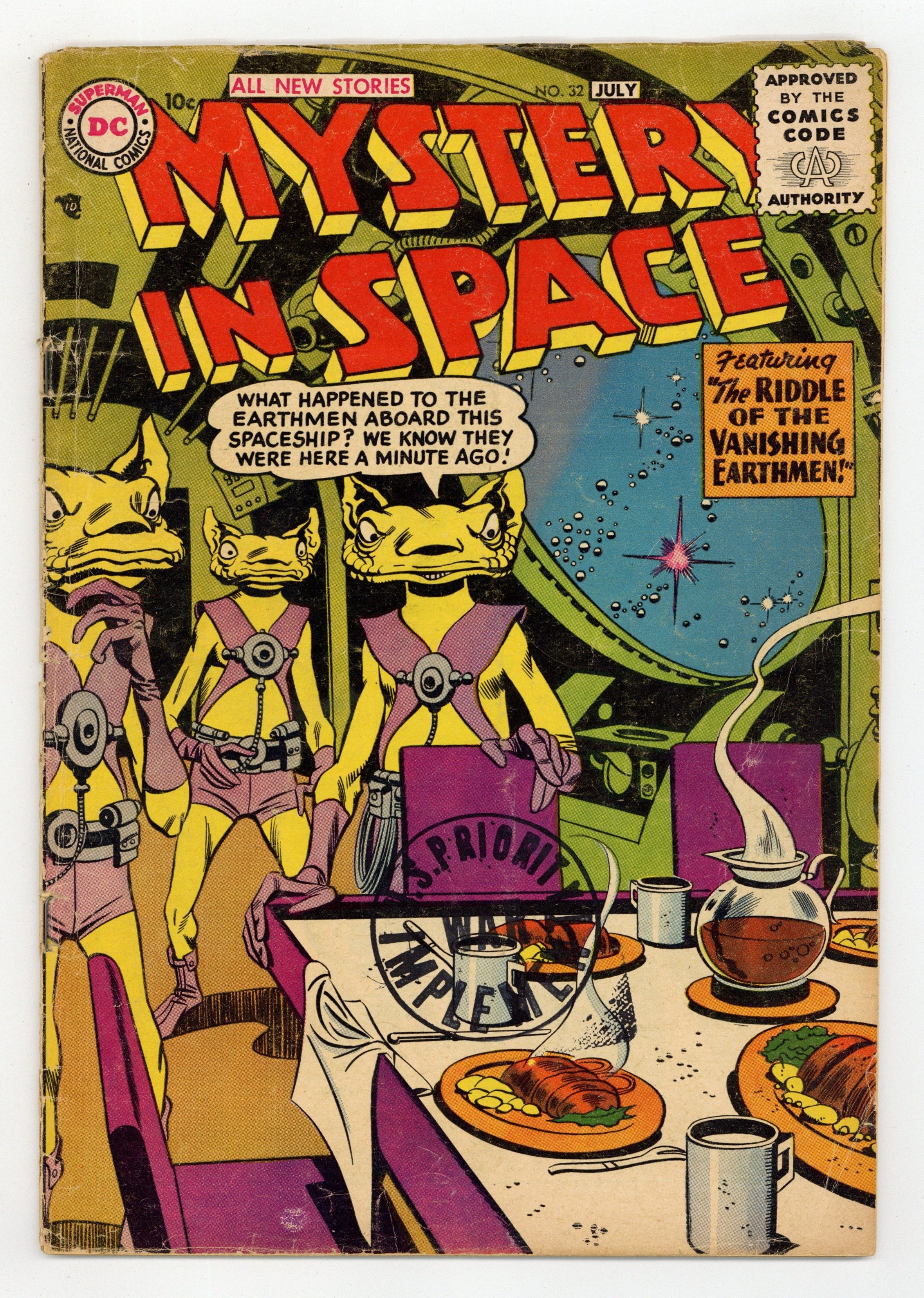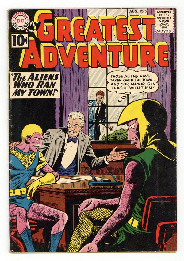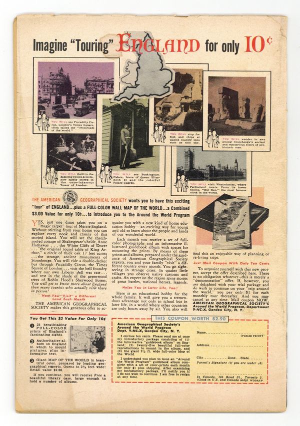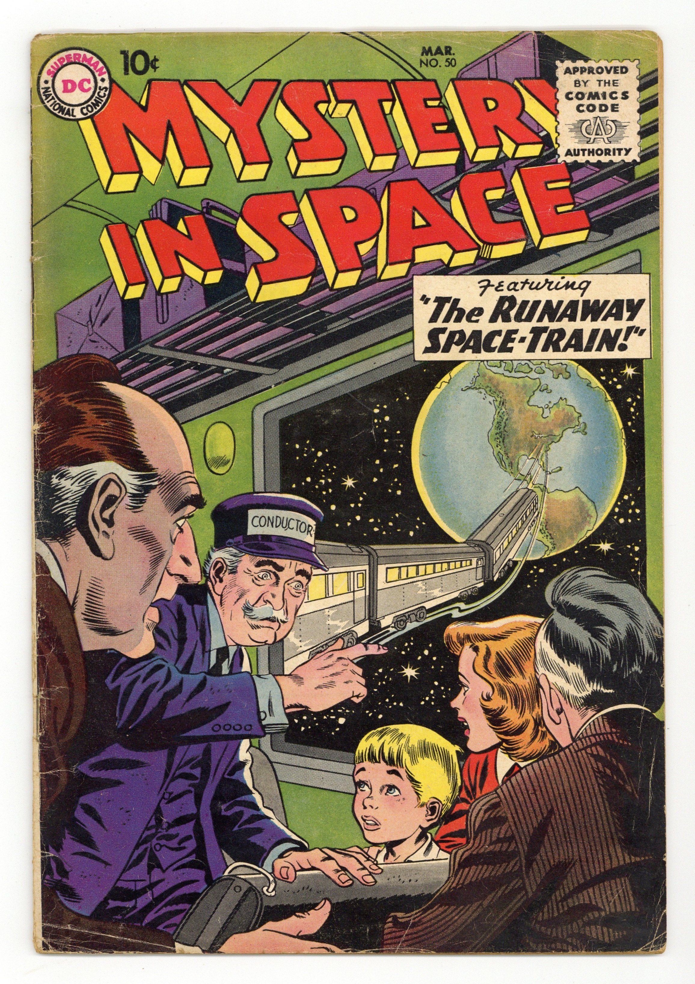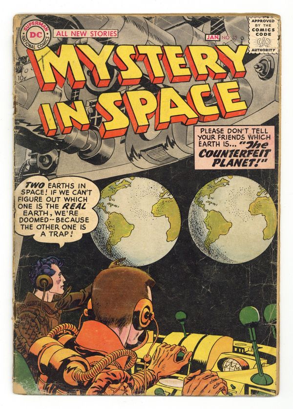 "The Counterfeit Earth!"; "The Man Who Owned the Earth!"; "Interplanetary Baby-Sitter!" (pencils by Carmine Infantino?); and "The Secret of the Cabby's Medallion!" (pencils by Gil Kane). Kane cover. 36 Pages, Full Color. Cover price $0.10.