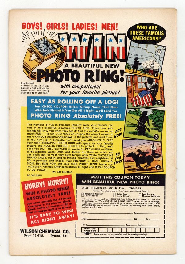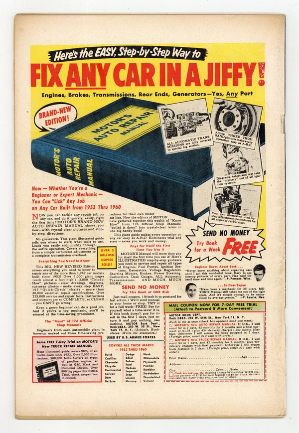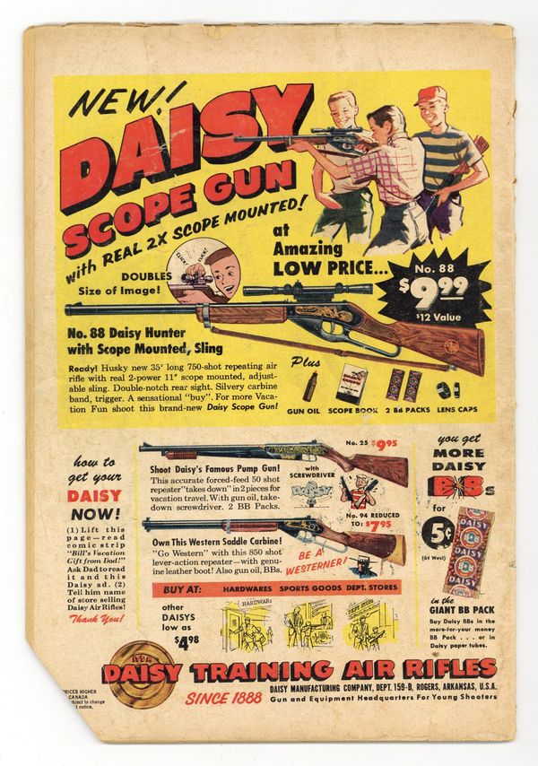 Cover by Charles Nicholas and Jon D'Agostino. Stories and art by George Wildman and Jon D'Agostino. This spinoff of the popular TV/radio show provides a bridge between I Love Lucy-style domestic comedy and Archie-style teen comedy, two staples of 1950s entertainment. When Tex impresses Margie with his new yacht, Harvey and Freddie decide to get a boat too, but sailing isn't in their blood - or their skill sets. Through a mistaken set of circumstances, Margie manages to (accidentally!) steal a pearl necklace, assault a cop, take his gun, and hijack an armored car. A scary movie has Harvey seeing monsters and maniacs around every corner. Sailors Ahoy; A Desperate Character; Cook a Cake; Harvey's Big Night; You Just Can't Win; Bank Prank; You Wanted Something? 32 pages, Full Color. Cover price $0.10.