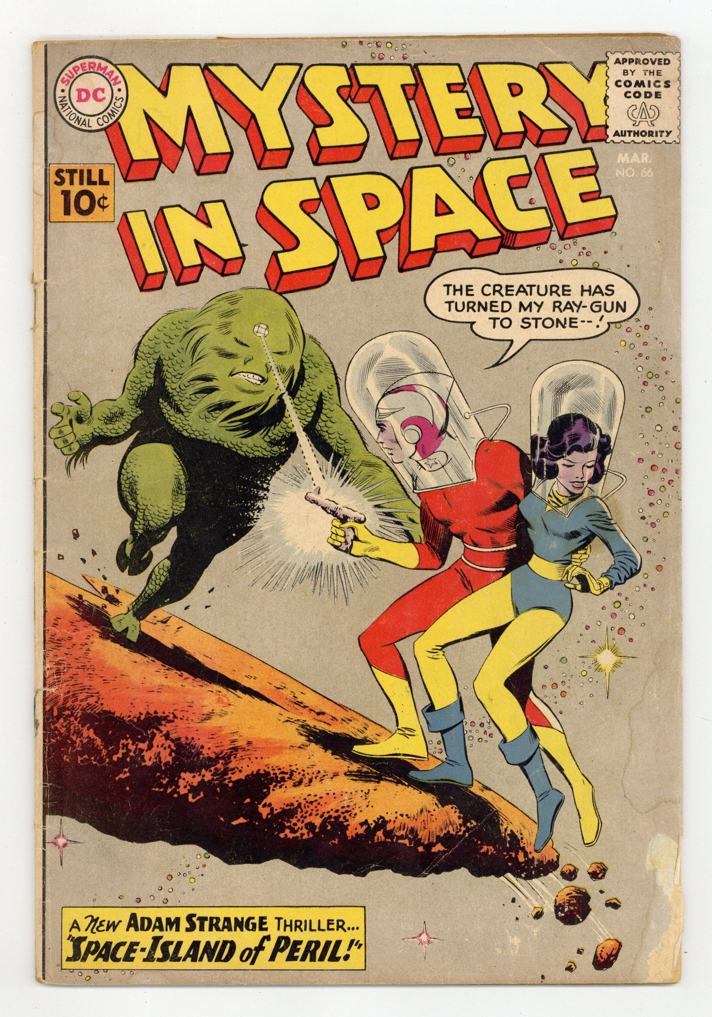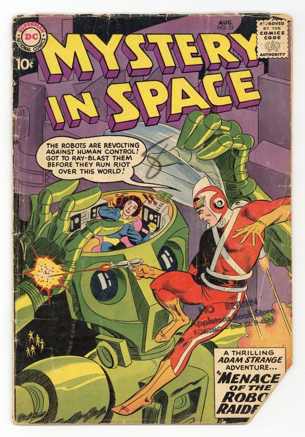 Adam Strange stars in "Space-Island of Peril!" (pencils by Carmine Infantino). Back-up stories: "Beauty and the Robot!" and "Who Caught the Loborilla?" (art by Sid Greene?). Infantino cover pencils. 36 Pages, Full Color. Cover price $0.10.