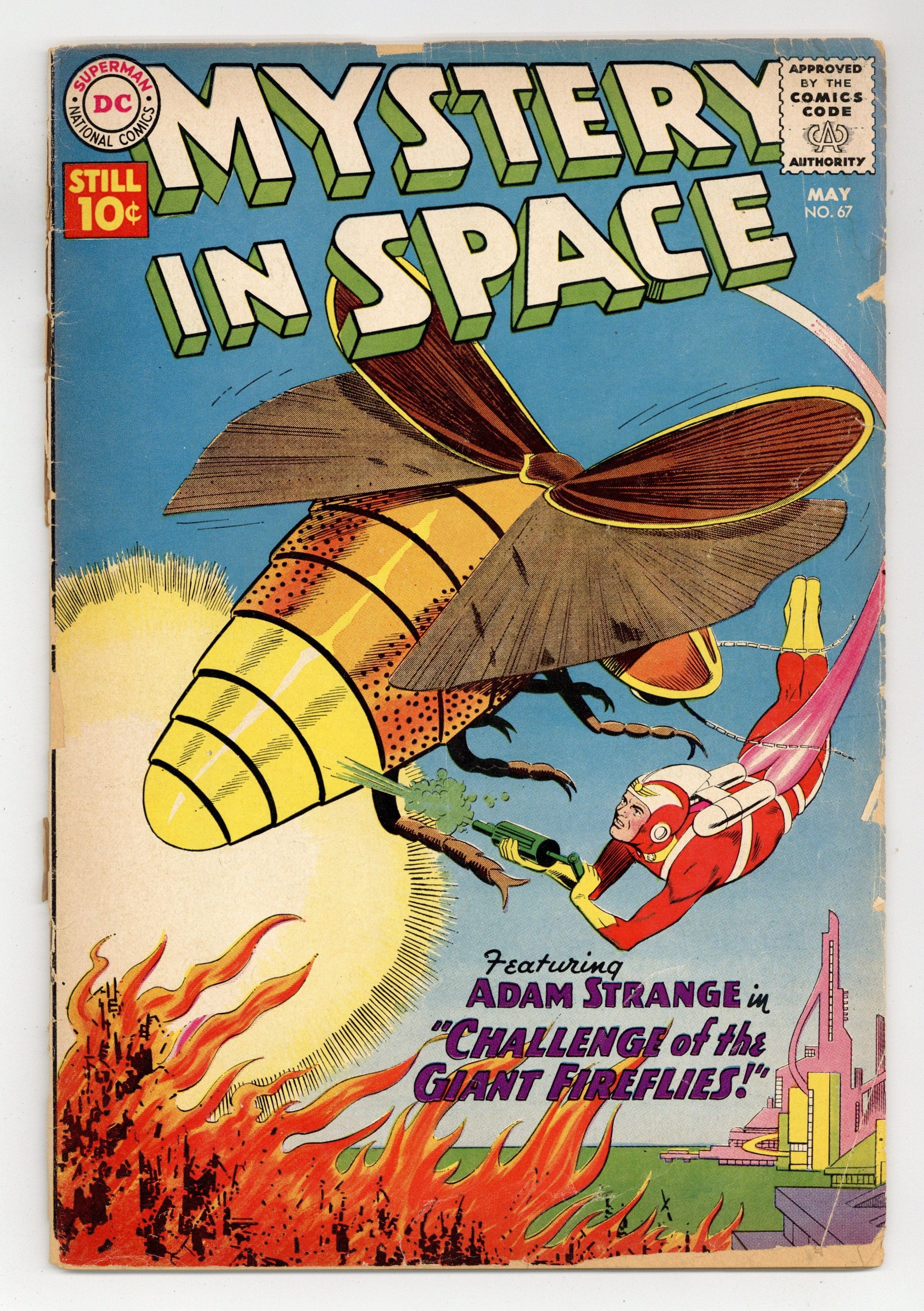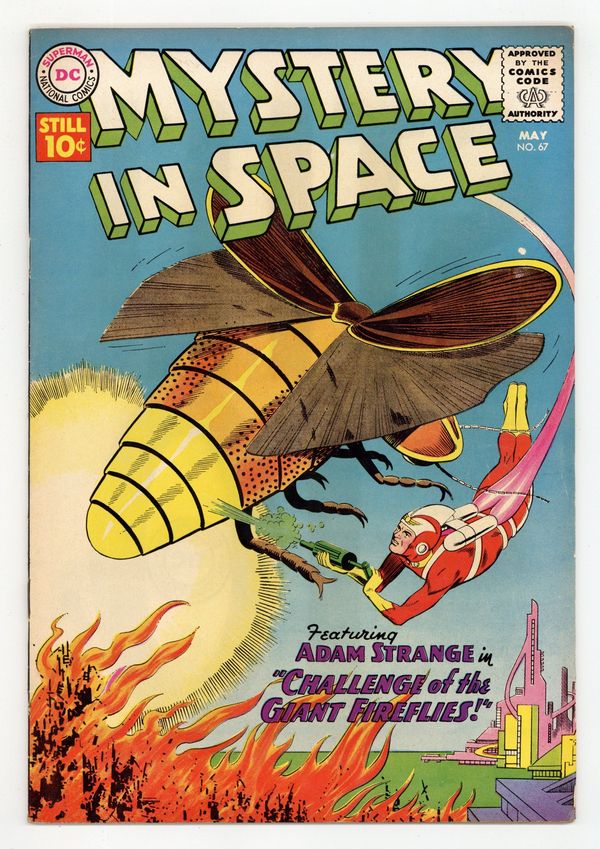 Adam Strange stars in "Challenge of the Giant Fireflies!" (pencils by Carmine Infantino). Back-up stories: "Language-Master of Space!" (art by Sid Greene?) and "Mystery Message from Fort Nova!" (pencils by Gil Kane). Infantino cover pencils. 36 Pages, Full Color. Cover price $0.10.