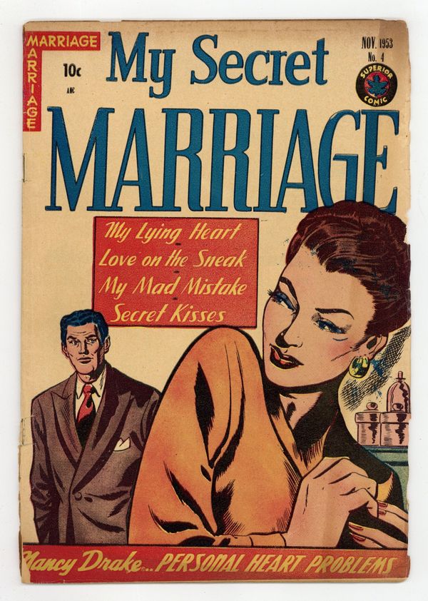 Couples wrestle with marital strife in this pre-Code romance comic from Canadian publisher Superior that often features good-girl art. Lois is torn between soldier Larry and defense contractor Jeff - but the story takes a left turn with the discovery of a spy ring. Sisters Betsy and Ellen get into a feud over dating older men, but one of the sisters is secretly married to boot. Bert discovers that his new wife Mary has inherited her father's gambling problem. My Cheating Heart; Two Kinds of Love; Too Young For Kisses; Gamble With Marriage. 32 pages, Full Color. Cover price $0.10.