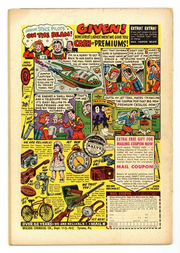 "The Day the Earth Split in Two." Secret of the Scientific Doodads" (art by Carmine Infantino), "Search for the Space Sparklers" (pencils by Gil Kane), and "The Robot Magician." Quarter-page Fearless Fosdick ad for Wildroot Cream-Oil by Al Capp. Kane cover. 36 Pages, Full Color. Cover price $0.10.