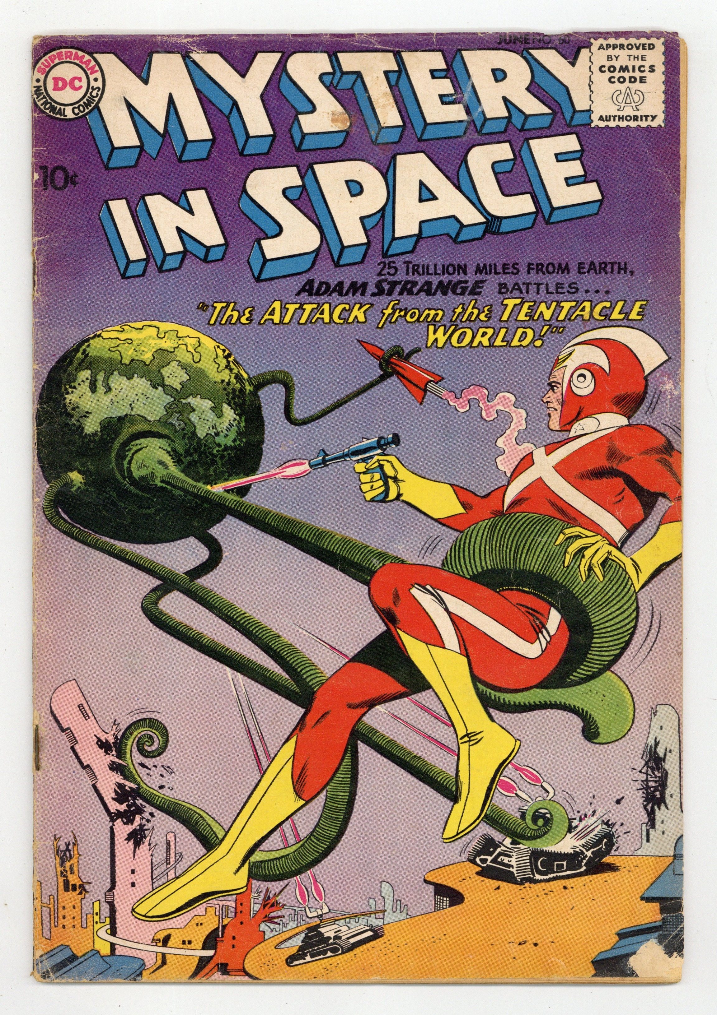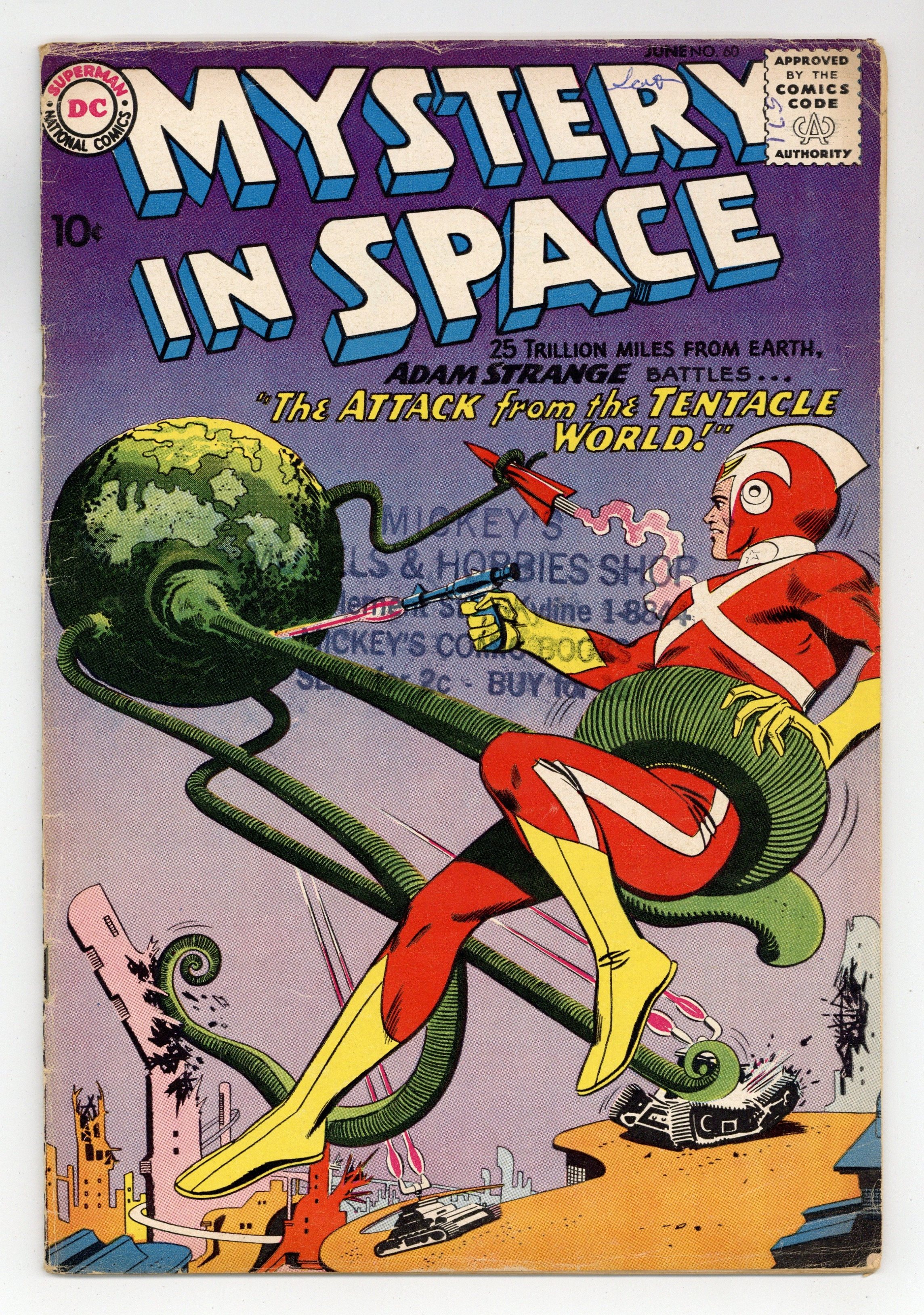 Adam Strange stars in "The Attack of the Tentacle World!" (pencils by Carmine Infantino). Back-up stories: "Doom Bombs From Jupiter" (pencils by Gil Kane) and "Mystery of the Synthetic Man!" (pencils by Sid Greene?). Kane/infantino cover. 36 Pages, Full Color. Cover price $0.10.
