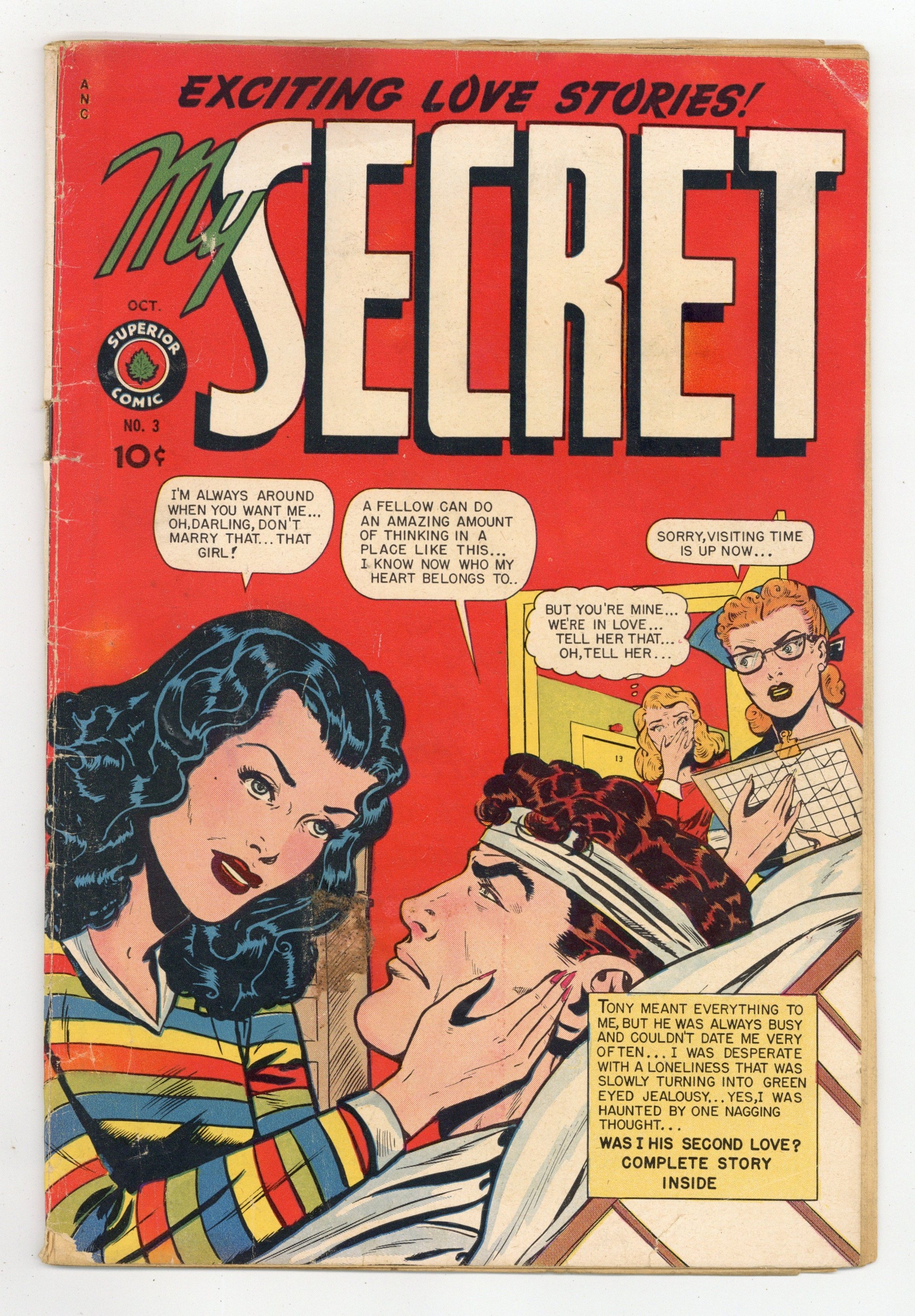 Art by Jack Kamen and others. Cover by Jack Kamen. Pre-Code romance comic from Canadian publisher Superior, featuring torrid melodrama. Handsome Tony must choose between the two women who love him, but a hospital stay gives him time to decide. When Gladys and Bud find love in the campus lab, Bud's unhinged wife attacks Gladys by throwing acid in her eyes (!), something you don't see in the average romance comic. Featuring art and a cover by future EC legend Jack Kamen. They Called Me Shameless!; I Sang My Heart Away; What Would You Do?; I Was a Victim of Glamour!; Was I His Second Love? Final issue under this title; series continues as Our Secret (1949) #4. 32 pages, Full Color. Cover price $0.10.