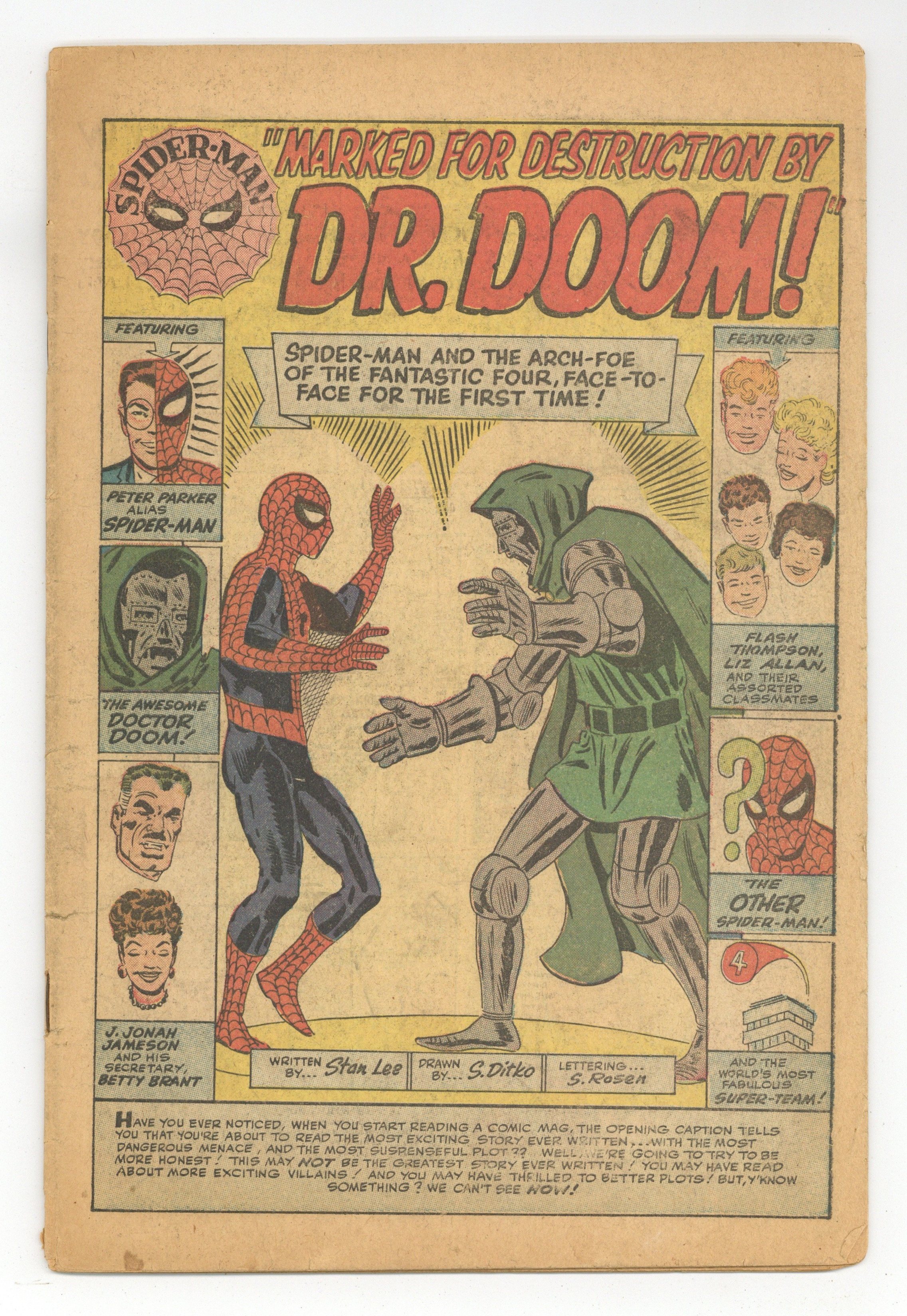 Cover art by Steve Ditko. Marked for Destruction by Doctor Doom!, script by Stan Lee, art by Steve Ditko; Dr. Doom tries to trick Spider-Man into helping him defeat the Fantastic Four; When Spider-Man turns him down, he decides to capture Spider-Man; Flash Thompson dresses up as Spider-Man for a prank and Dr. Doom mistakes him for the real Spider-Man and captures him instead, and Flash has to be saved by the real Spider-Man. First Time Doctor Doom uses a robot to take his place. Reprinted in Marvel Tales # 142. 36 pgs. $0.12. Cover price $0.12.