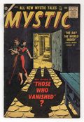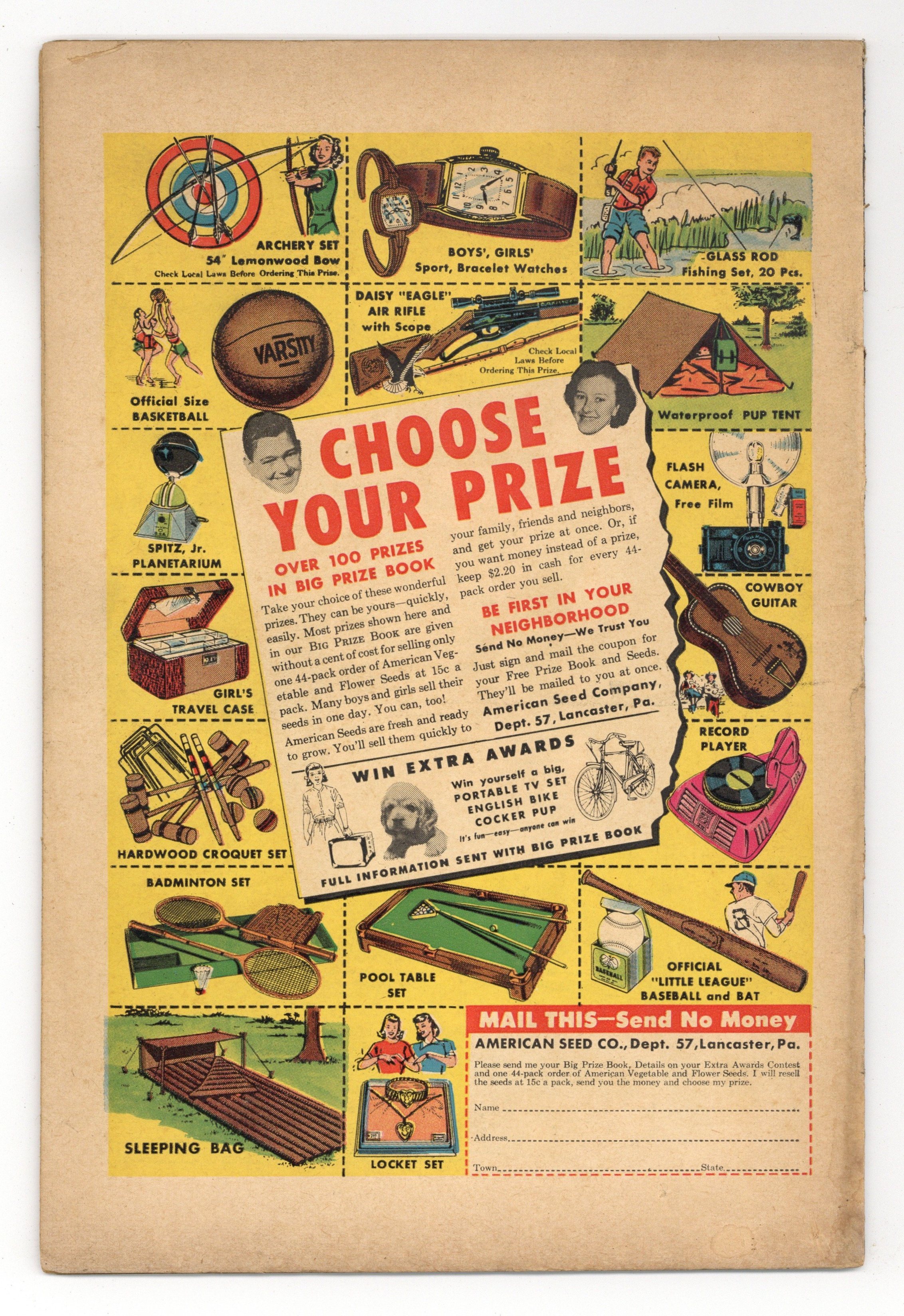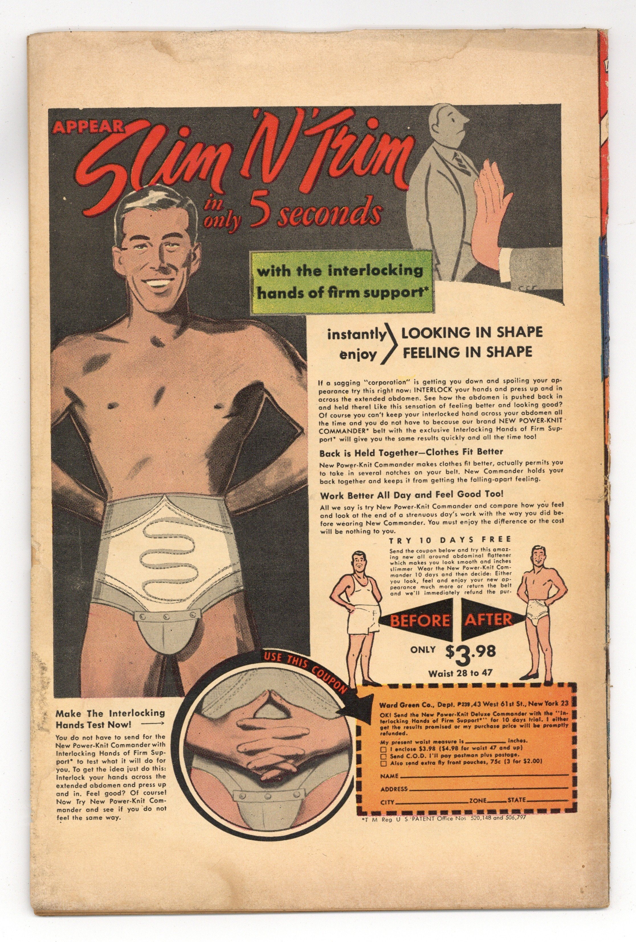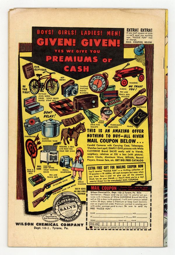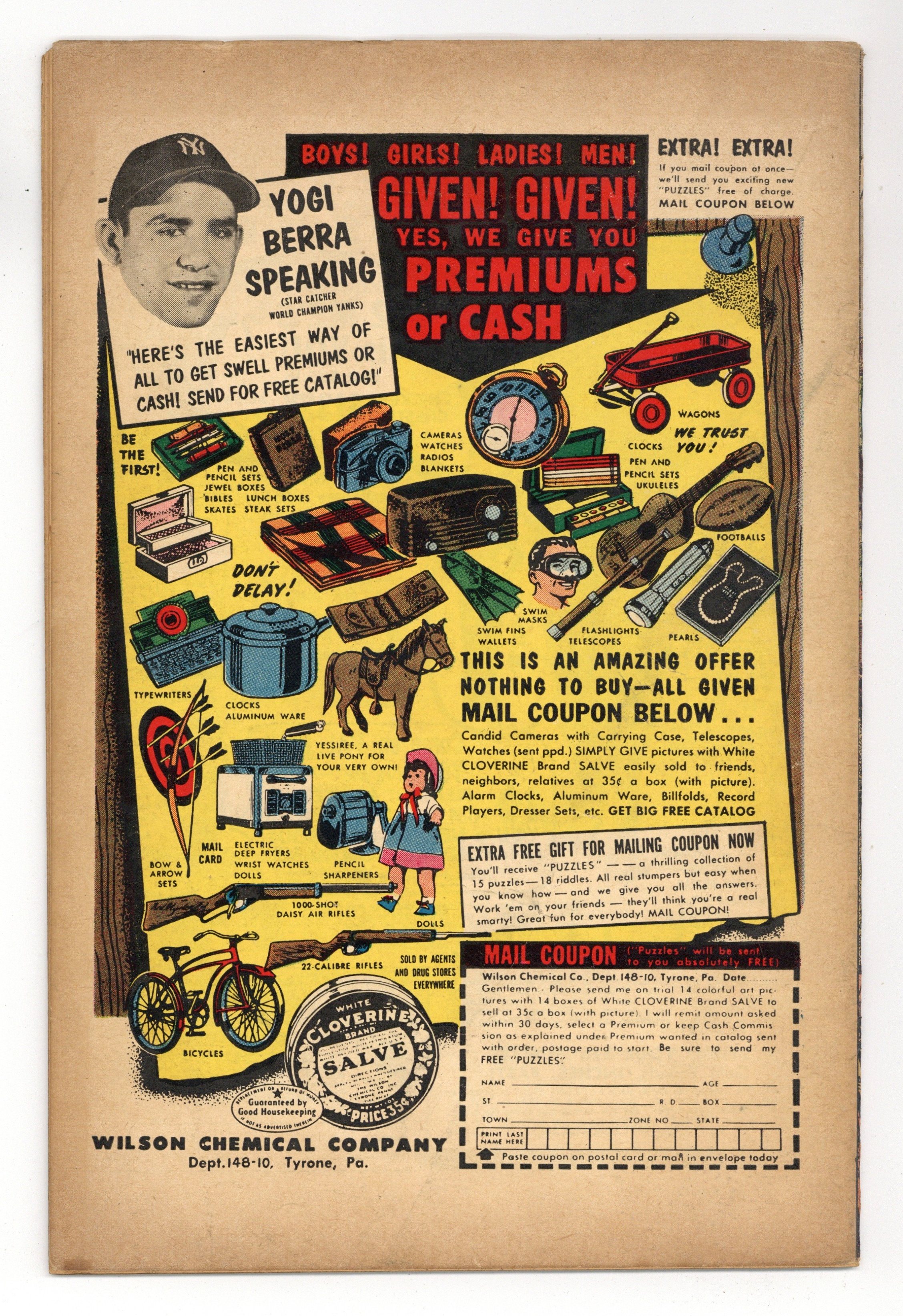 Cover art by Bill Everett. The Effigy, art by Wally Wood; A criminal takes an effigy from a voodoo cult so that they cannot use it to compel him to surrender himself to the police. Iron Face!, pencils by Bob Powell; When the communists come up with a machine that can read minds, NATO takes a short soldier and supplies him with a fake head that contains instructions for leading the commies into a trap. The Secret of the Iron Needle!, art by John Forte; Space explorers realize, when the planet they are examining runs down, the giant needle they've found is not a natural phenomenon but the winding key of a giant toy. The Last Laugh!, pencils by Pete Morisi; A ruthless businessman is sure that he is the reincarnation of someone important from medieval times, but when he does journey back into time he finds that he was...the court jester. Mystery Pupil text story. They Wait in the Caves!, art by Mort Drucker; A man finds an island abundant with pearls and gives the location to his friend. When the friend arrives, the natives destroy his boat to keep him from revealing the island's location to anyone else. The Land of Missing Persons. 36 pgs. $0.10. Cover price $0.10.