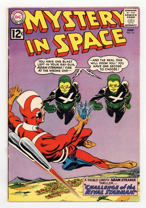 Adam Strange stars in "Challenge of the Rival Starman!" Script by Gardner Fox, pencils by Carmine Infantino, inks by Murphy Anderson. Backup story: "The Trojan Whale of Space!" (art by Sid Greene?). Letter to the editor from early comics fan Paul Gambaccini. Infantino cover. 36 Pages, Full Color. Cover price $0.12.