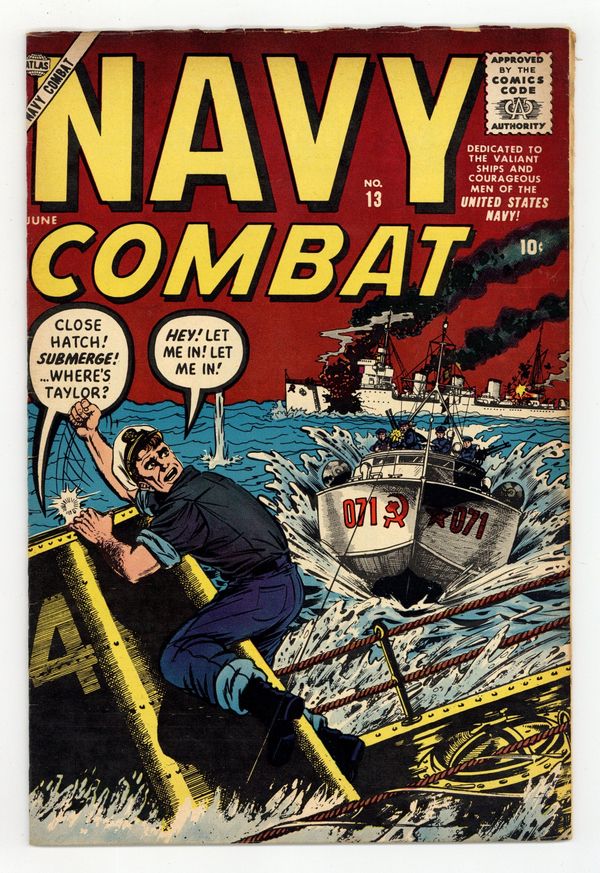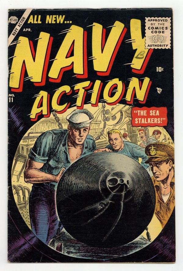 Battleship Burke in two stories, including "Two Sailors Against a Sub!" (art by Syd Shores); "Task Force" (art by Gene Colan), "Second Chance for Private Ruark!" (art by Paul Reinman), "The Sea Stalkers," and a two-page text story, "Sea Wolf." Joe Maneely cover. Title becomes Sailor Sweeney # 12-14. Cover price $0.10.