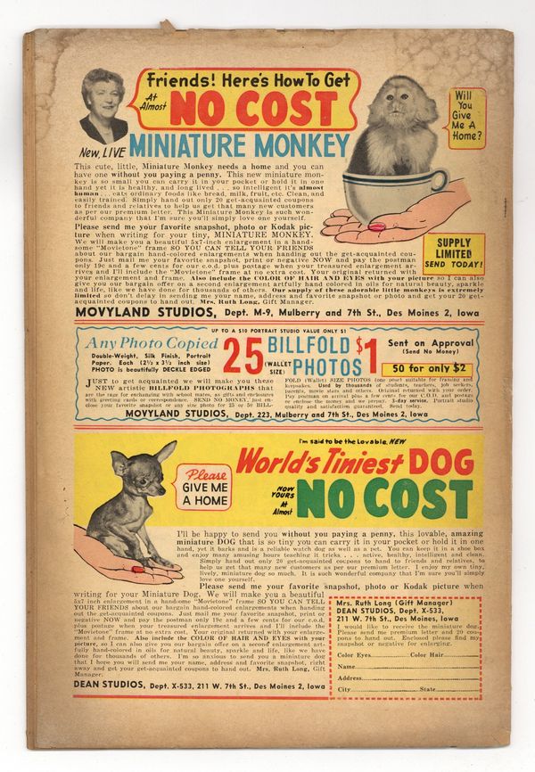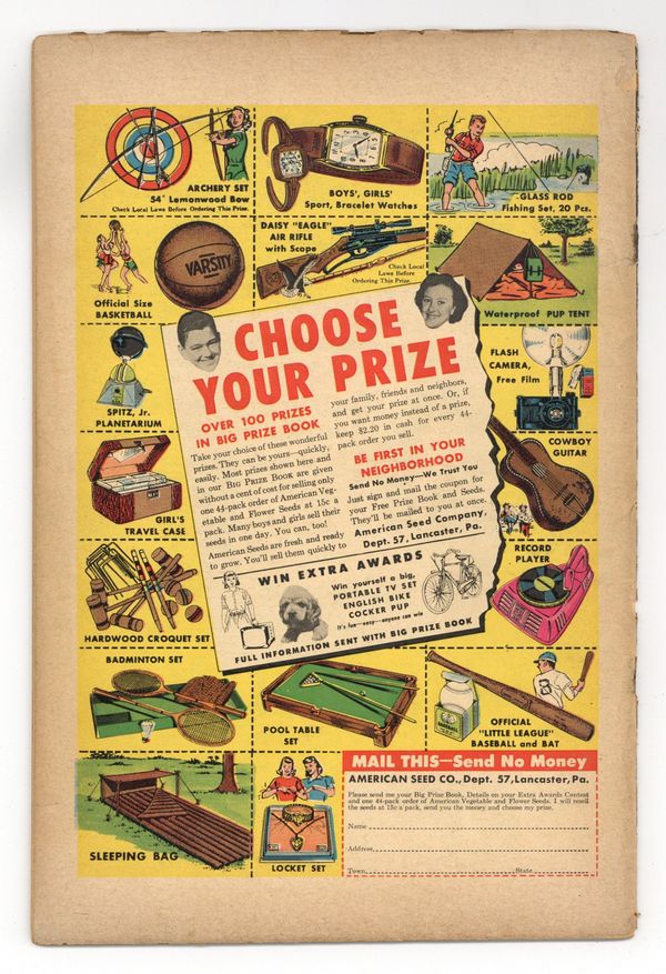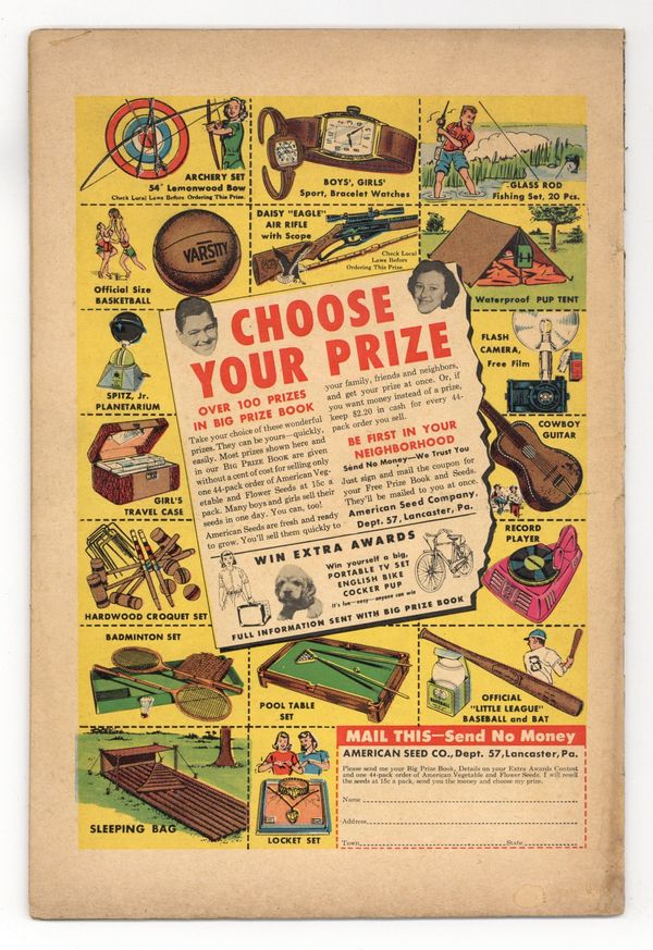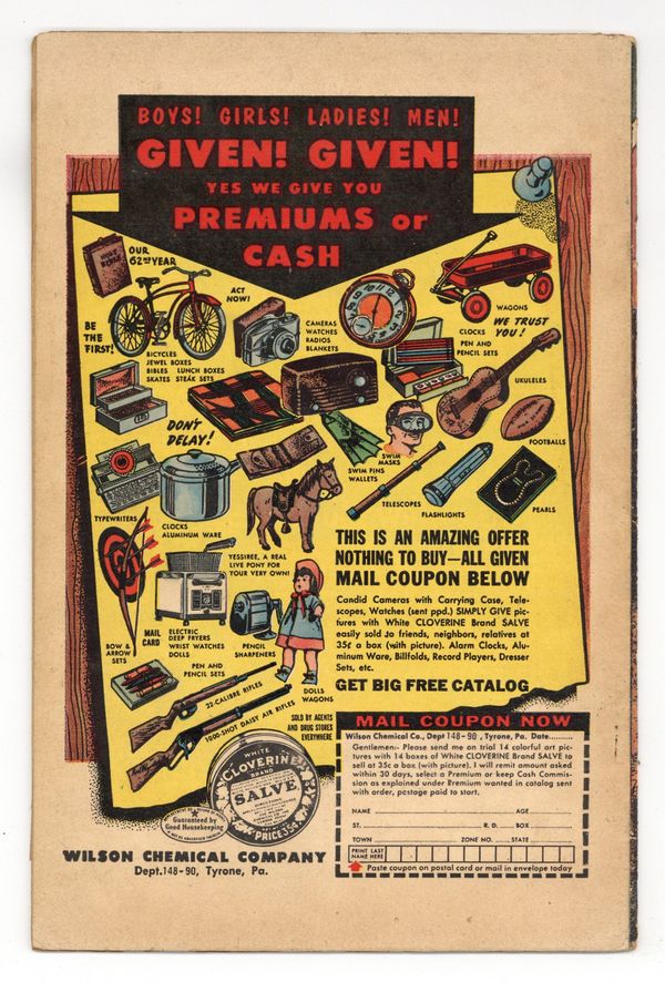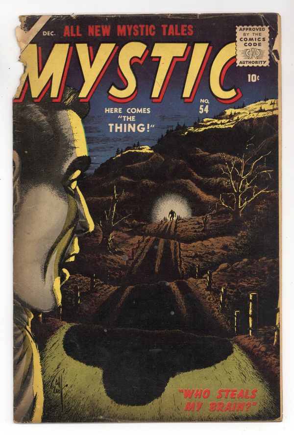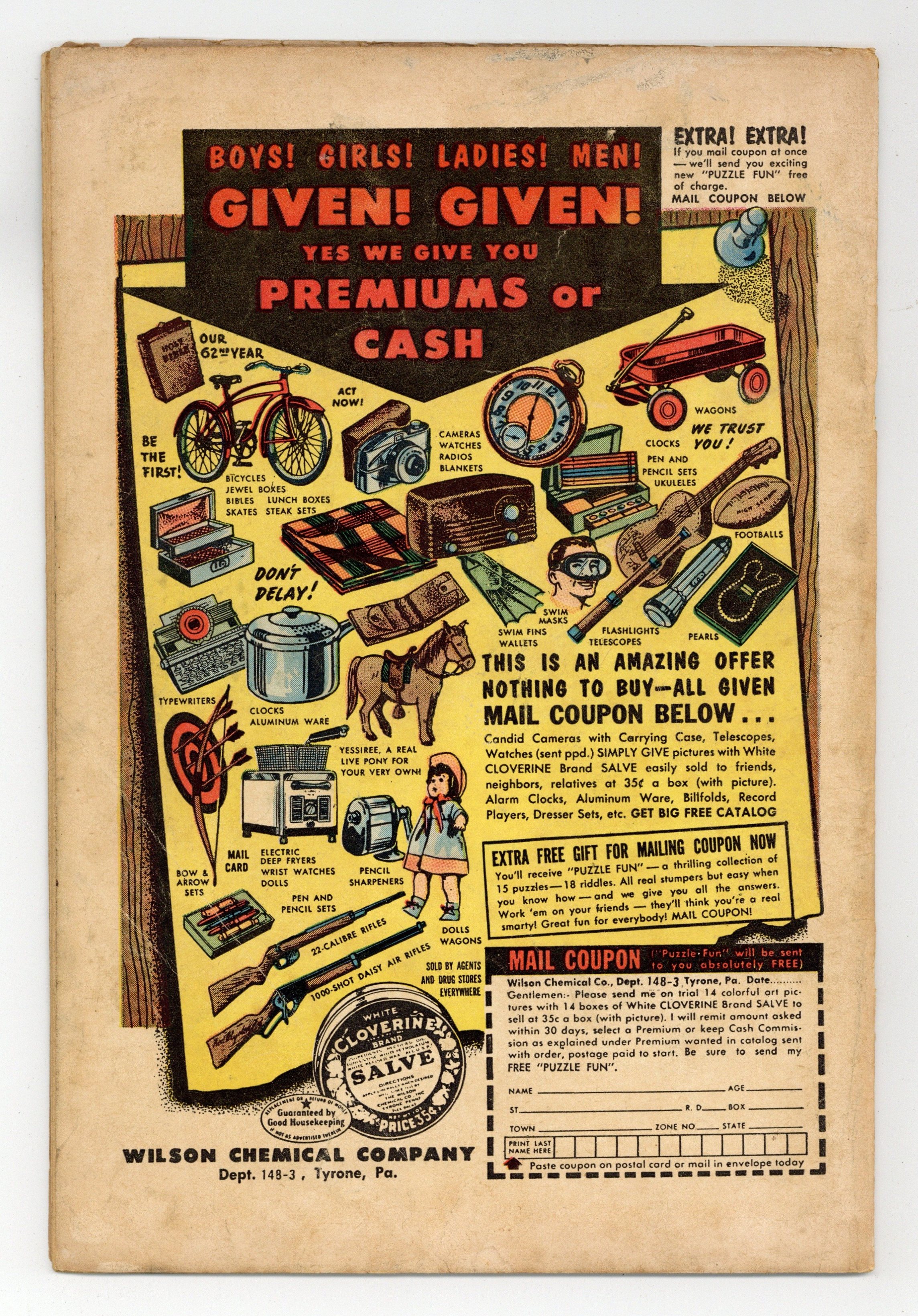 Cover by Bill Everett. Stories by Carl Wessler, Paul S. Newman and unknown. Art by Lou Cameron, Pete Morisi, Harry Lazarus, Bob McCarthy, Dave Berg and Manny Stallman. Tales of the unusual! In this issue: "Girl in a Trance" with art by Lou Cameron; "Prisoner in Nowhere" with art by Pete Morisi; "The Pushovers" by Carl Wessler and Harry Lazarus; "They're Coming Closer!" with art by Bob McCarthy; 2-page text story "Lost Marble"; "Behind the Mask" by Carl Wessler and Dave Berg; and "Torn and Tattered" by Paul S. Newman and Manny Stallman. 32 pages, full color. Cover price $0.10.