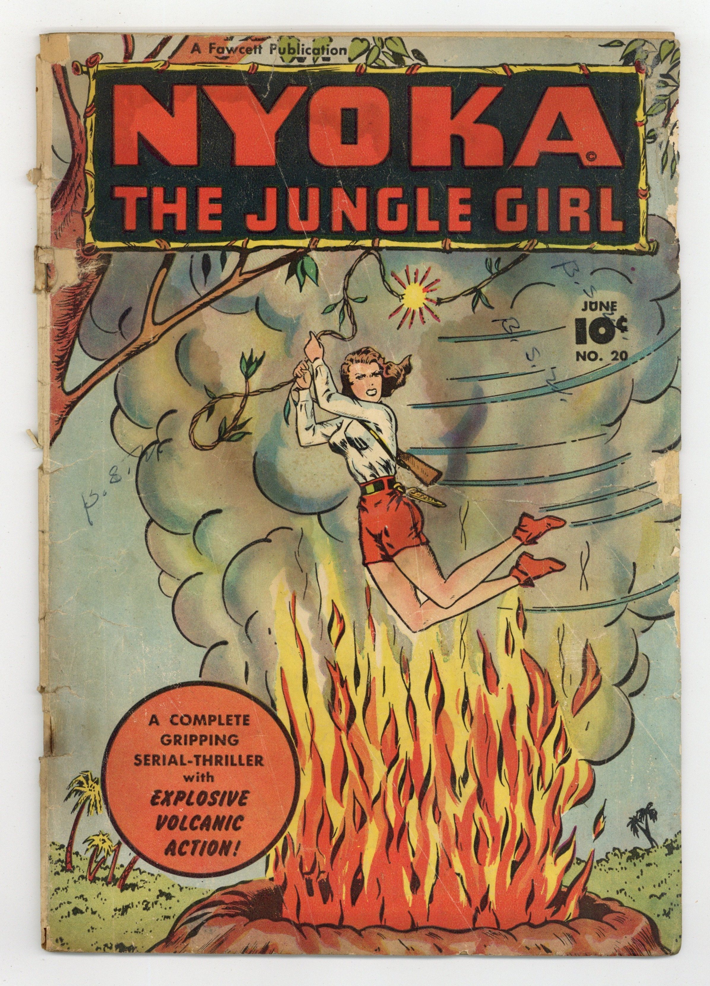 Stories and art by Bert Whitman and Howard Boughner. Raised in the jungle by her scientist father, Nyoka faces its dangers like no man ever could. In a two-part story, fortune hunters use murder and the legend of a "river god" to scare off natives from a platinum deposit in the jungle. But when Nyoka guides Dr. Livingston to the platinum, the body count goes up. Nyoka tries to figure out the connection between missing trophy heads and a diamond sought by masked criminals. Revenge of the River God, Part I: The Hidden Platinum; Feast of Death; Trader Tom; Part II: The Erupting Volcano; Nyoka's Jungle Quiz; Resourceful Renee; Chippy Chipmunk: A Teller's Tales; Acid-Tongue Andy; The Missing Heads. 32 pages, Full Color. Cover price $0.10.