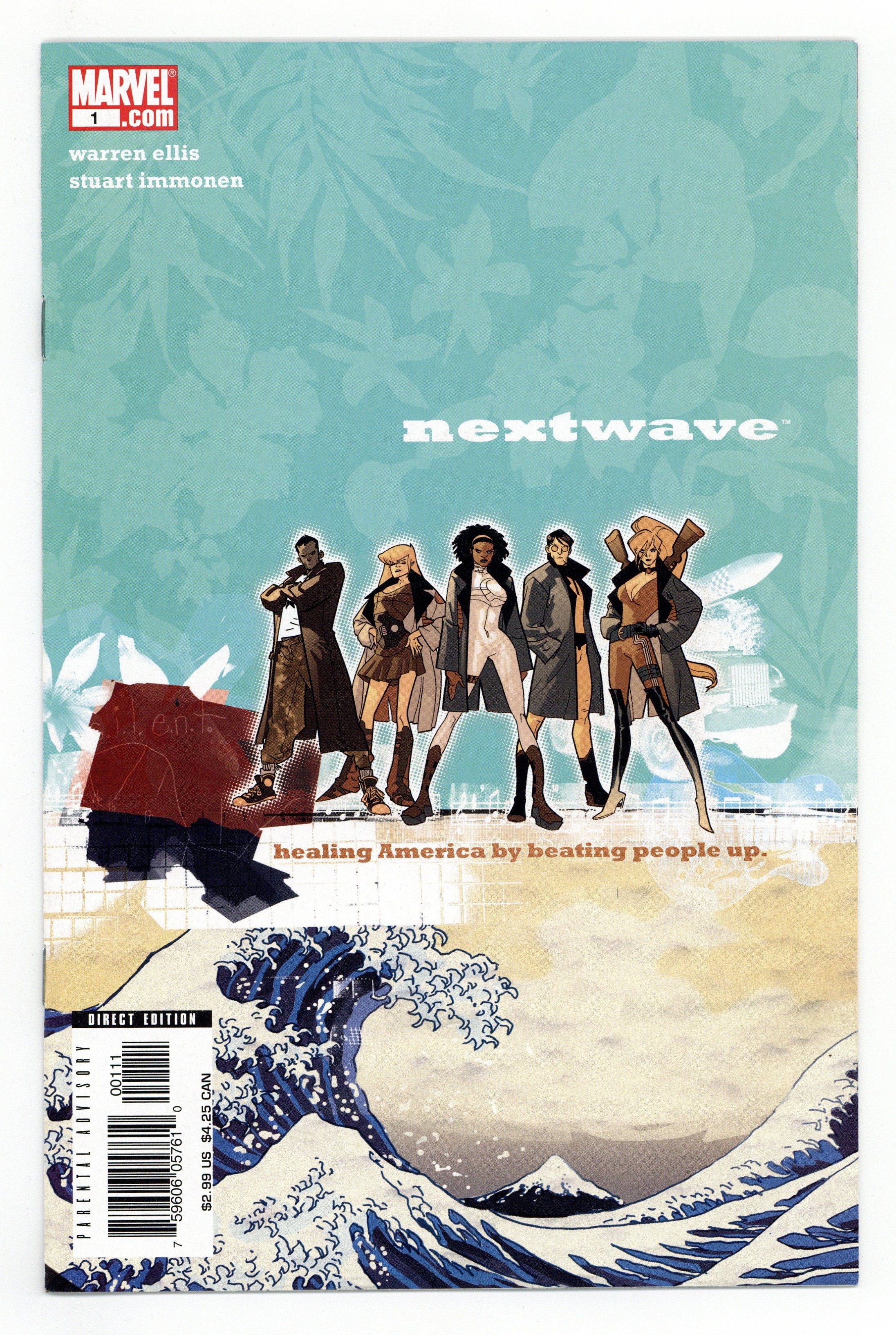 Written by WARREN ELLIS Pencils & Cover by STUART IMMONEN RRRAAAAAGGGGGHHHHH!!! Action! Excitement! Explosions! The Highest Anti-Terrorism Effort, or H.A.T.E. (a subsidiary of the Beyond Corporation©) put NEXTWAVE together to fight Bizarre Weapons of Mass Destruction. When NEXTWAVE discovers that H.A.T.E. and Beyond© are terrorist cells themselves and that the BWMDs were intended to kill them, they are less than pleased. In fact, they are rather angry. So they make things explode. Lots of things. Starring Monica Rambeau (formerly Captain Marvel and Photon), Aaron Stack (Machine Man), Tabitha Smith (X-Force's Meltdown), monster-hunter Elsa Bloodstone and The Captain! Guest-starring Fin Fang Foom!!! If you like anything, you will LOVE NEXTWAVE!!! BOOM!! Cover price $2.99.