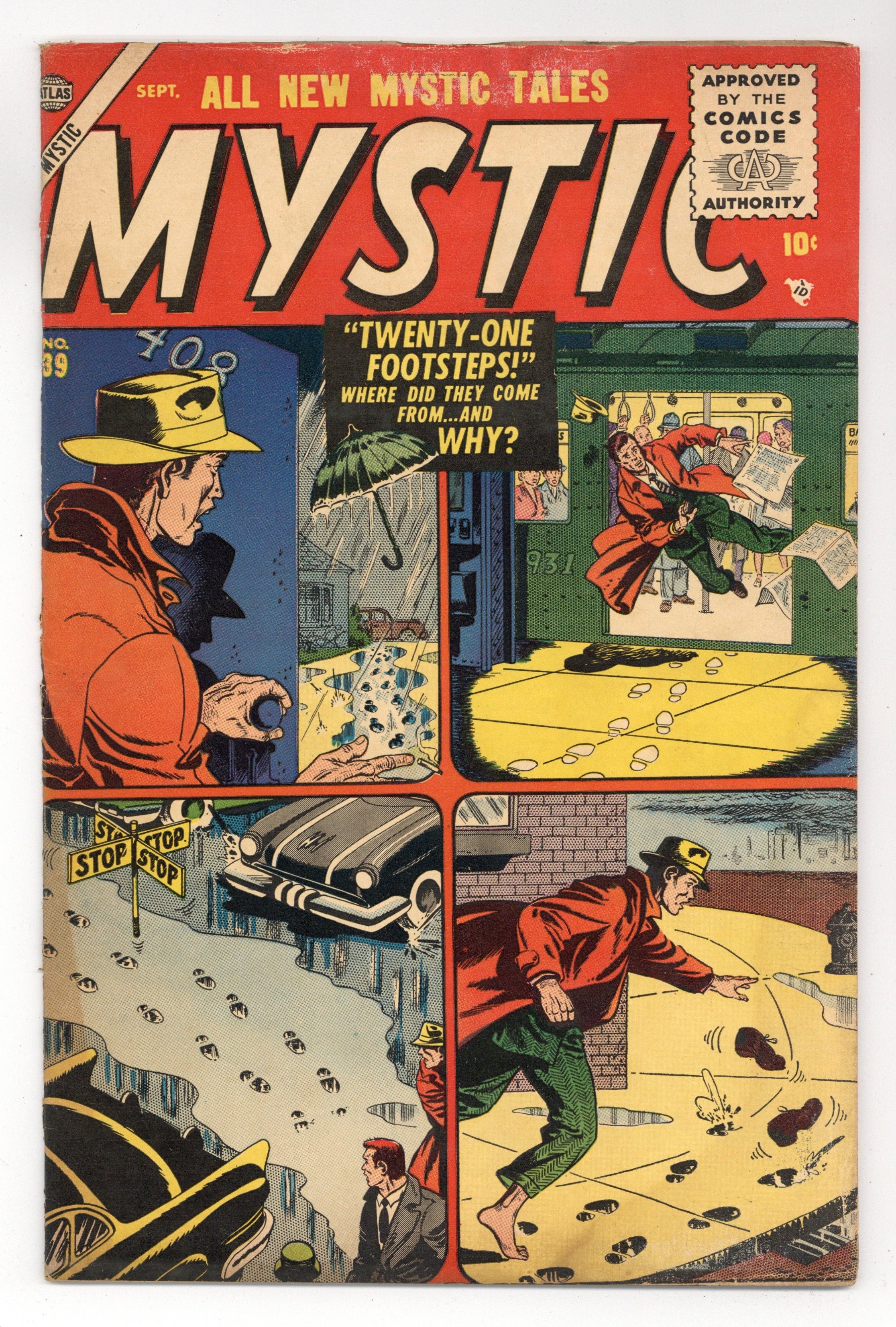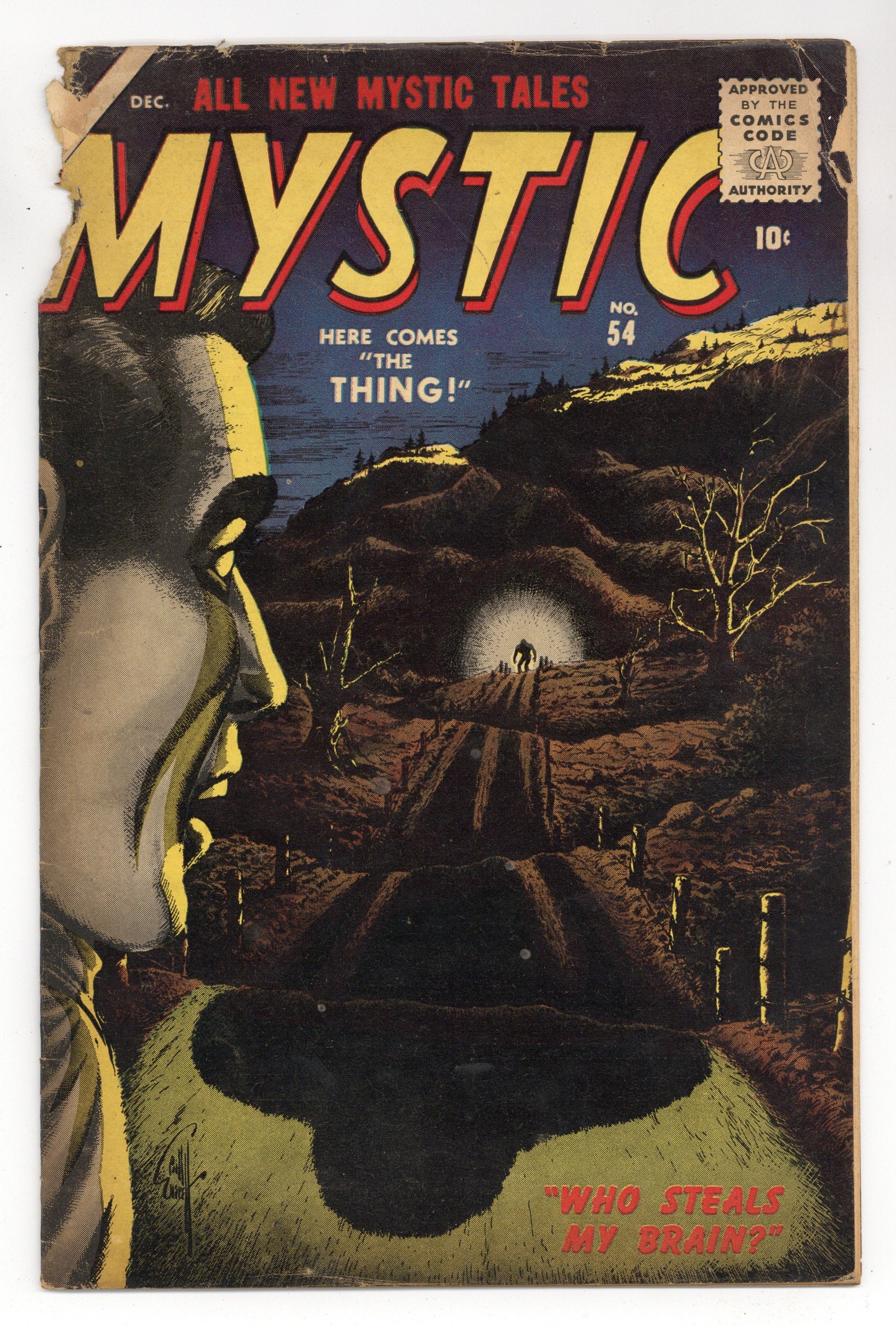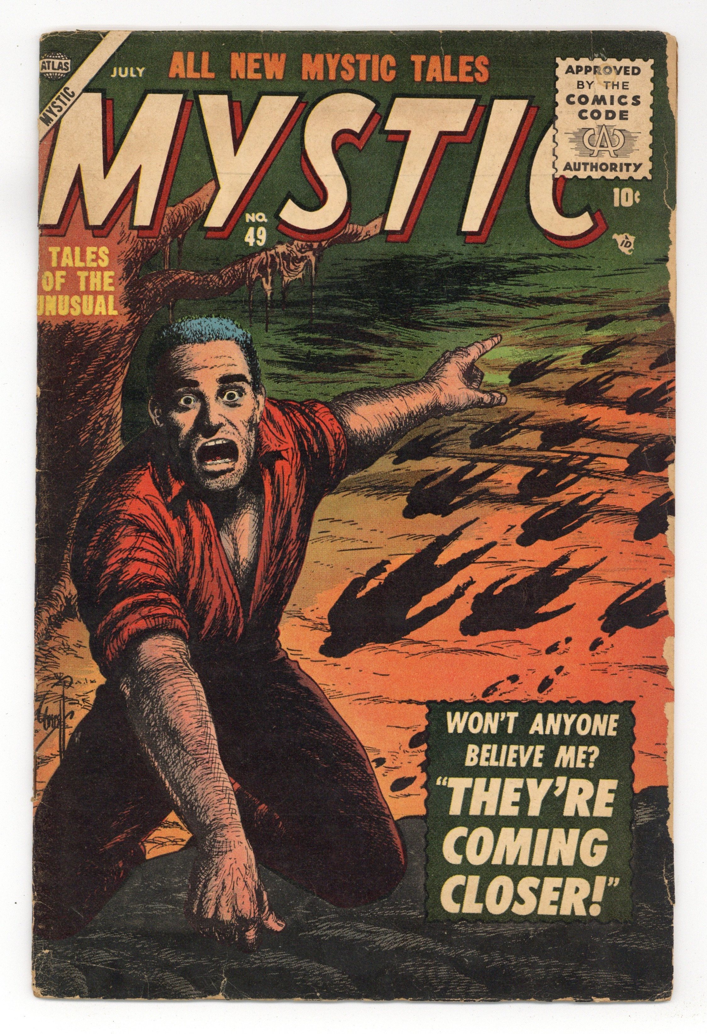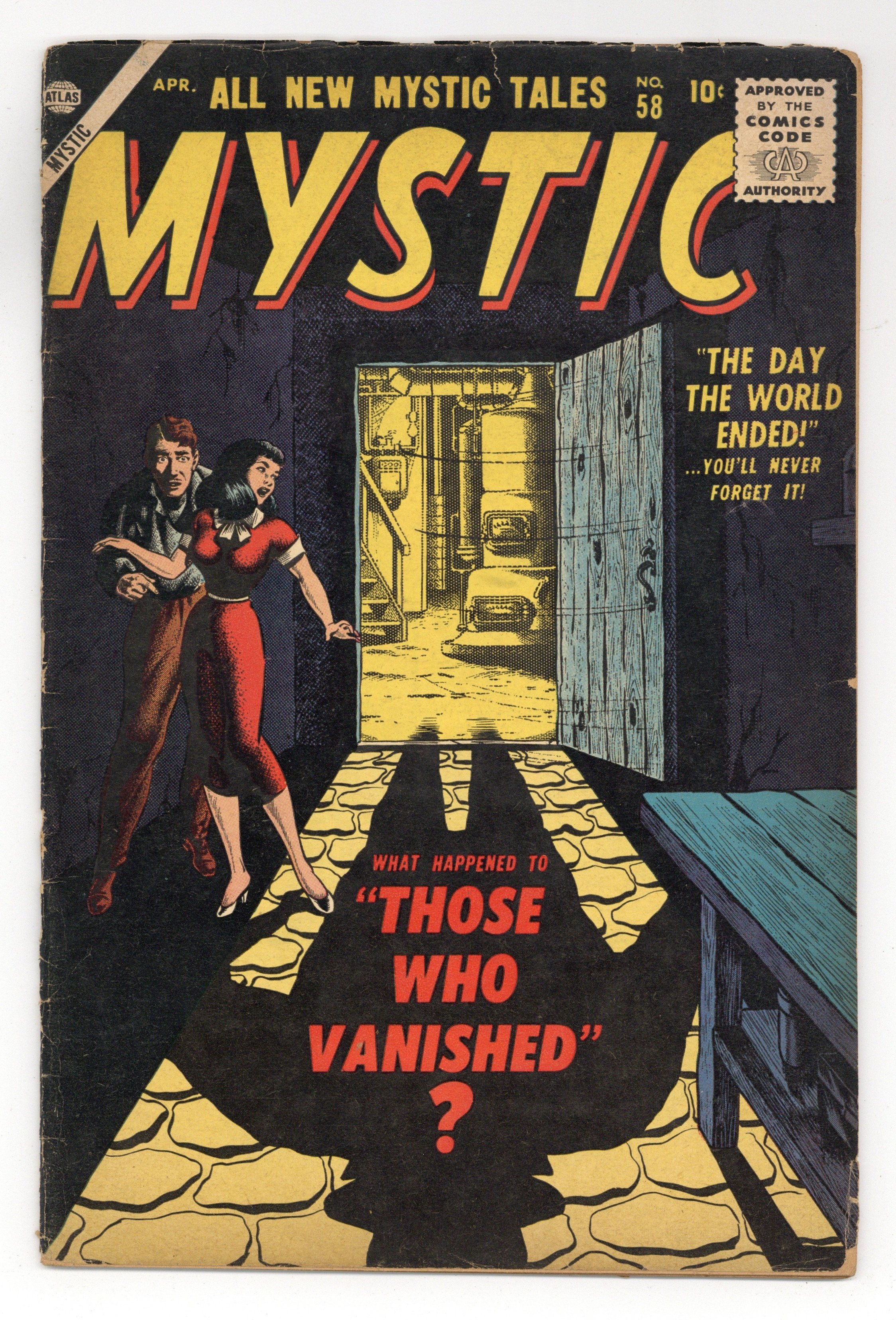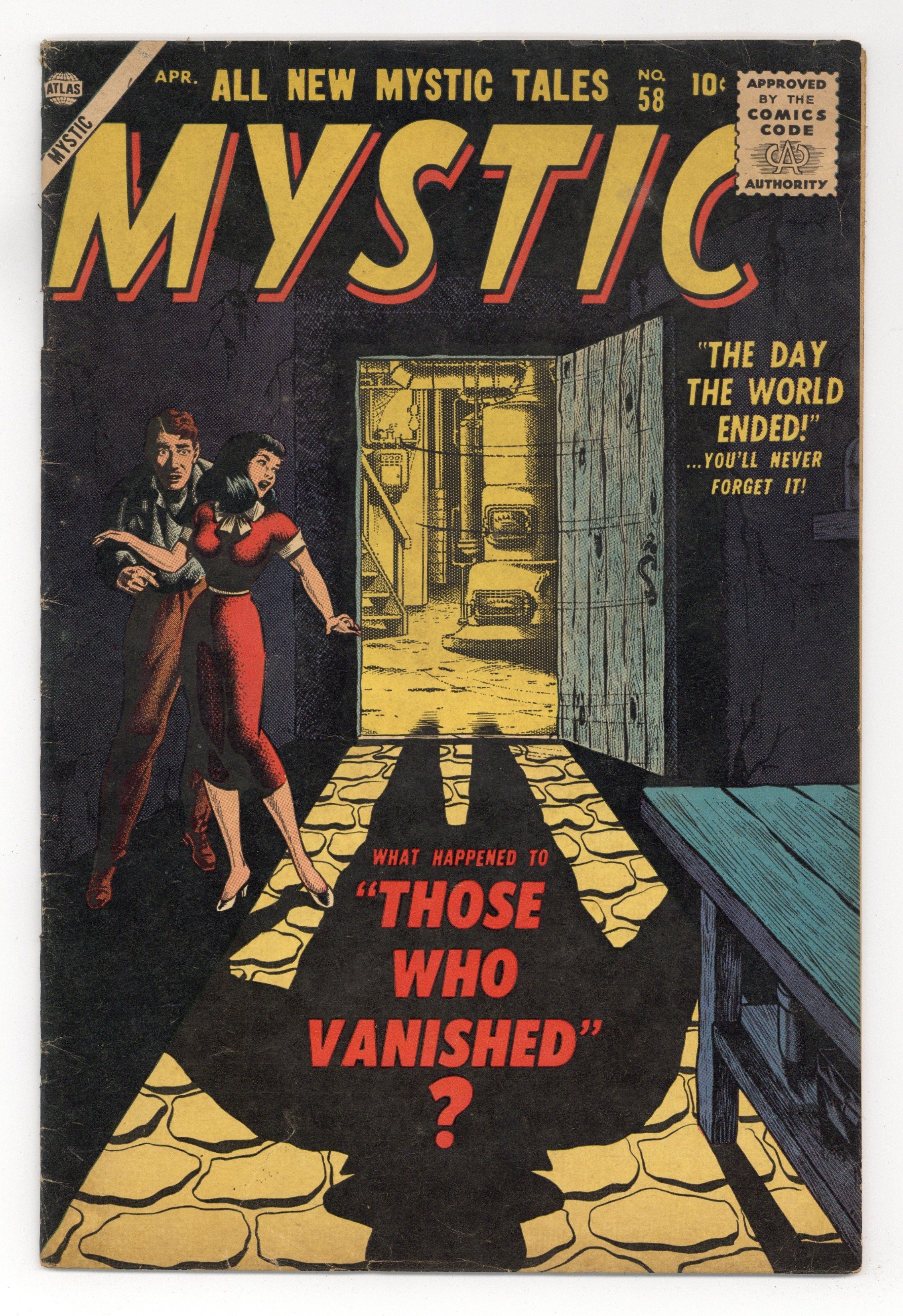 Cover by Bill Everett. Stories by Carl Wessler and unknown. Art by Richard Doxsee, Joe Maneely, Robert Q. Sale, Bernie Krigstein, Ed Winiarski and John Forte. Tales of the unusual! In this issue: "Those Who Vanish!" by Carl Wessler and Richard Doxsee; "The Straw Man!" with art by Joe Maneely; "The Day the World Ended!" by Carl Wessler and Robert Q. Sale; "Dinosaur" with art by Bernie Krigstein; "The Swami Strikes Back!" by Carl Wessler and Ed Winiarski; "Maha the Demon!" with art by John Forte; and 2-page text story "The Crystal Ball," reprinted from Strange Tales (1951-1976 1st Series) #43 (original title: "The Swami"). 32 pages, full color. Cover price $0.10.