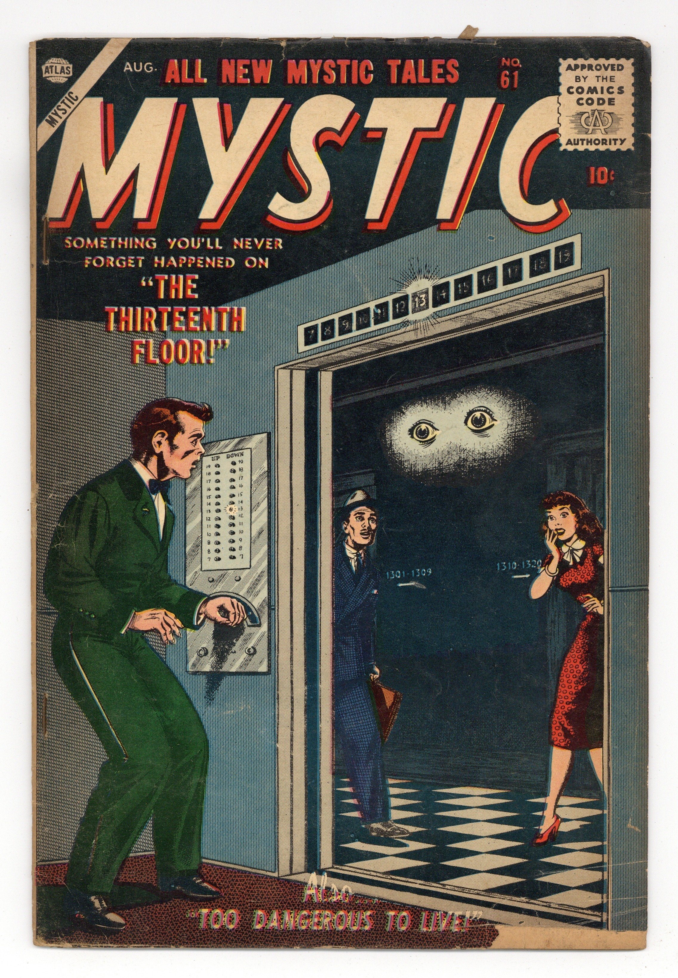 Someday It Will Open, art by Richard Doxsee; An anthropologist steals a "thought pod" from a native tribe and uses it to recreate himself at the age of twenty-one. The Thirteenth Floor; A hotel employee is the only one who perceives a ghost floor, number 13 that burned sixty years ago and was not rebuilt. Mister Backwards!, art by Frank Bolle; A man buys an hourglass that makes time flow backwards when he tips it upside down, but when he tries to destroy it, he becomes trapped inside. Too Dangerous to Live; A scientist behind the iron curtain creates an air purifier to counteract the poison of his first invention. Travelling Tom text story. The Strange Sea!, art by Alfonso Greene; When a sailor becomes lost at sea, he is saved by the ghost of his great grandfather, who was the captain of his own vessel. The Face in the Mirror!, art by Joe Orlando; A violent criminal is under the impression that his face is beginning to look like an animal after every time he hits a robbery victim. 36 pgs. $0.10. Cover price $0.10.