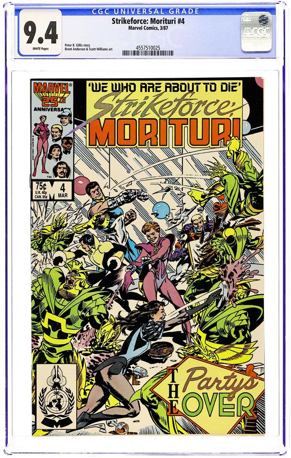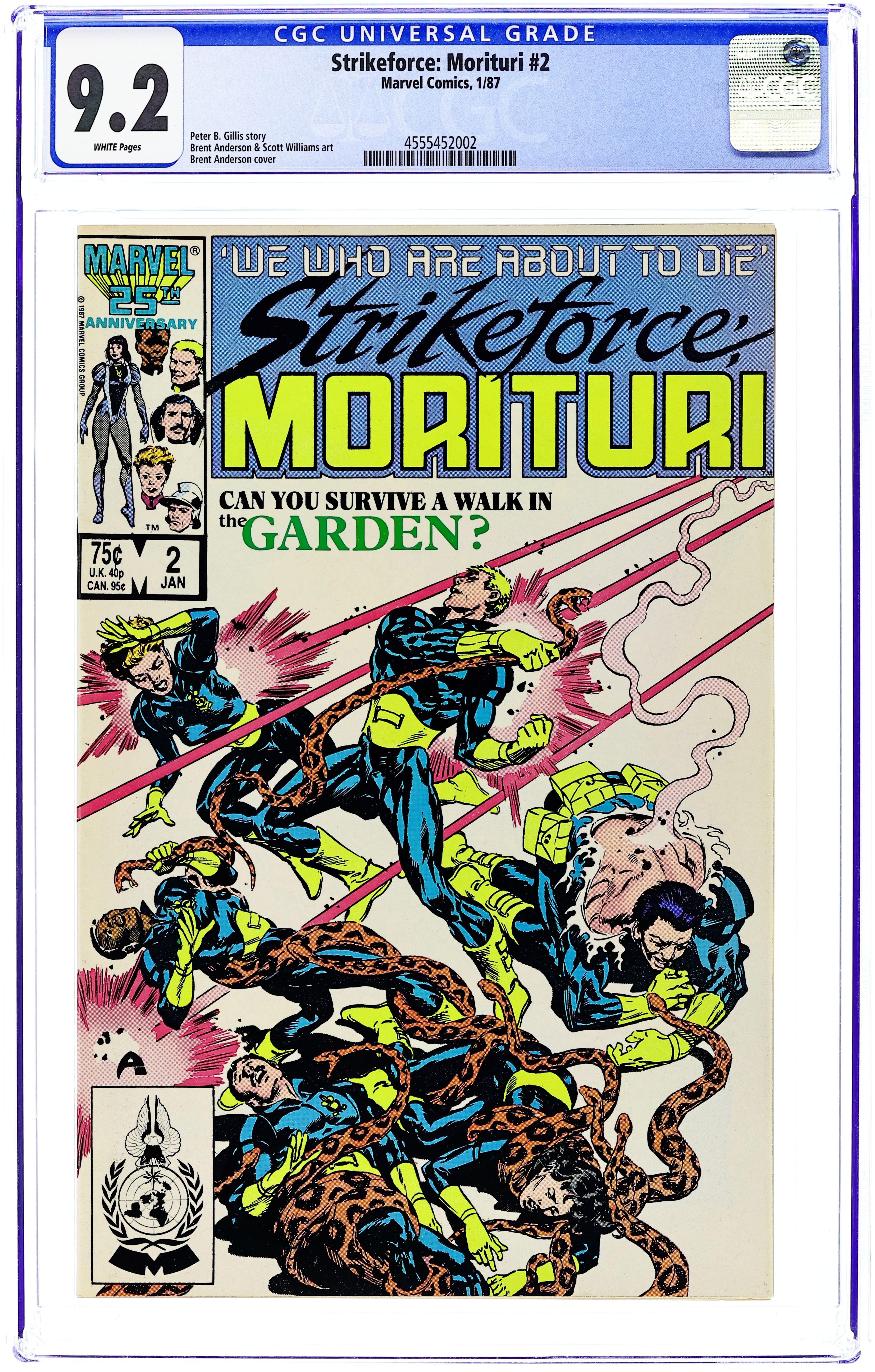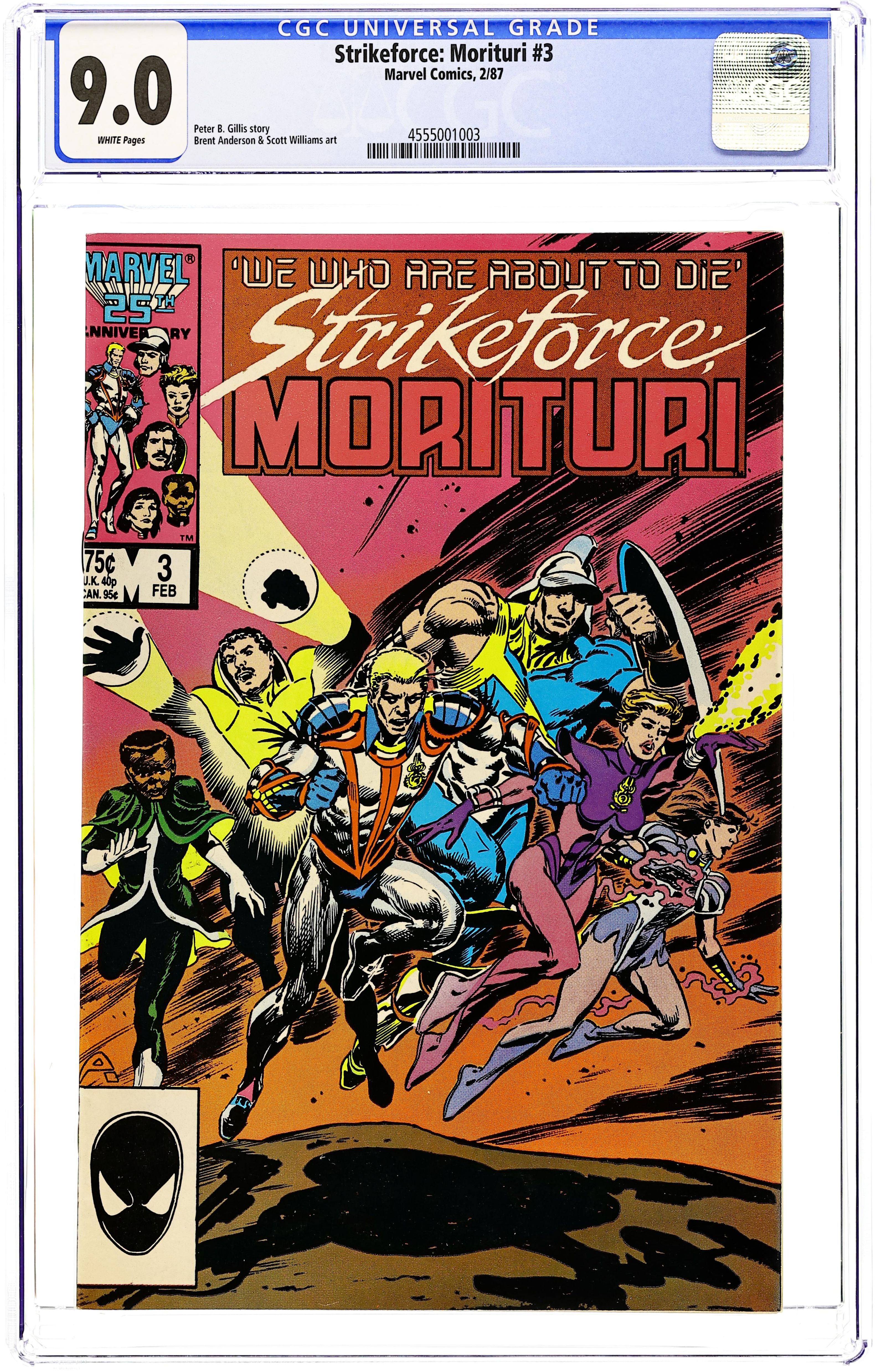 Direct Edition. Cover pencils by Brent Anderson. Black Watch: Though Some Have Named Thee So--, script by Peter B. Gillis, pencils by Brent Anderson (Wilce Portacio pg. 5, 6, 10), inks by Scott Williams; first appearance of Strike-Force Morituri!, a team that volunteers to become super-heroes to save Earth from aliens (knowing the transformation is fatal). 36 pgs. $0.75. Cover price $0.75.