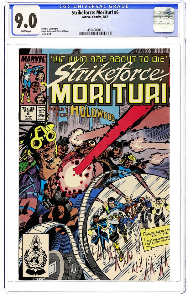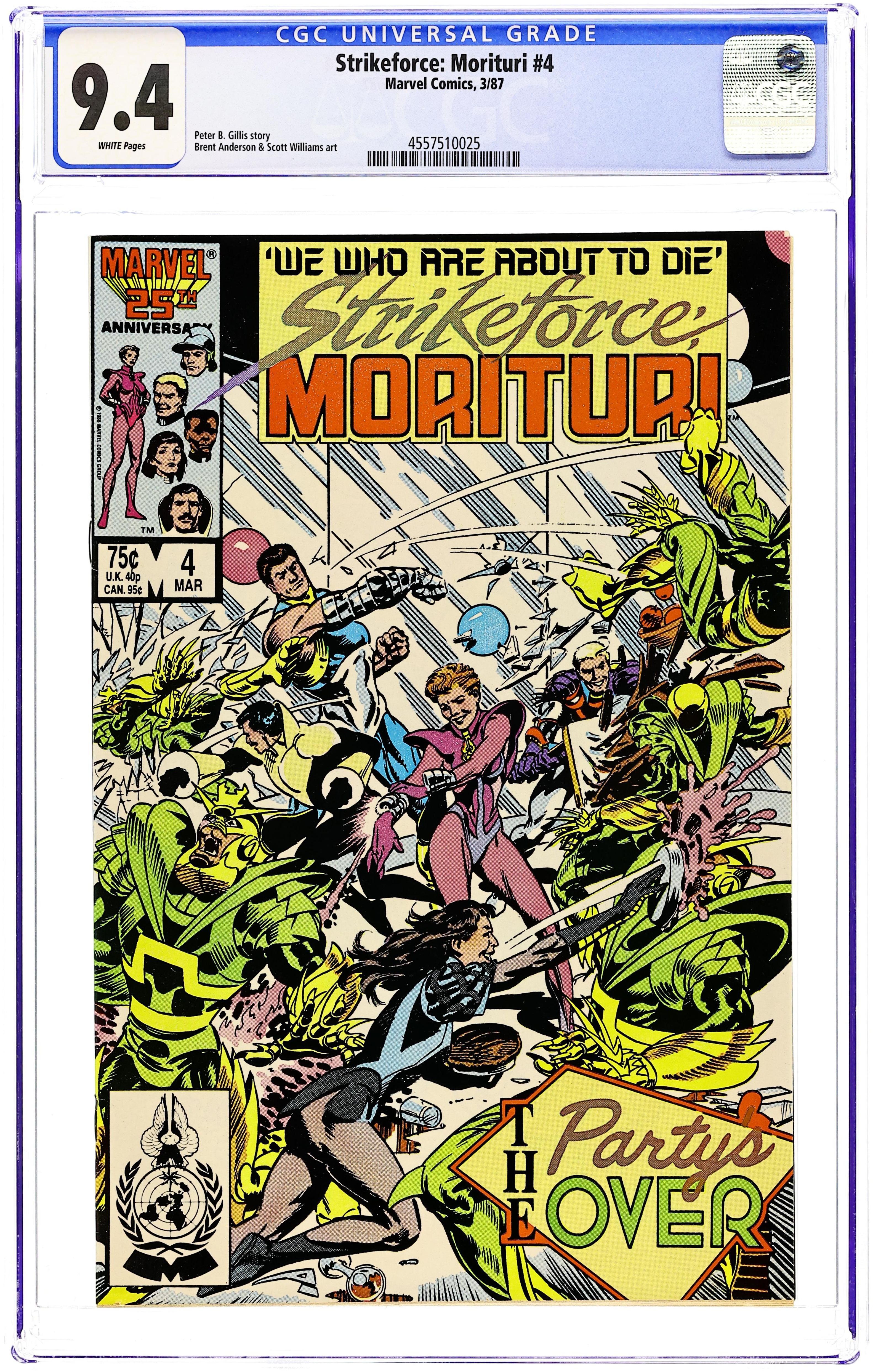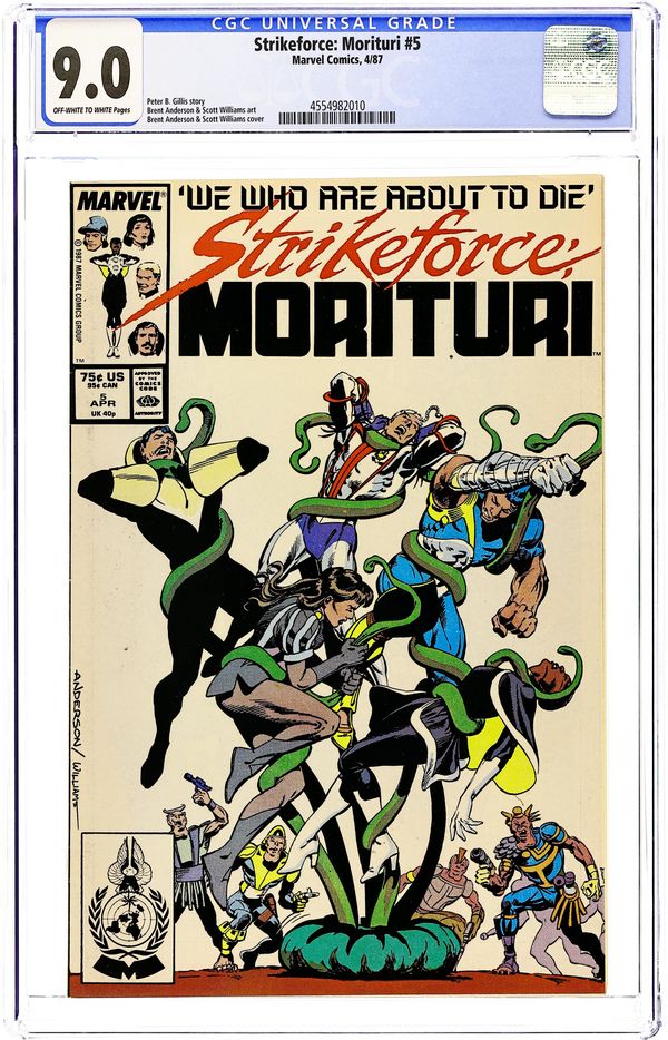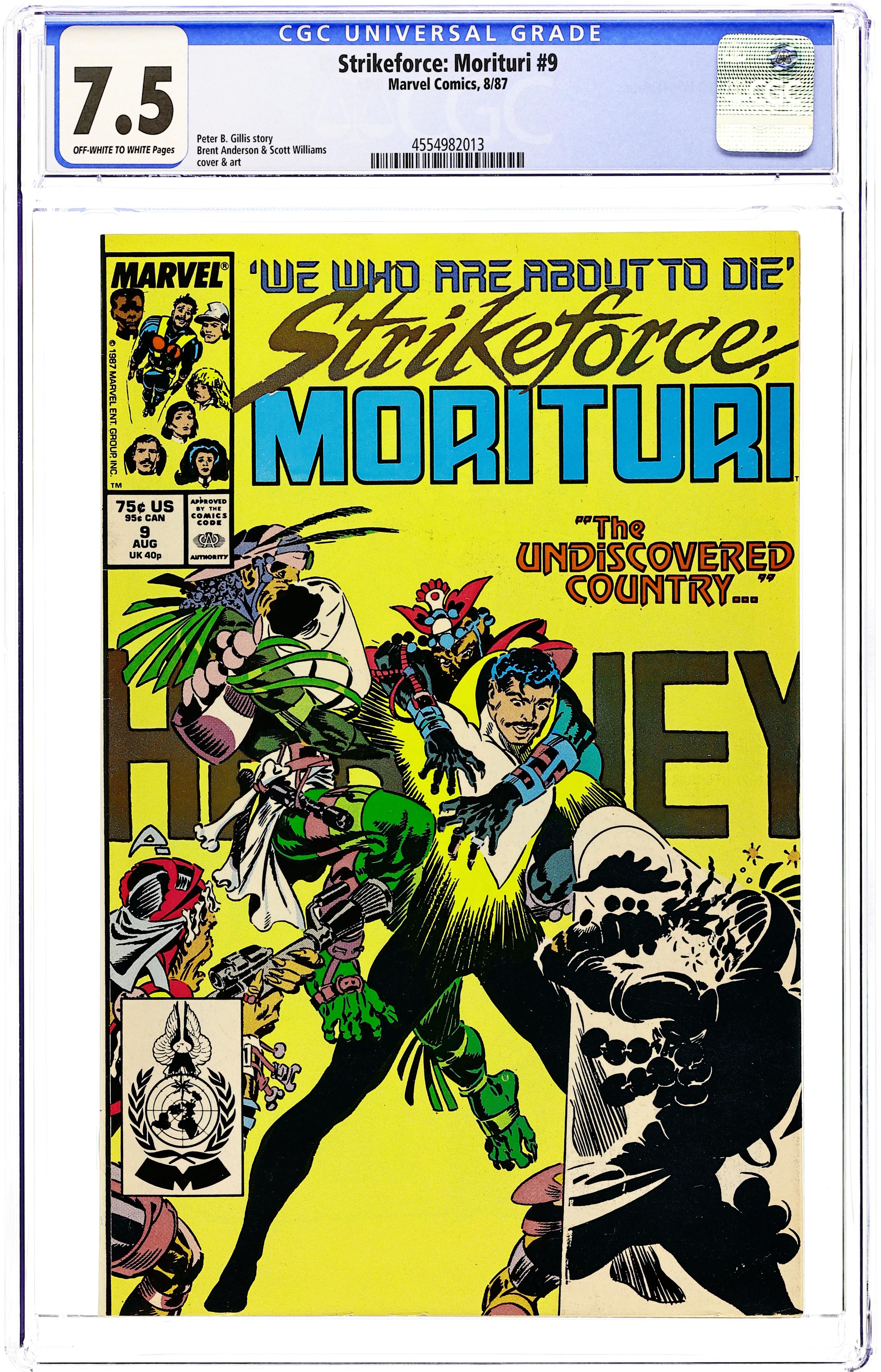 Direct Edition. Cover pencils by Brent Anderson. Black Watch: Though Some Have Named Thee So--, script by Peter B. Gillis, pencils by Brent Anderson (Wilce Portacio pg. 5, 6, 10), inks by Scott Williams; first appearance of Strike-Force Morituri!, a team that volunteers to become super-heroes to save Earth from aliens (knowing the transformation is fatal). 36 pgs. $0.75. Cover price $0.75.
