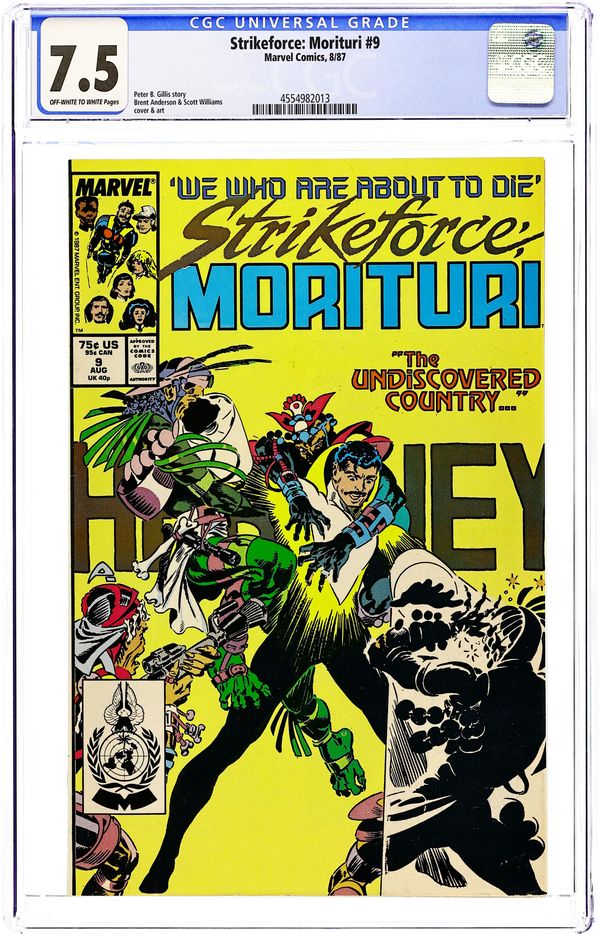 Newsstand Edition. Cover pencils by Brent Anderson. Black Watch: Though Some Have Named Thee So--, script by Peter B. Gillis, pencils by Brent Anderson (Wilce Portacio pg. 5, 6, 10), inks by Scott Williams; first appearance of Strike-Force Morituri!, a team that volunteers to become super-heroes to save Earth from aliens (knowing the transformation is fatal). 36 pgs. $0.75. Cover price $0.75.