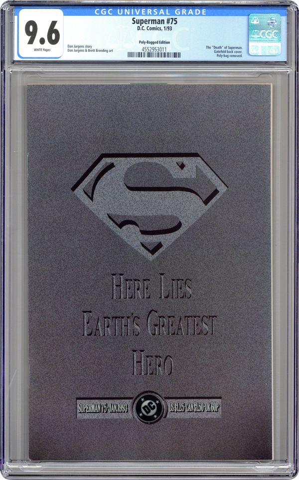 This is an unbagged version of Superman 75 Black Bag Memorial Edtion. 1st printing. Doomsday! Part 7 of 7. "Doomsday!" Story by Dan Jurgens. Art by Dan Jurgens and Brett Breeding. Here it is, the issue that rocked the DC Universe. An unstoppable force named Doomsday crash landed on Earth and has cut a swath of death and destruction across the country, all the way to Metropolis. Even the Justice League, the world's premiere super-team, was powerless before this creature's might. Now one man stands defiantly in Doomsday's way and vows that the creature's insanity stops here. Superman fights his strongest opponent to the death in the streets of Metropolis. NOTE: The event of "The Death of Superman" was so huge that it was reported on by the national media. - Odinson, Lonestar Comics Archivist Cover price $2.50.