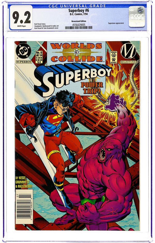Newsstand Edition. Worlds Collide: Part 3. "Changing Realities!" Guest-starring Superman. Story by Karl Kesel. Art by Tom Grummett and Doug Hazlewood. Story continued from Hardware (1993) #17. Superboy must face his biggest challenge yet when he goes toe-to-toe with the Parasite, a creature that has almost killed the Man of Steel on several occasions. Plus, Superboy meets Fred Bentson from the Milestone Universe in this special crossover event. Story continues in Icon (1993) #15. Cover price $1.50.