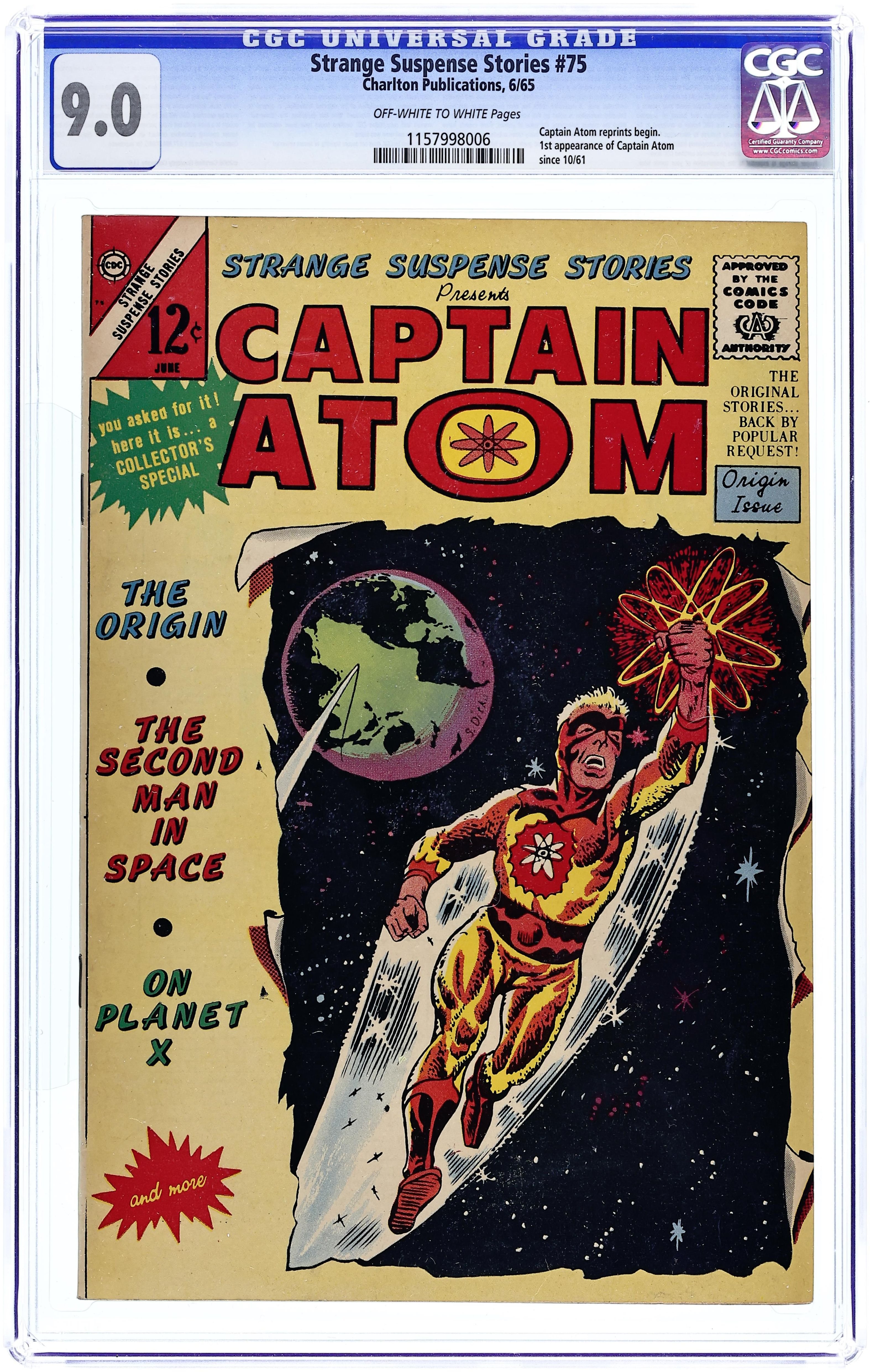 Cover art by Steve Ditko. Edited by William Anderson and Pat Masulli. "Introducing Captain Atom," script by Joe Gill, art by Steve Ditko; When Captain Adam is trapped in an atomic rocket, Captain Atom is born; Captain Atom goes on to stop some enemy agents who had sabotaged a Jupiter Rocket. "The Magic Box" text story. "The Ghost of Amy Rector" one-page story, inks by Ernie Bache. "Captain Atom on Planet X," art by Steve Ditko; Captain Atom guards a new orbital satellite from enemy missiles. "The 2nd Man in Space," art by Steve Ditko; Captain Atom goes into space to check on the first Russian cosmonaut and finds himself helping save the Russian. "Out of this World," art by John Severin. 36 pgs., full color. Cover price $0.12.