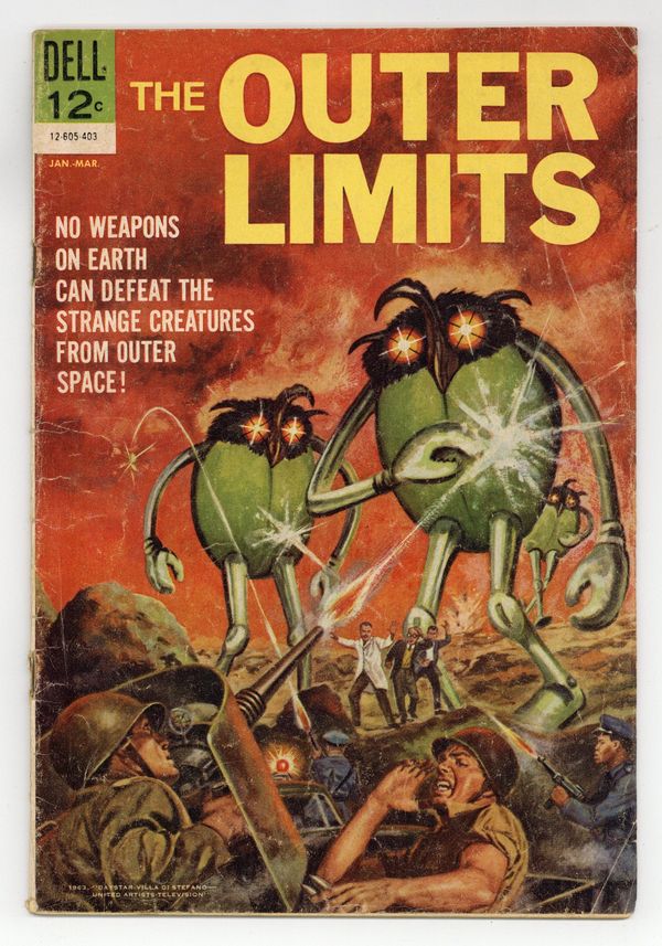 Painted cover by Vic Prezio. Stories by Paul S. Newman. Art by Jack Sparling. Cover number is 12-505-403. Battleground of Monsters. Like the Twilight Zone, but more science fiction than fantasy, The Outer Limits chilled 1950s TV audiences with tales of what-if featuring twist endings. A century's worth of missing-persons reports are explained when aliens arrive on Earth to suggest a sort of cosmic prisoner exchange. But although the first aliens are benevolent, the ones that come after them... are not. 32 pages, Full Color. Cover price $0.12.
