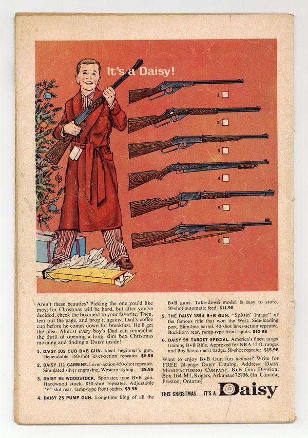 Painted cover art by George Wilson. "The River Pirates," script by Bill Harris, art by Bill Lignante; Pirates burn and loot all along a river that is under Phantom protection; With the help of a native guide the Phantom first terrorizes and then captures the pirates; He and the guide march them along the route of their depredations, forcing them to rebuild, then turn them over to the Jungle Patrol. Cheerios ad featuring Rocky and Bullwinkle. "The Secrets of the Pearl Pool," art by Al Micale; Strange greenish pearls drive Track Hunter mad. Oloo saves him by dynamiting the pearl bed. Jungle Oddities fact page, art by Frank Thorne. "The Tournament," script by Bill Harris, art by Bill Lignante; An escaped con steals a uniform from the Phantom, then blunders into an annual tournament without understanding the local language. When a Wambezi wrestler beats "the Phantom," the wrestler becomes ruler of the jungle for a year, appalling all the elders. Daniel Boone Log Cabin ad. "Prehistoric Americans, Number 11: The Mesa Dwellers" Keys of Knowledge page, art by Joe Certa. Painted front cover. # on cover 10014-512 December. #15 12/65. 36 pgs., full color. Cover price $0.12.