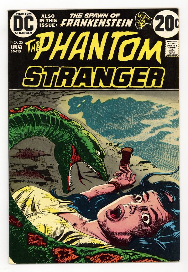 Cover art by Nick Cardy. "Dr. Zorn: Soul-Master," script by Arnold Drake, art by Gerry Talaoc; When the Phantom Stranger is present when a famous musician goes mad during one of his performances, he follows him to his doctor: Matthew Zorn. Zorn has a very famous clientele including celebrities and military personnel; The Stranger feigns illness so that he can go and see the doctor, and is given one of his special "medicines" which creates a powerful hallucination in which Phantom Stranger is ruler of the world; Shaking off the effects of the drugs, Phantom Stranger decides to investigate further. "The Terror and the Compassion," script by Steve Skeates, art by Bernard Baily; The Spawn of Frankenstein awakens from a dream to find a young woman about to be raped by her date; The Spawn scares the man and woman, and carries the fainted woman to safety; However, the man revives and tries to run down the Spawn, but the monsters strength and durability only ends up wrecking the car and not harming the monster; When the girl revives from her spell, she flees the monster and tries to get away, she ends up running into a cult who wishes to use her as a sacrifice in one of their black masses. 36 pgs., full color. Cover price $0.20.