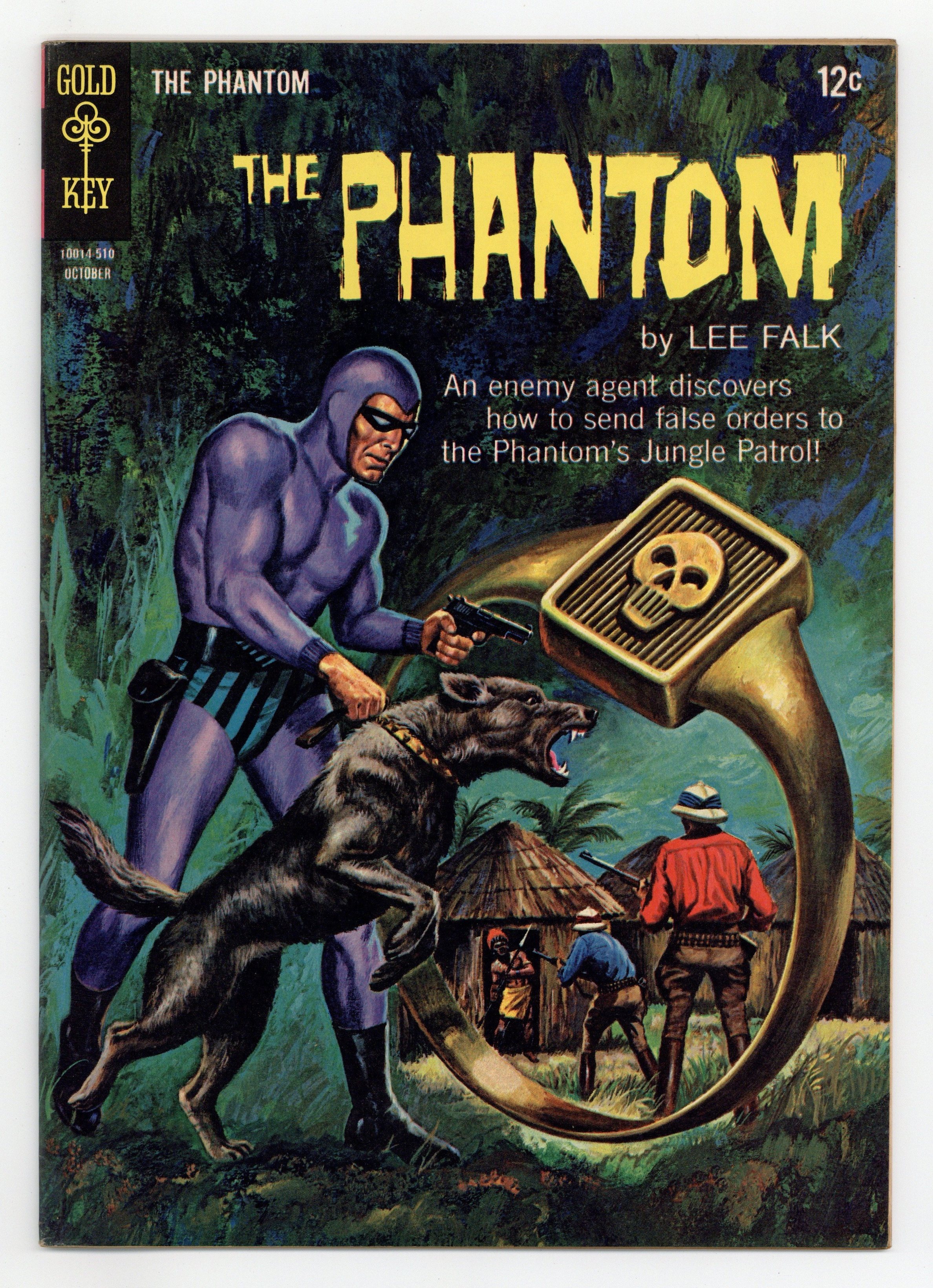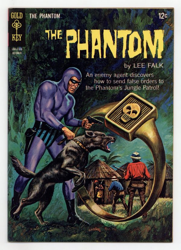 Painted cover art. "The Historian," script by Bill Harris, art by Bill Lignante; Heg manipulates Smith and Jade in order to deliver false messages ordering the Jungle Patrol to stand down; The Phantom captures Heg and his boss and sets things right, never revealing that he is the unknown commander. Cheerios ad featuring Rocky and Bullwinkle. "Safari Into the Unknown"; Track Hunter and Oloo investigate a legend of pigmy lions and elephants, but discover that the stories arise from eating hallucinogenic mushrooms. "Grandpa," art by Bill Lignante; Appalled that his granddaughter loves a mysterious masked cave-dweller, Grandpa ushers a parade of eligible bachelors through her life--which shocks the Phantom when he arrives unannounced for a visit; When Bob and Diana are attacked by grizzly bears while hunting, Bob valiantly defends her, but it's the Phantom who kills one bear and drives off another. Advertisement for Phantom Revell model kit on inside front cover. Number on cover 10014-510. 36 pgs., full color. Cover price $0.12.