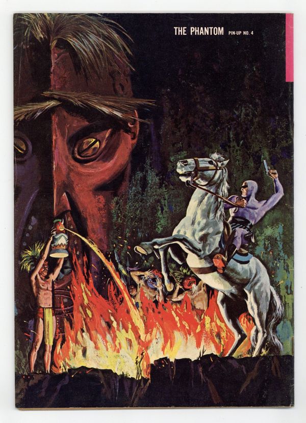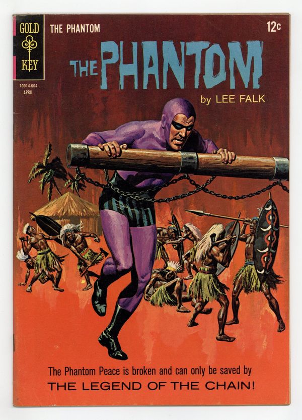 Painted cover art by George Wilson. "The Skull Cave," art by Joe Certa; one-page description of Skull Cave. "The Chain," script by Bill Harris, art by Bill Lignante; Disgusted at repeatedly needing to negotiate peace between warring groups, the Phantom gives up; Elderly Wuru tells the story of how the Phantom's mother-to-be Maude was kidnapped by an arrogant prince, who then captured the Phantom's father-to-be and set him to continuously working a pump to water the pigs; That Phantom allowed his chain to scrape over stone until he could break free, capture the prince, and free Maude. "The Champ," art by Bill Lignante; One-pager about the young Phantom growing up in the U.S. "The Milk Drinker" one-page story, art by Bill Lignante; Walking the town as an ordinary man, the Phantom orders milk in a bar. "The Ghost Hunter," art by Al Micale; Track Hunter and Oloo stalk a mysterious glowing hunter who once a year slaughters animals and then raises them from the dead; He turns out to be a game warden using tranquilizer darts. "The Crescent Cult," script by Bill Harris, art by Bill Lignante; The Phantom saves the newly-crowned queen, and suppresses an ancient cult of assassins. "The Diggers" one-page story, art by Bill Lignante; The Phantom orders that an archeological party be surreptitiously protected; They are astonished to find a 300 year-old portrait apparently of the Phantom—the Ghost Who Walks, who cannot die. Painted front cover. # on cover 10014-604 April. #16 4/66. 36 pgs., full color. Cover price $0.12.