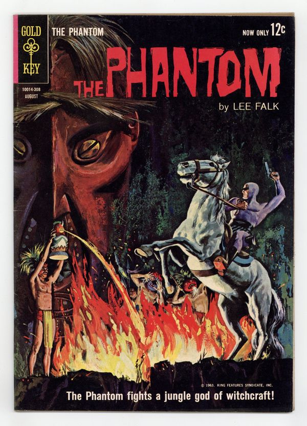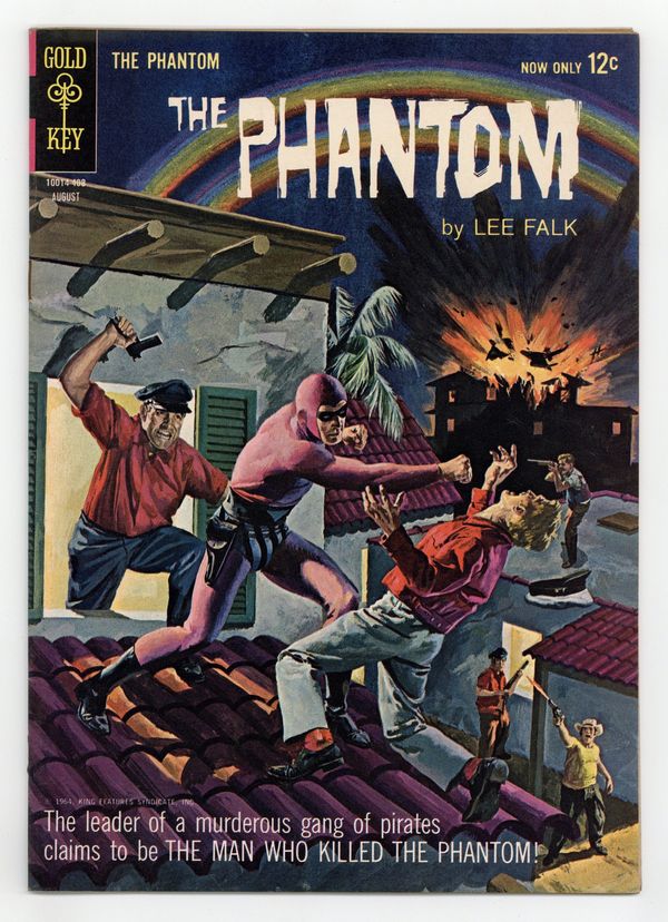 Painted cover art by George Wilson. "Wild Animals of North America, Number 4: Raccoons" Keys of Knowledge page, art by Joe Certa. "The Belt," script by Bill Harris, art by Bill Lignante; The current Phantom's father was betrayed and murdered by an informant while acting against the Singh pirates; The current Phantom learns that the pirates have turned mostly to smuggling, gambling, and extortion under the leadership of Rama, who claims to have killed the Phantom, and who displays his belt and pistols as proof. "Ivory, Ivory, Everywhere," art by Bill Lignante; The four friends participate in controlled hunting, but Jack is knocked out and dreams of fabulous riches from the ivory in the elephant graveyard; King and Queen explain that unwell elephants usually expire when unable to arise from rivers, which is why their massive carcasses...and their tusks...are rarely found. "Prehistoric Animals, Number 4: The Dinosaurs" Keys of Knowledge page, art by John Celardo. Painted back cover art by George Wilson. # on cover 10014-408 August. #8 8/64. 36 pgs., full color. Cover price $0.12.