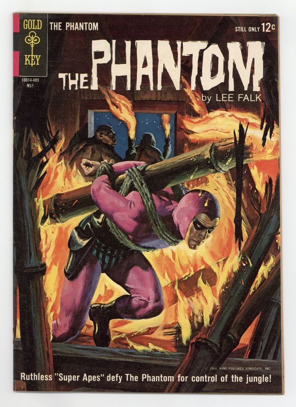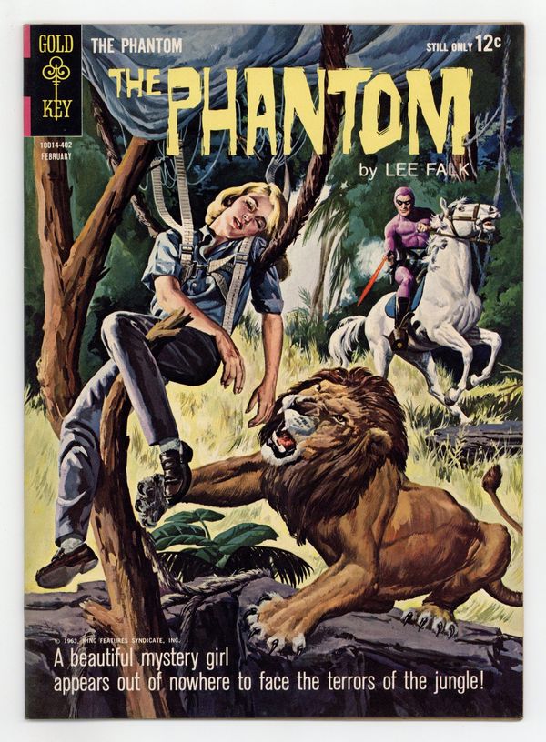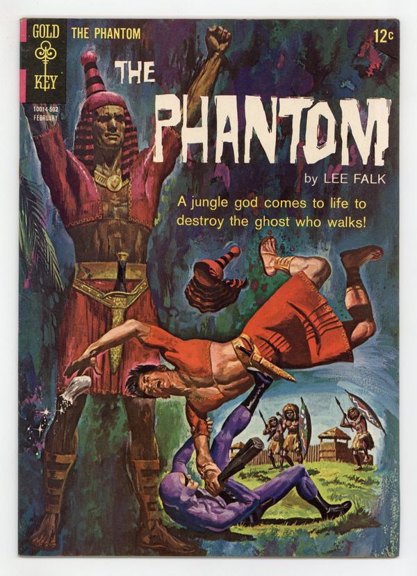 Painted cover art by George Wilson. "The Sleeping Giant," script by Bill Harris, art by Bill Lignante; Joe Gagnon finds diamonds at the floor of a huge statue of Tuamotu, giant god of the Itongo; Driven away, he finds startlingly-tall circus performer Idaho, whom he disguises as Tuamotu so as to gain access to the diamonds and lead raids on the neighbors, until the Phantom fights Idaho and easily vanquishes him. "The Cave of Kings, Part I," art by Bill Lignante; The three friends investigate a jungle legend of a fierce monster lurking in a cave, only to be taken by surprise themselves in a cliffhanger ending to Part I. "The Patrol," script by Bill Harris, art by Bill Lignante; Brown hides in the restricted room where the Jungle Patrol's commander (the Phantom) leaves his written orders, hoping for a glimpse of the unknown commander. "Weapons and Warfare, Number 1: Ancient Weapons" Keys of Knowledge page, art by Joe Certa. # on cover 10014-502 February. #10 2/65. 36 pgs., full color. Cover price $0.12.