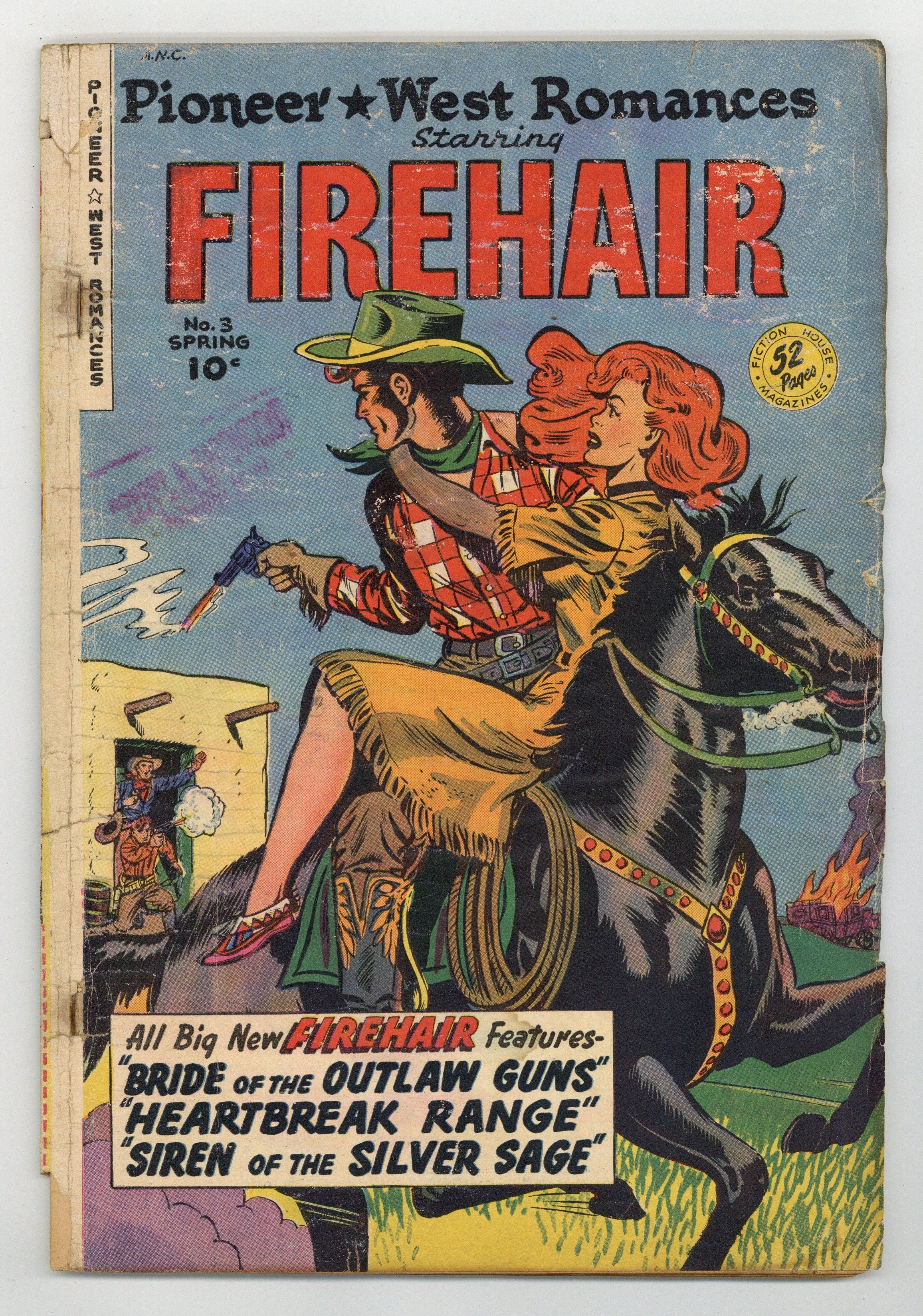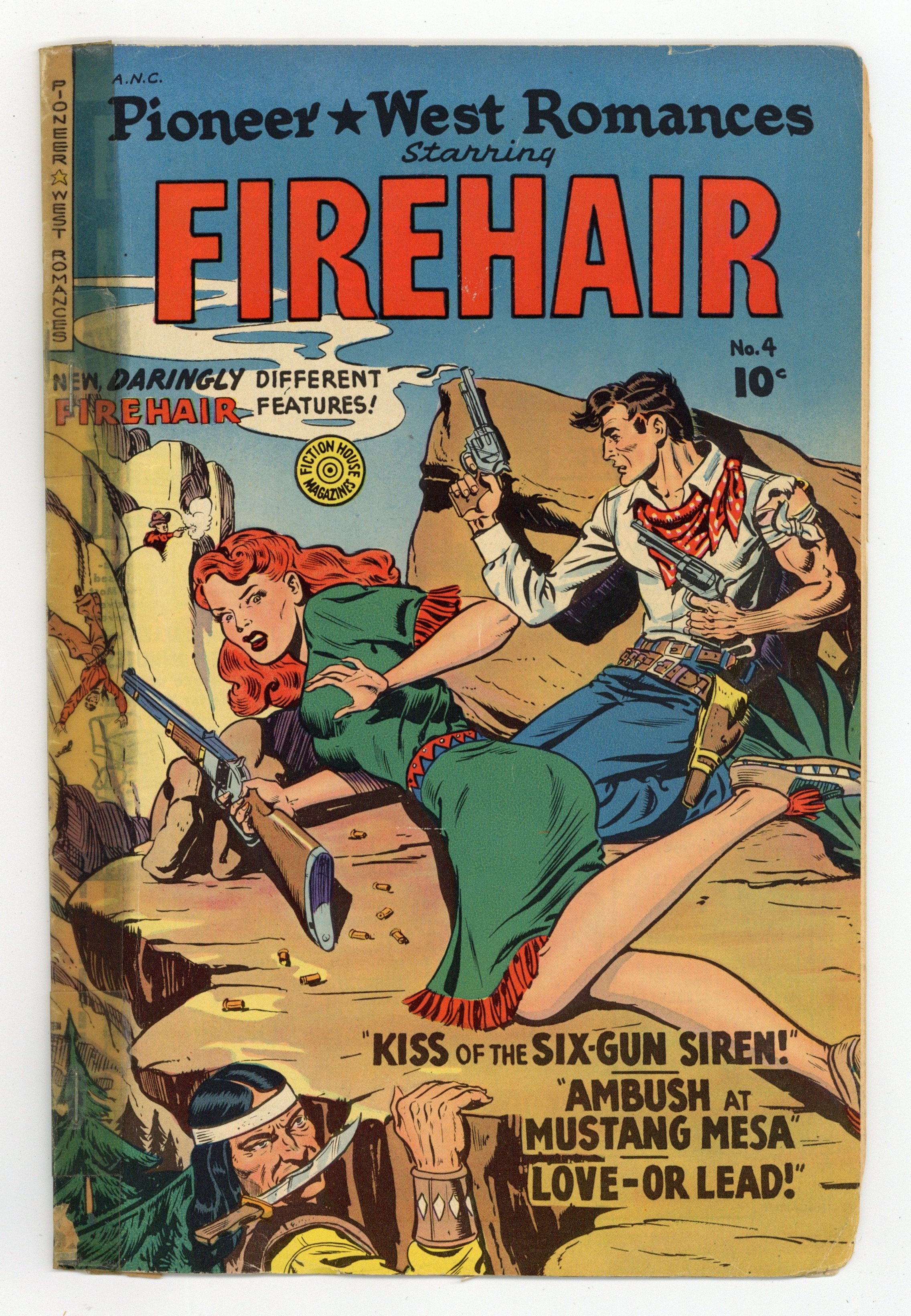 Stories by John Mitchell, credited as John Starr. Art by Robert Webb and David Heames. Cover by Jack Kamen. Adventures of the Western hero Firehair, a white woman raised by the Dakota tribe. A white man gets the Mandan tribe to dress as Dakotas for a stage robbery; Firehair intervenes when a prospector is tricked into digging in Dakota burial grounds; Crooked traders plan on muscling in on the fur-trade business. Kiss of the Six-Gun Siren; Ambush At Mustang Mesa; Love Or Lead. 32 pages, Full Color. Cover price $0.10.