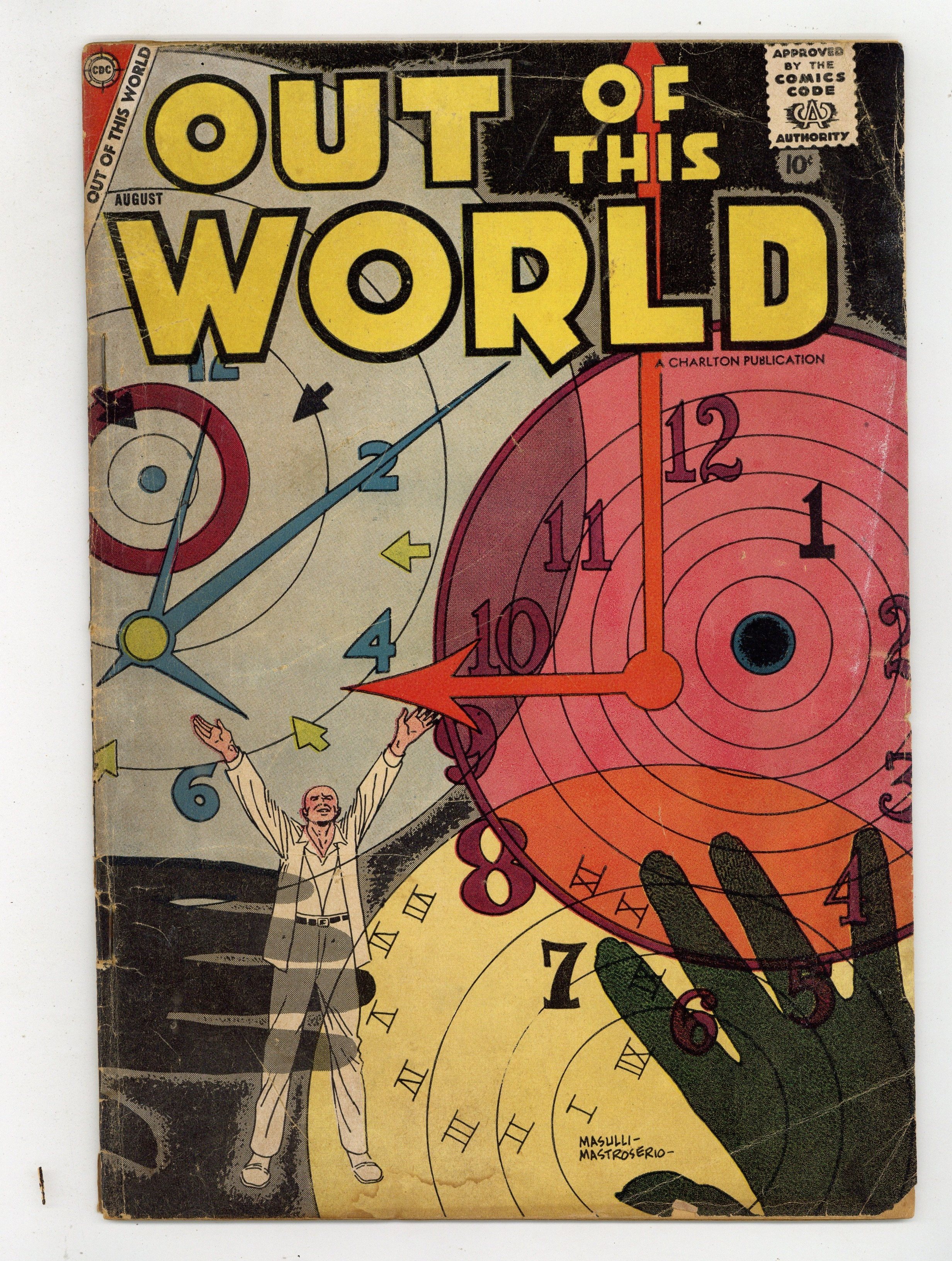 Cover by Steve Ditko. Stories and art by Steve Ditko, Bill Molno and Vince Alascia. Charlton responds to the new Comics Code with kid-friendly tales of science fiction, often illustrated by Steve Ditko or other future comics legends. A spy is a master of disguise, but there's one angle he's overlooked, in one of several stories in his issue with art by Spider-Man co-creator Steve Ditko. In another Ditko story, a sentient river rebels against human efforts to channel it. A scientist figures out how to save humanity by freezing it for a year with a designer pathogen. All Those Eyes; The Rivers Wrath; The Secret Room; Inside the Imagined Image; Plague; A Caveman Named Smith. 36 pages, Full Color. Cover price $0.10.
