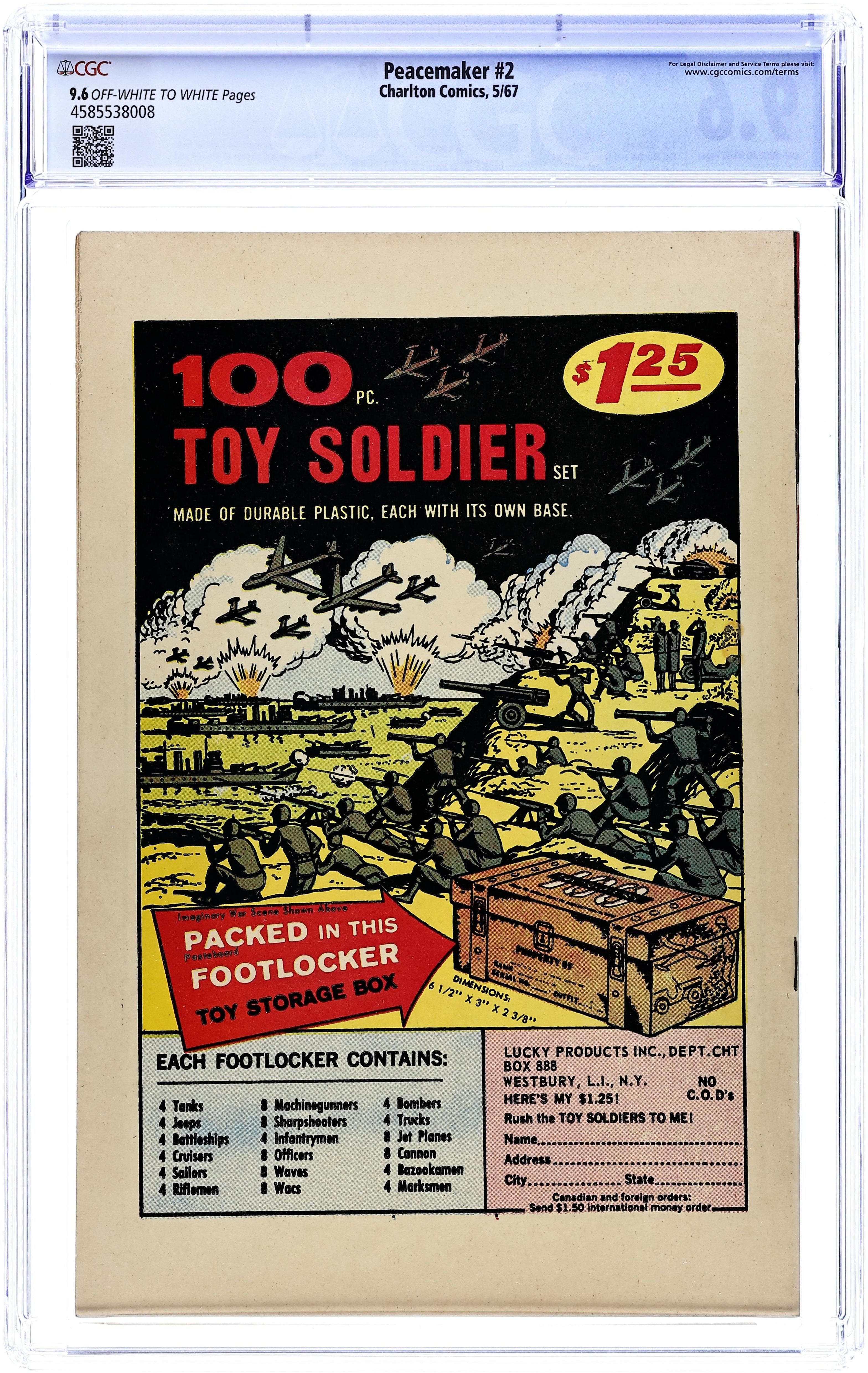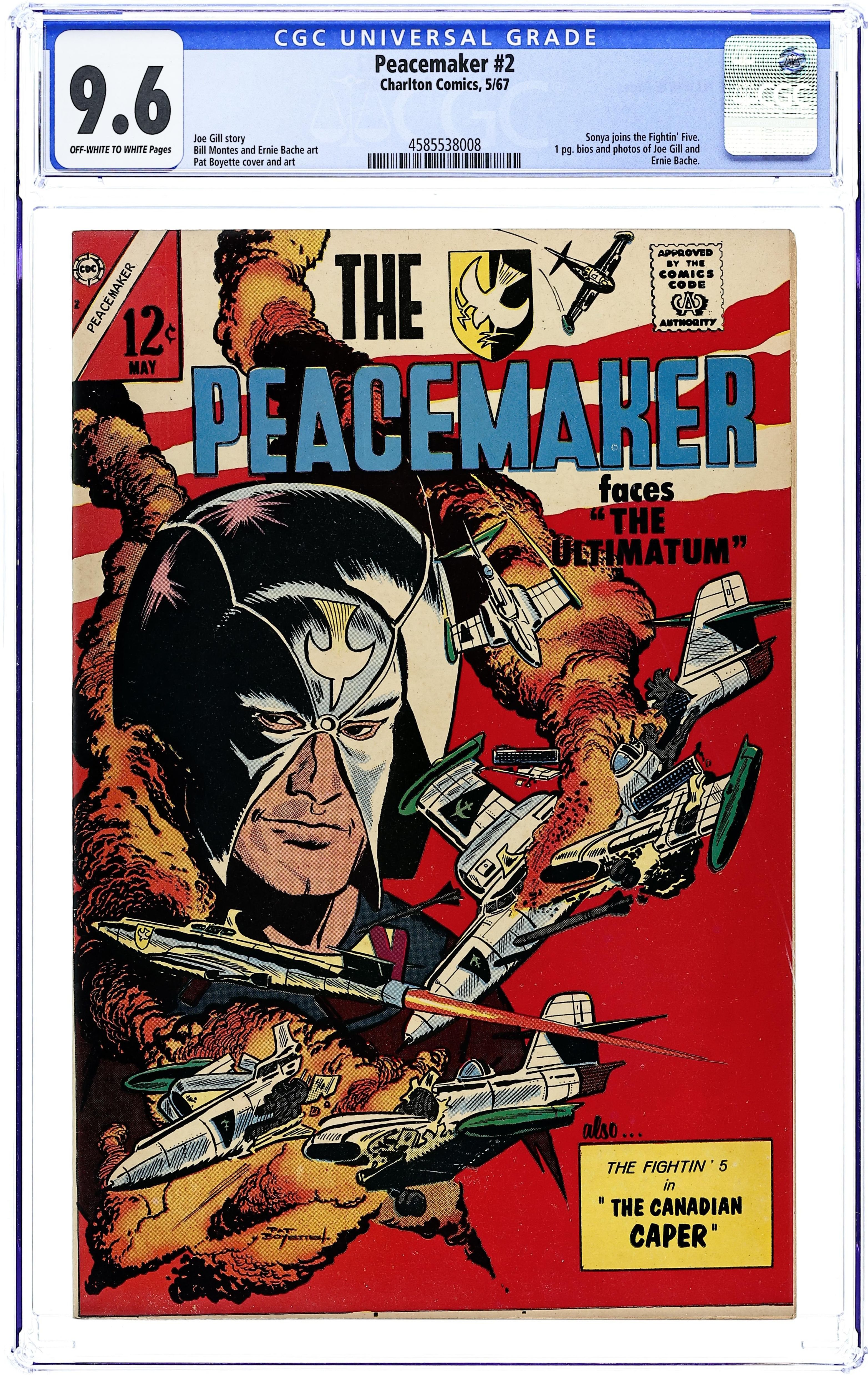 Cover art by Pat Boyette. The Survivors!, script by Joe Gill, art by Pat Boyette; Peacemaker stops a race of underground shape shifters from taking over the world. Peacemaker Patter article by Joe Gill, Ernie Bache; Dick Giordano; Writer Joe Gill and artist Ernie Bache write mini-bios of themselves, with accompanying Photographs. The Ultimatum, script by Joe Gill, art by Pat Boyette; Premier Gekk's army is stopped by Peacemaker. The Canadian Caper, script by Joe Gill, pencils by Bill Montes, script by Joe Gill, art by Bill Montes; The Fightin' 5 and their new female member travel to the Arctic to fight Russians. 36 pgs. $0.12. Cover price $0.12.