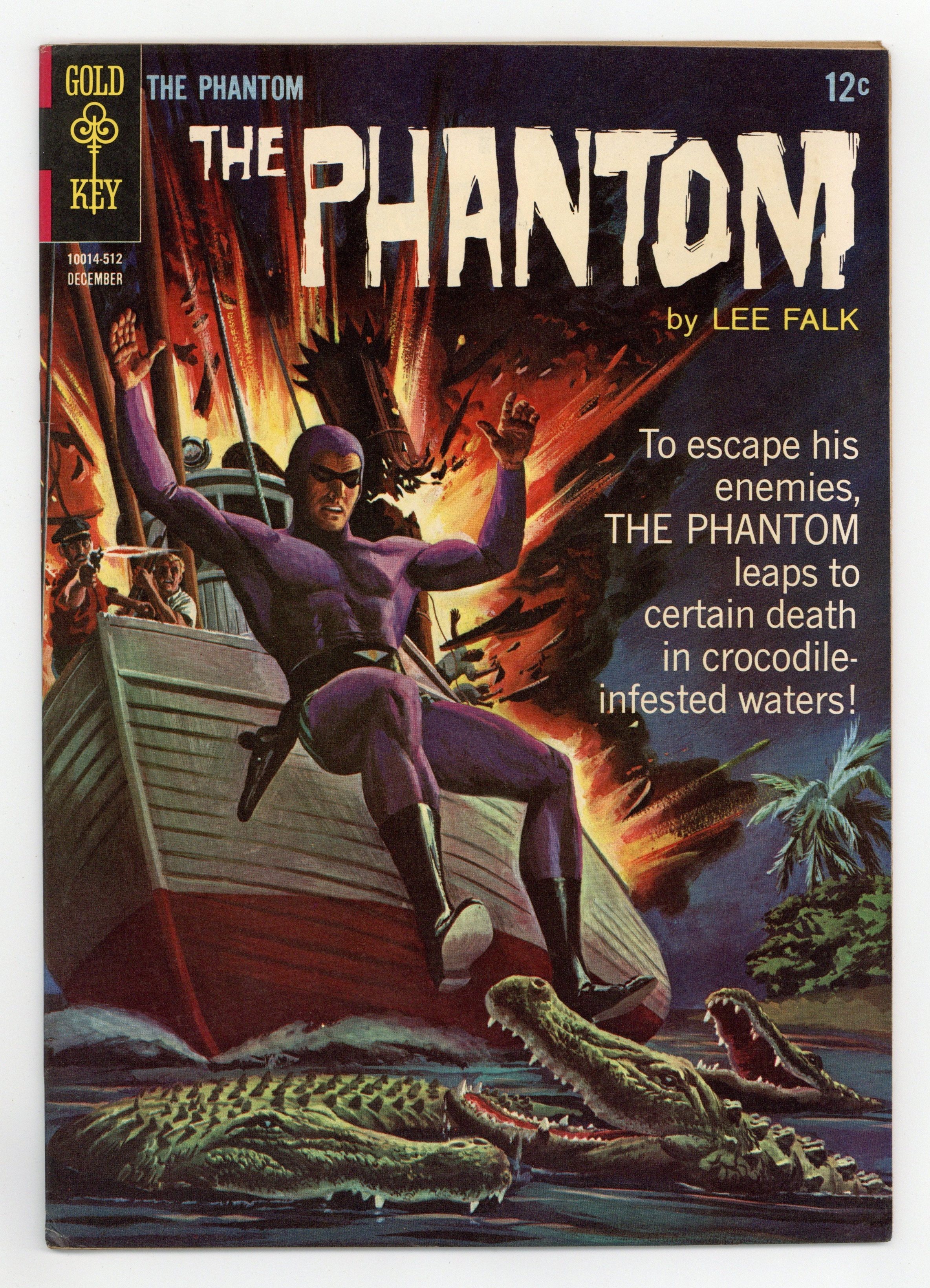 Painted cover art. "The Phantom Chronicles," script by Bill Harris, art by Bill Lignante; Rachamond tries to re-create crimes originally committed by his ancestor, including the theft of the crown of Tibet from a Himalayan lamasery; As the 13th Phantom fought Rachamond's ancestor, so the "current," 16th Phantom pursues Rachamond, who is killed in their struggle when he falls on his own knife. Cheerios ad featuring Rocky and Bullwinkle. "The Legend of the Diamond Crocodile," art by Bill Lignante; Track Hunter and Oloo investigate reports of a diamond-studded crocodile; Tracking the beast to its lair, they discover that it rolls in diamonds. Advertisement for Phantom Revell model kit on inside front cover. # on cover 10014-508 August. #13 8/65. 36 pgs., full color. Cover price $0.12.