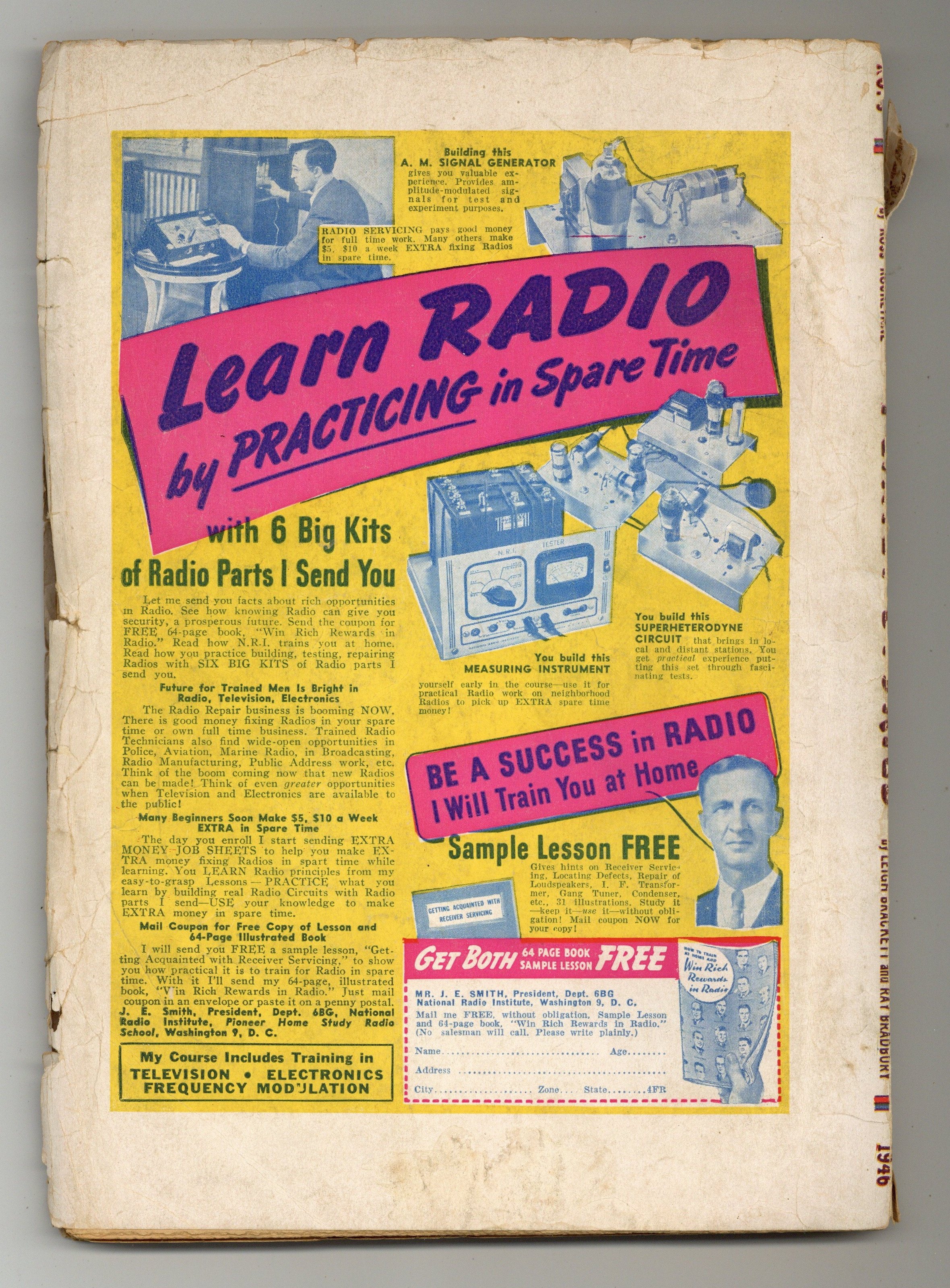 Cover by Mort Leav. Stories and art by Richard Burdick, Bruce Elliot, Mort Leav, Carl Wessler, George Harrison, Theresa Szenics and Maurice Del Bourgo. Teen comedy with Patches and his friends getting up to wholesome mischief. Patches and Tubby try to become romantic balladeers after all the girls fall for Frank Sinatra, or in the Patches-verse, "Lank Sonora." A short article predicting a huge growth in television in the years 1946-1956, including color television, 3-D television and television-phones. A profile of comedian and actor Danny Kaye. The Voice; Danny Kaye - The Kid from Brooklyn; Television in Tomorrow's World; Touchdown Tubby; Rainbow's End; Beware of the Trap!; Teenage Tycoon; Short Order Success. 48 pages, Full Color. Cover price $0.10.