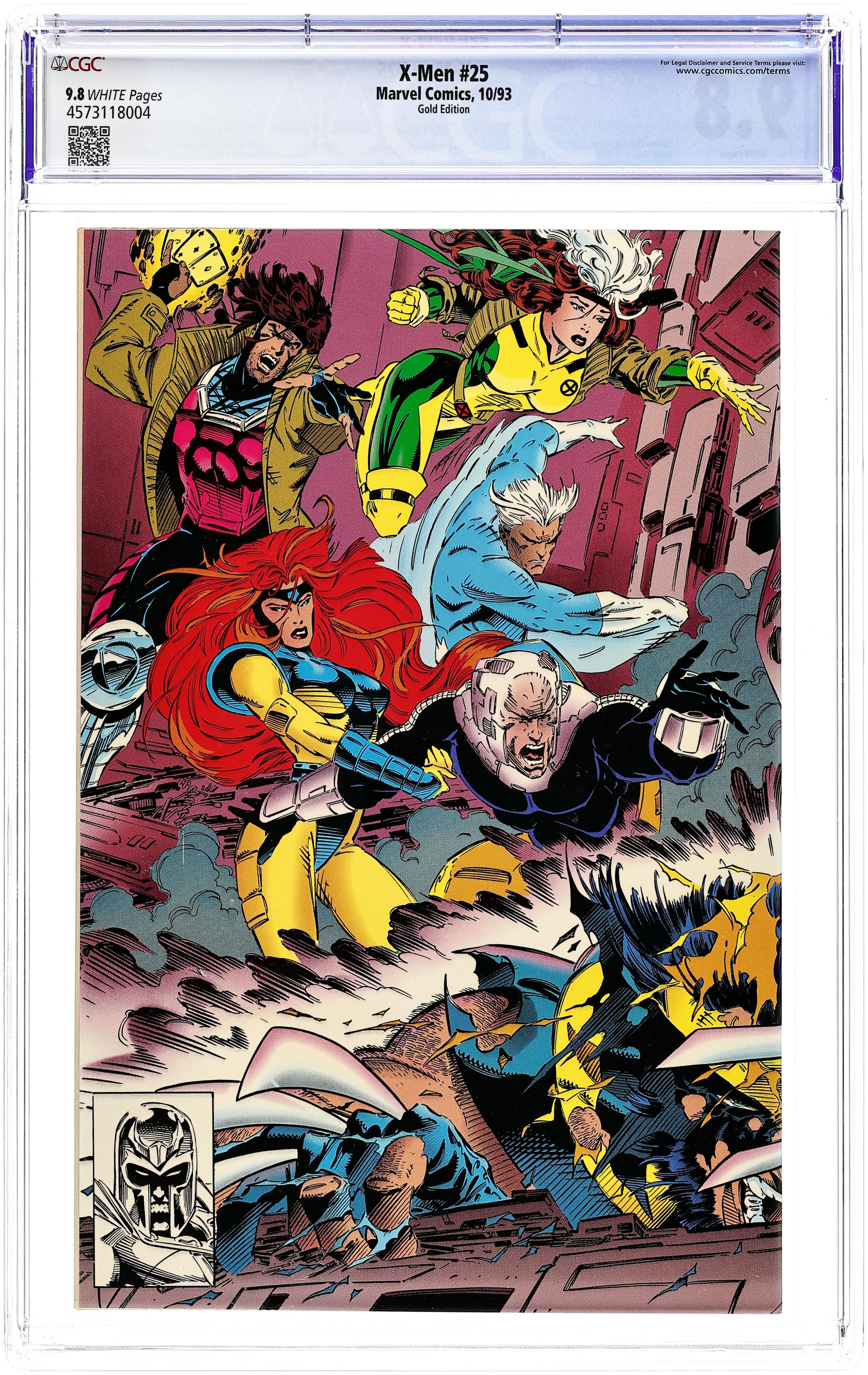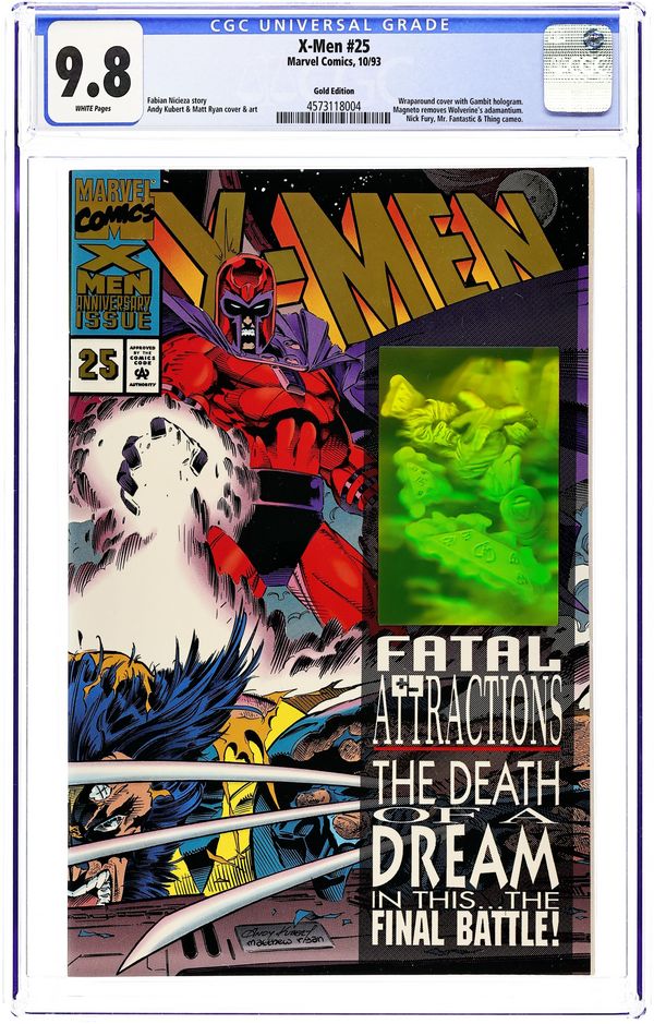 Gold Edition with a gold "25" in the upper left hand of cover. 52-page giant; Gambit hologram cover. Magneto pulls the adamantium out of Wolverine's body in this issue. Andy Kubert art. Fatal Attractions part 4 of 6: "Dreams Fade." Script by Fabian Nicieza, pencils by Andy Kubert, inks by Matthew Ryan. Cameos by the Thing and Mr. Fantastic (of the Fantastic Four) and Nick Fury. Kubert/Ryan wraparound cover. No cover price. Cover price $3.50.